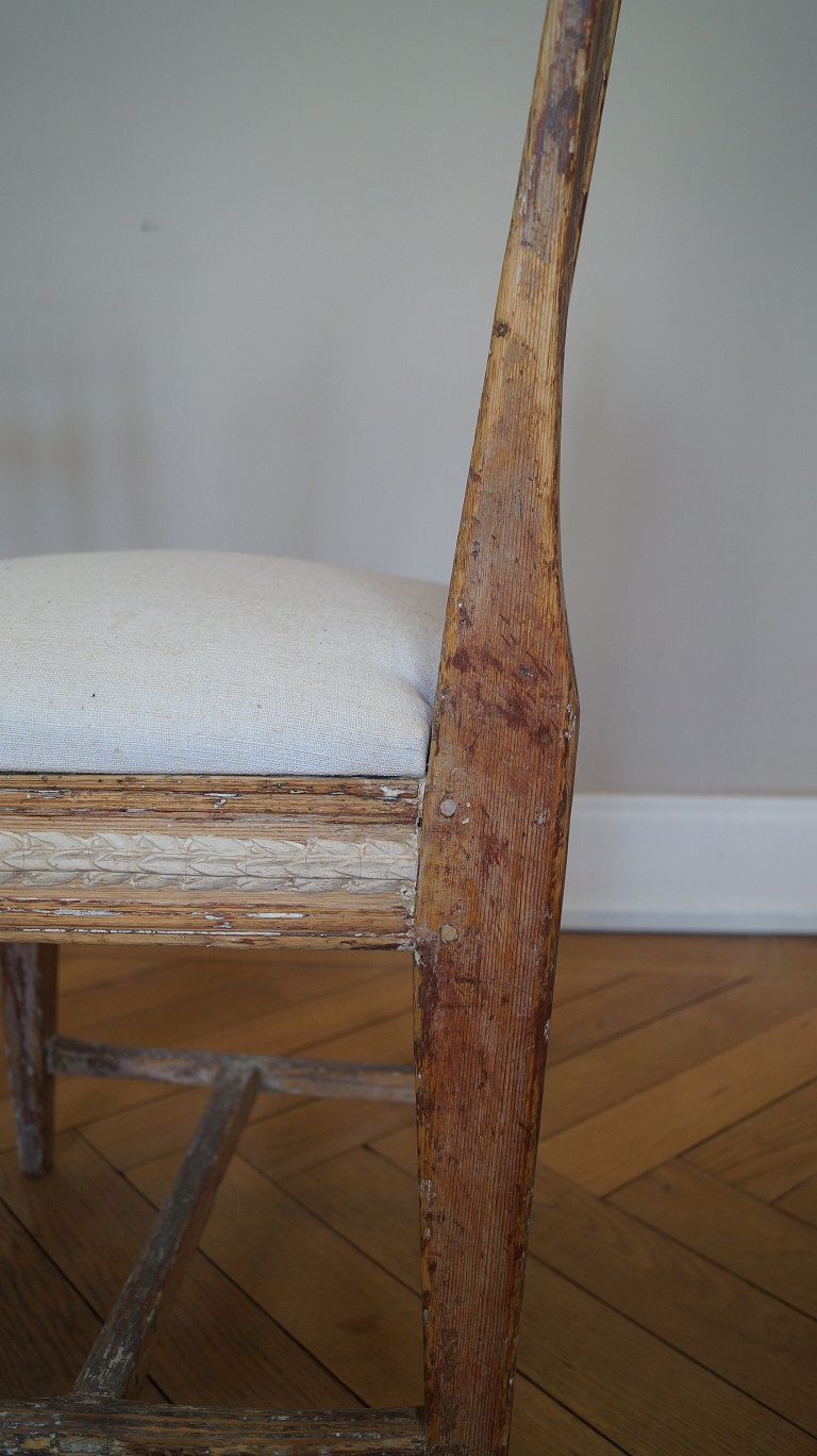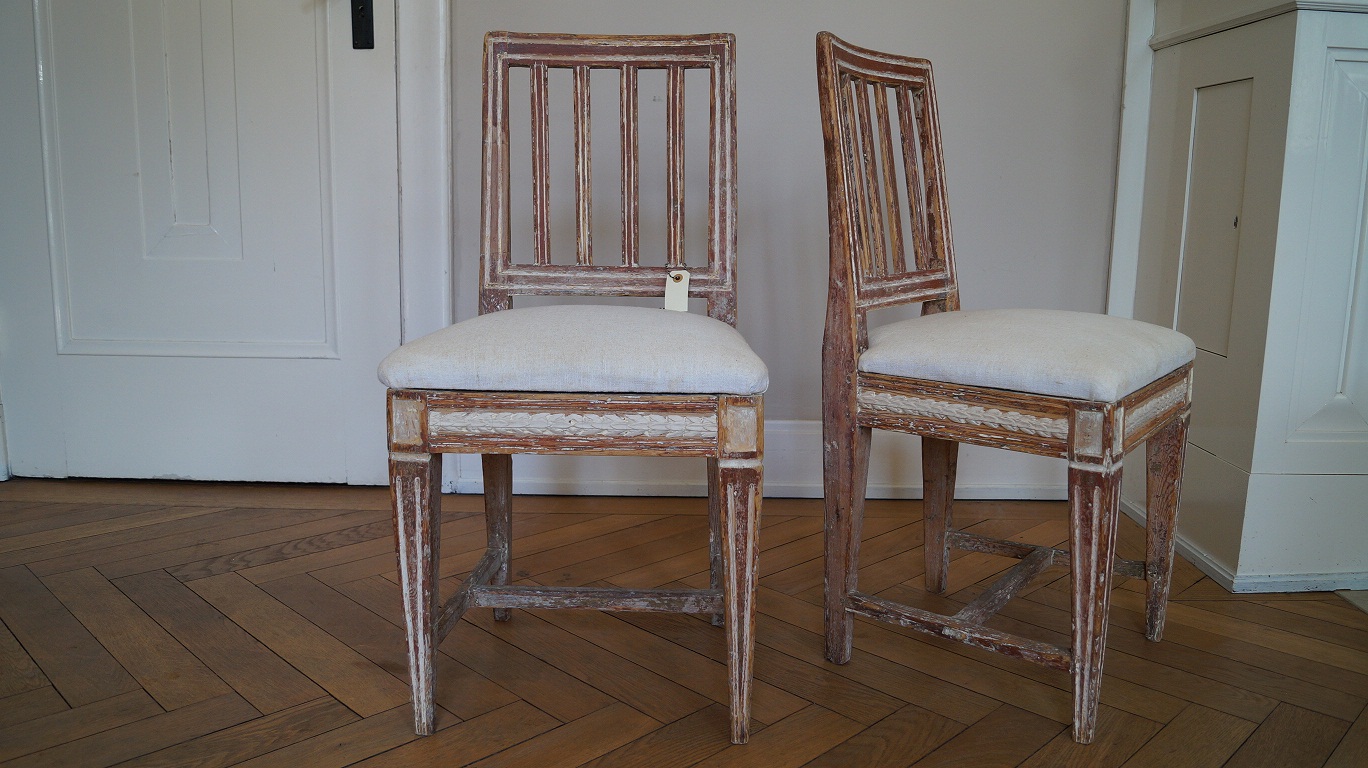 A very rare pair of painted chairs from the gustavian period made in Stockholm around 1795. The leafmoldings made of plaster and glue are original and typical for the chairmaker master Ephraim Stahl who developed that type of moldings in the late 18th Century. This pair is absolute unique !