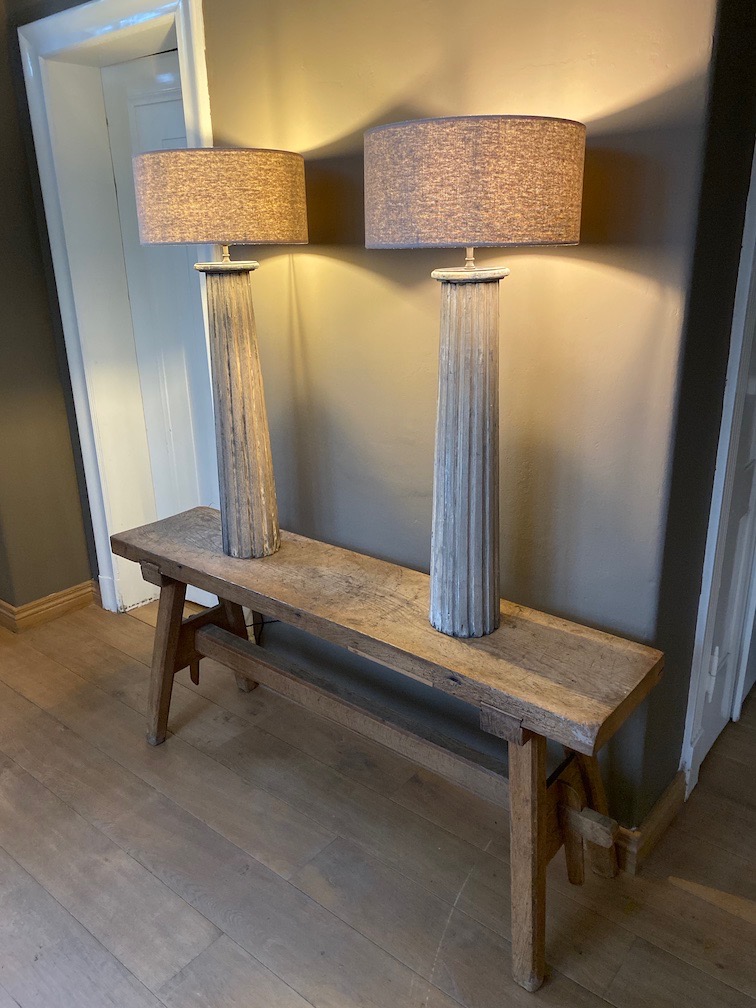Beautiful pair of wooden lamps made of 19th century turned and fluted coloums. All lamp parts are in handpatinated solid brass. The lamps comes with fabric safety cable.