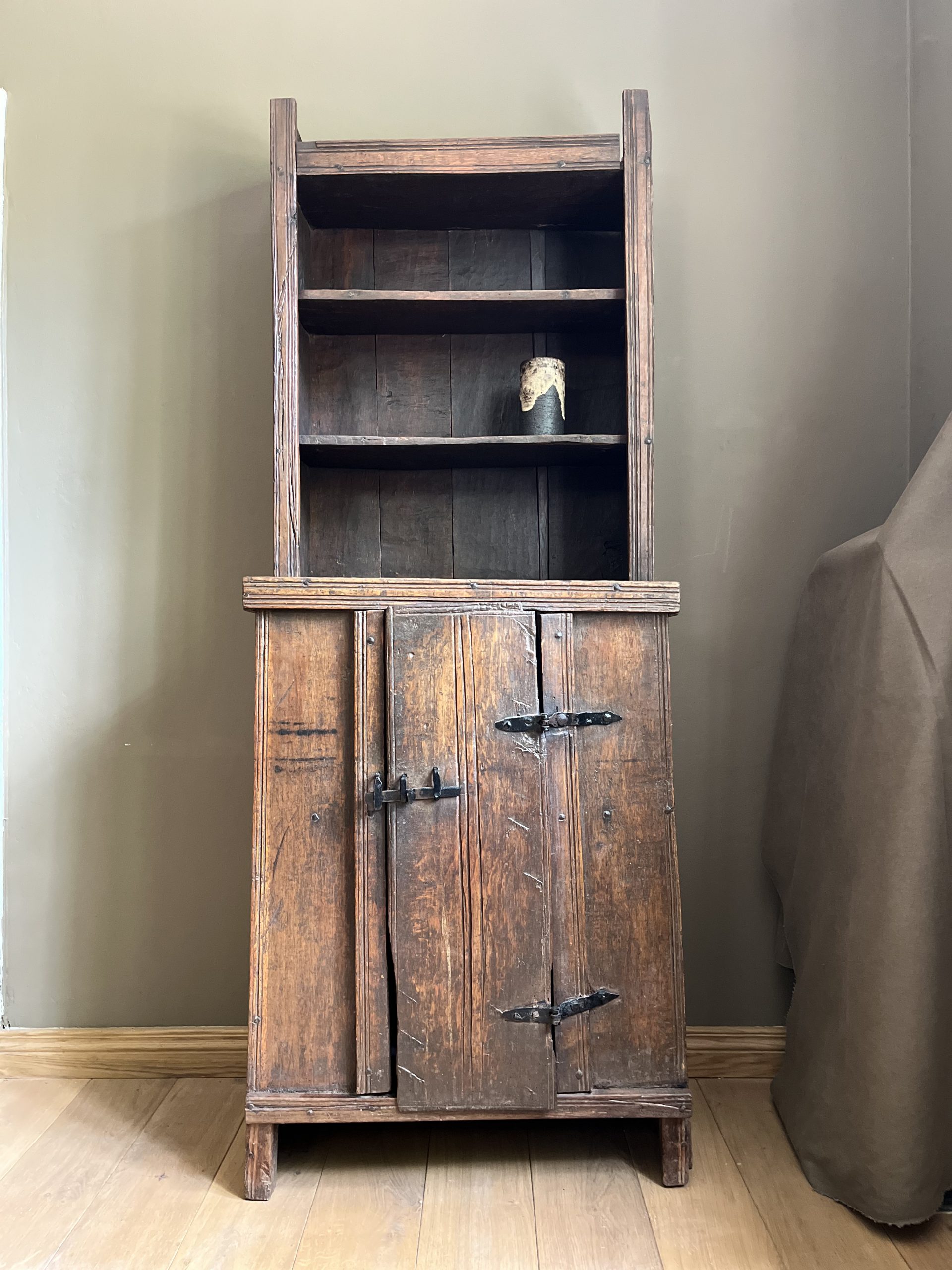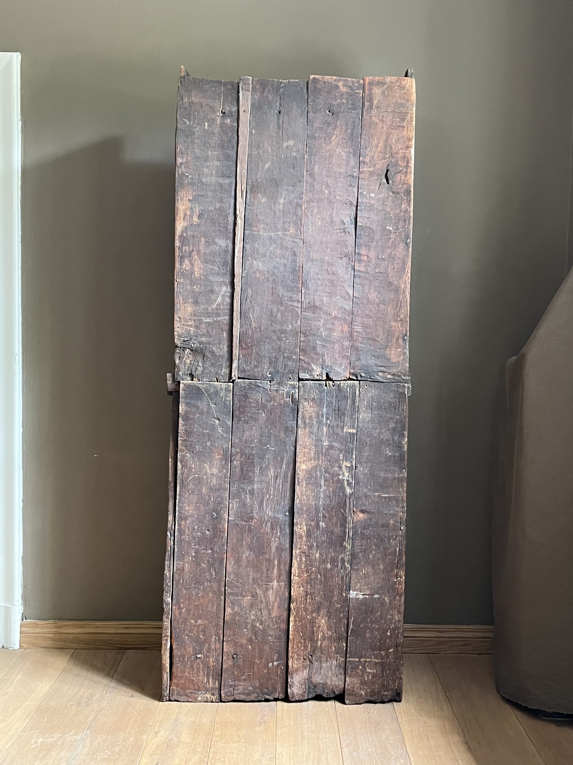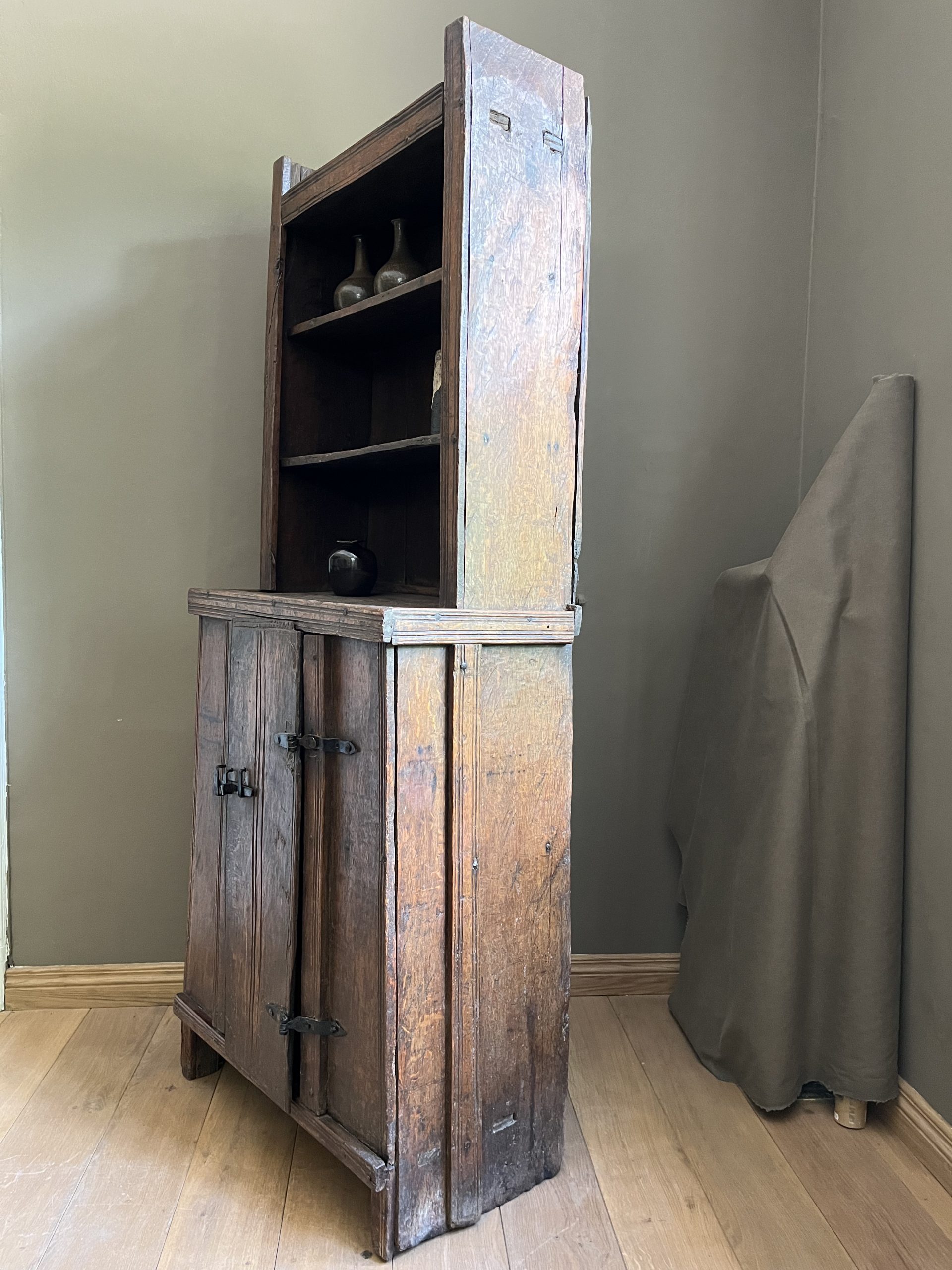 Very early oak cabinet from the Renaissance period.The oak planks were hewn with an axe. This beautiful piece was made in a primitive way in the early 17th century. The cabinet is in surprisingly good condition for its age and has a strong yet timeless appeal.