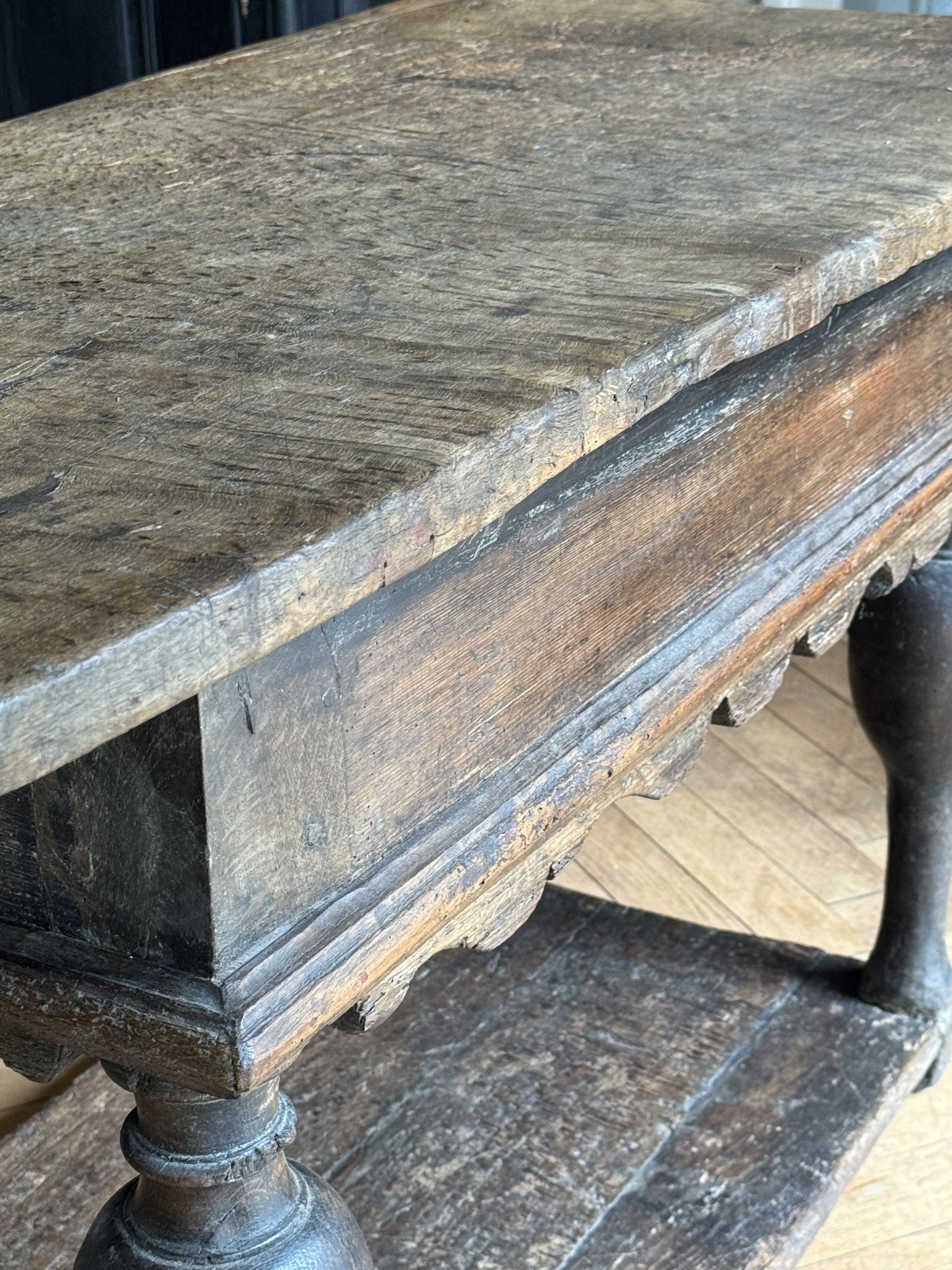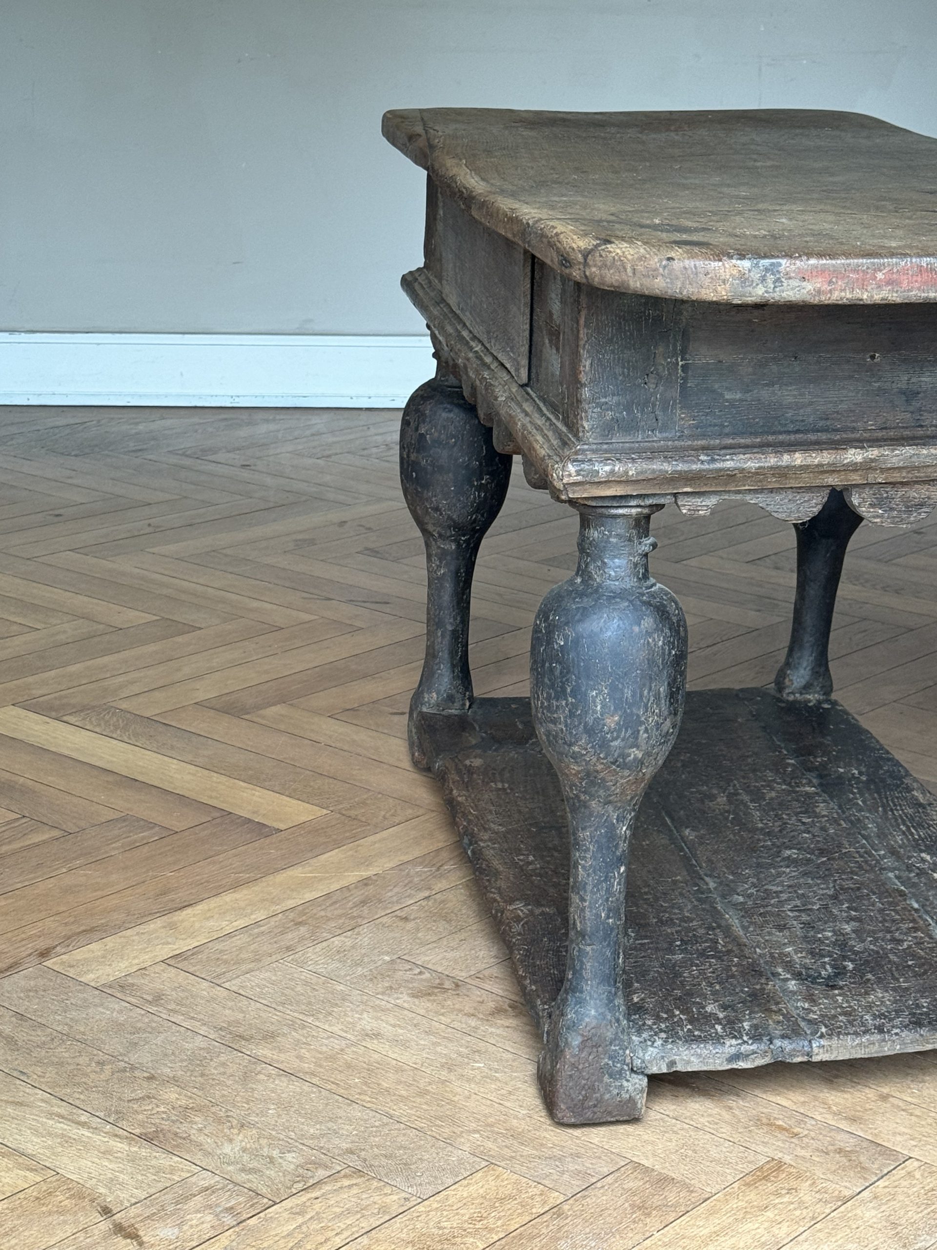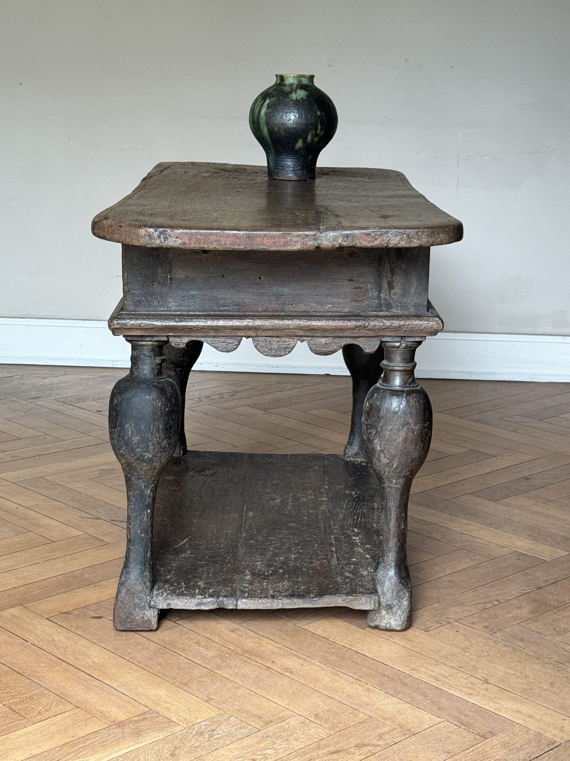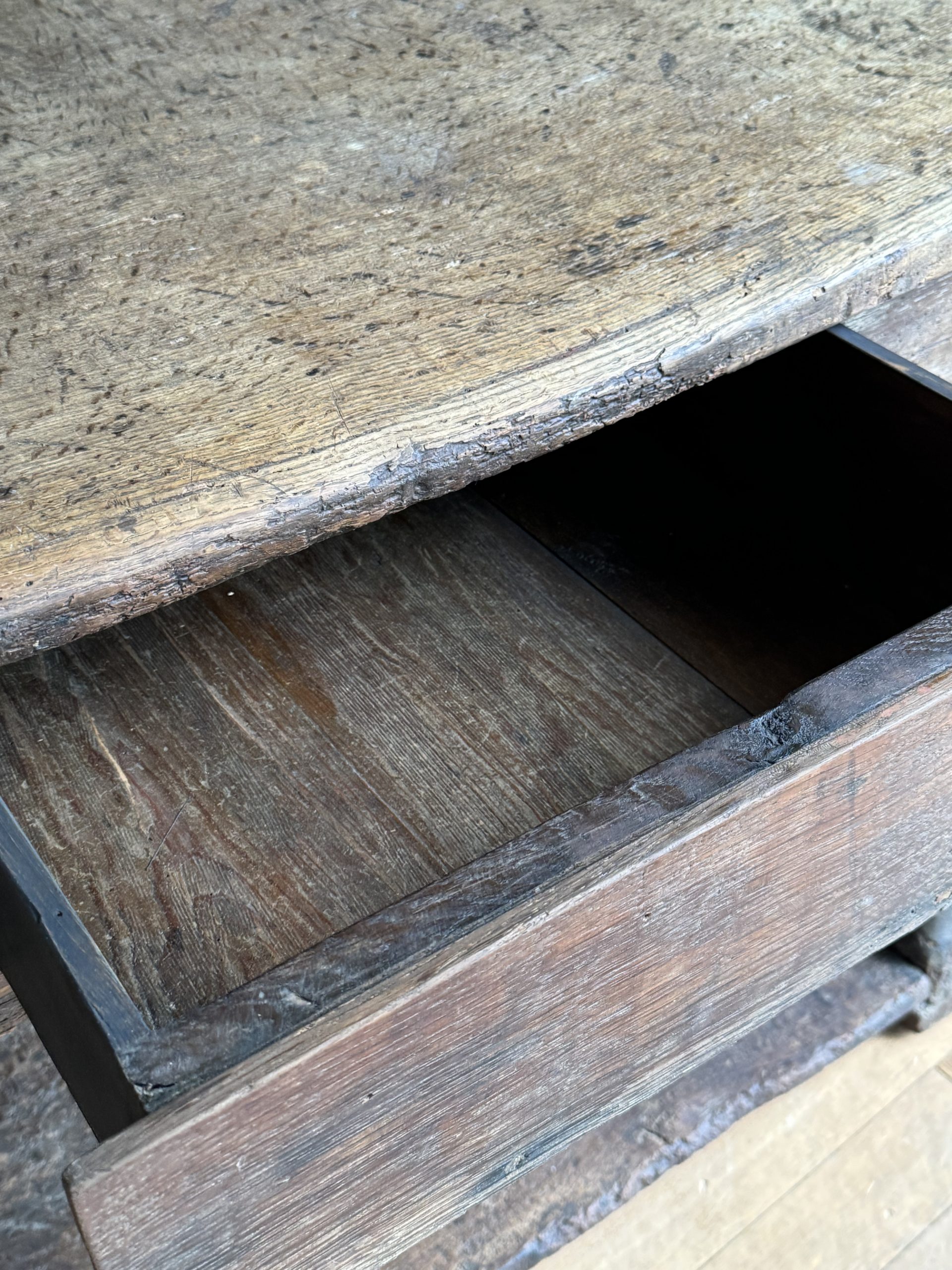 Stunning 17th Century oak table with amazing historic patina and color. The tabletop was made of one piece of oak. 1 drawer at on the front. A rare beauty with perfect dimensions.