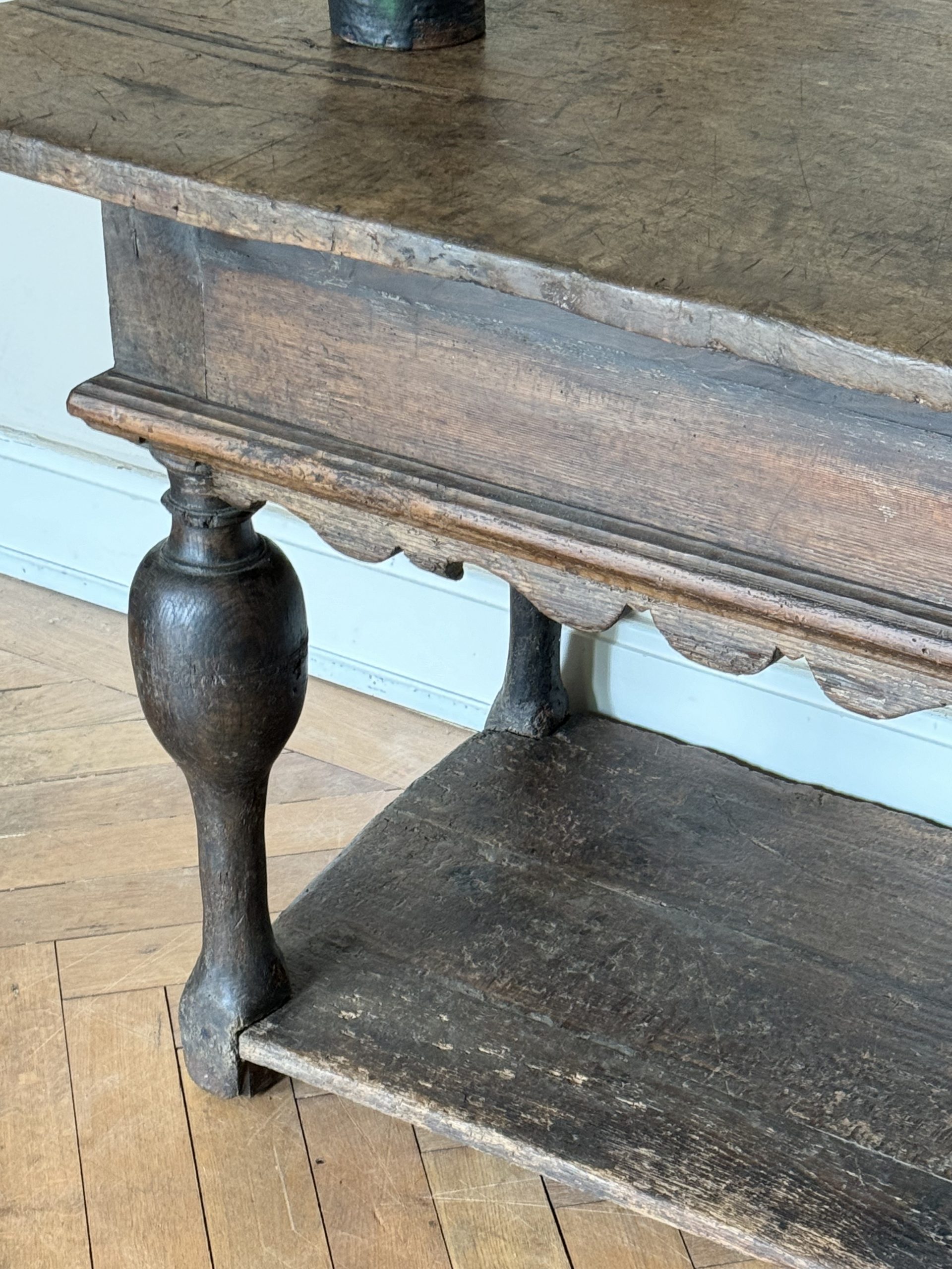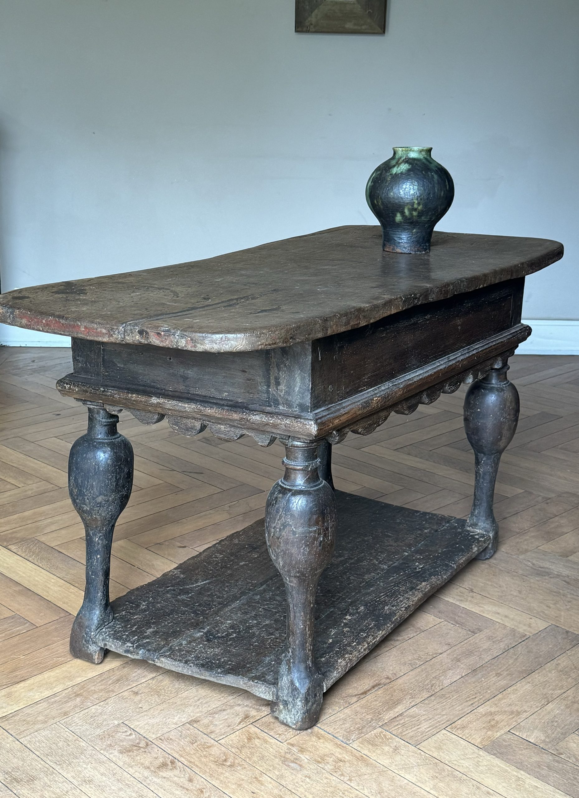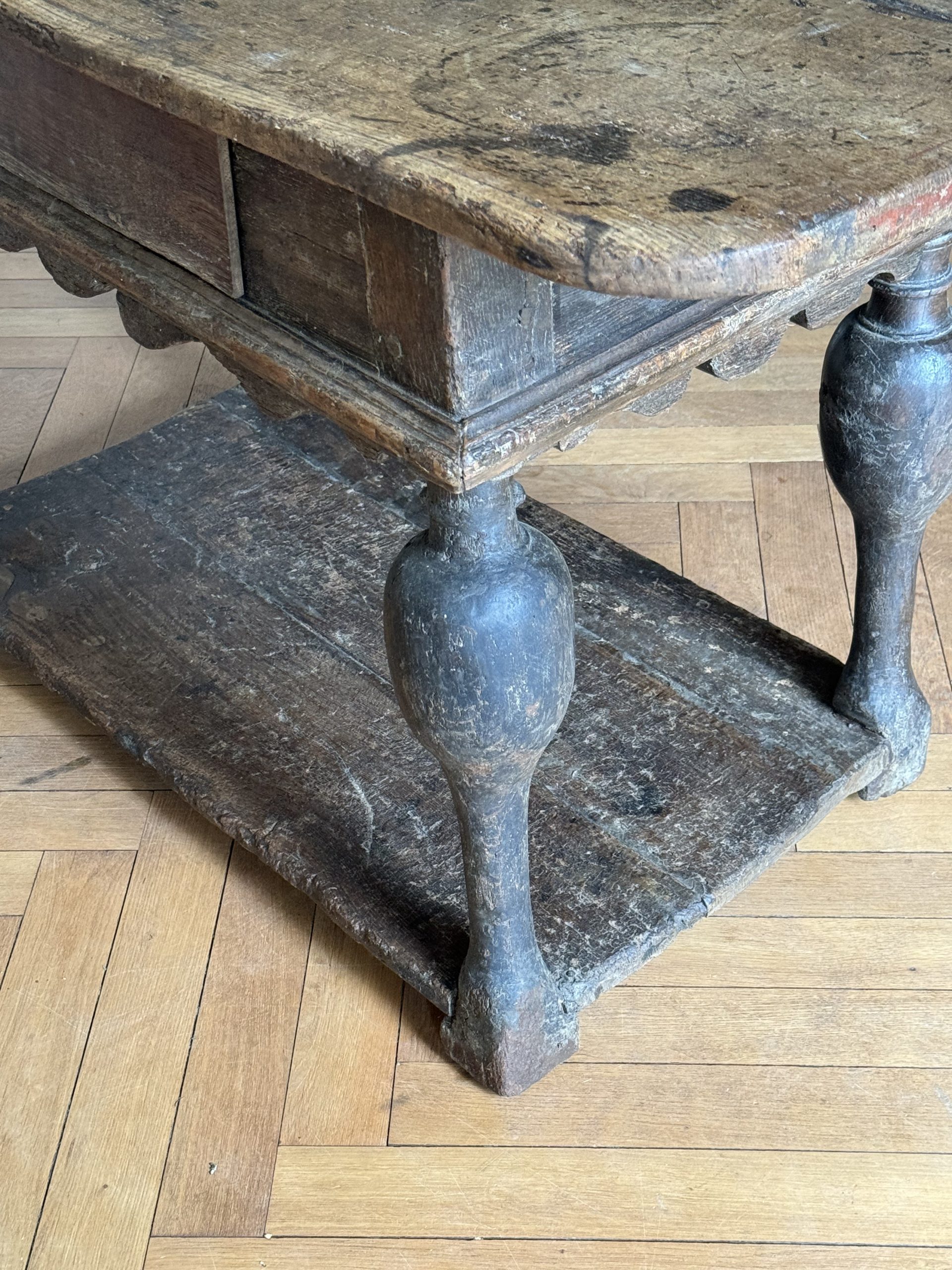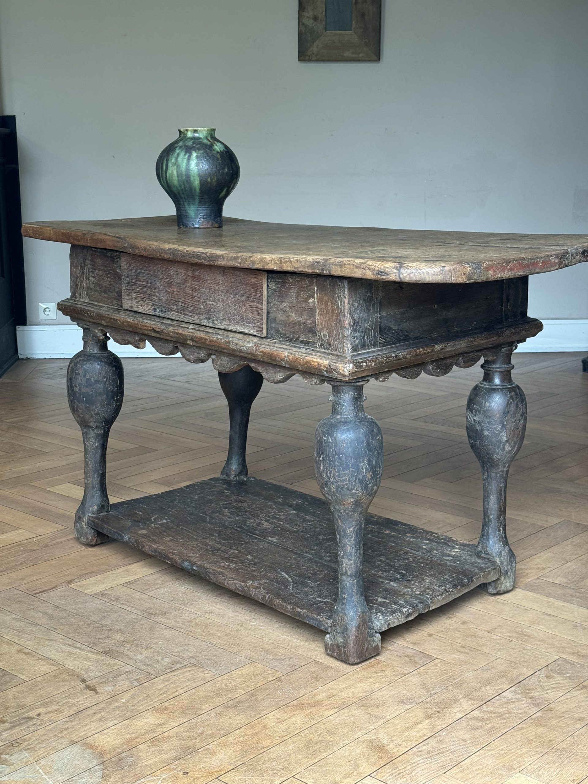 Stunning 17th Century oak table with amazing historic patina and color. The tabletop was made of one piece of oak. 1 drawer at on the front. A rare beauty with perfect dimensions.