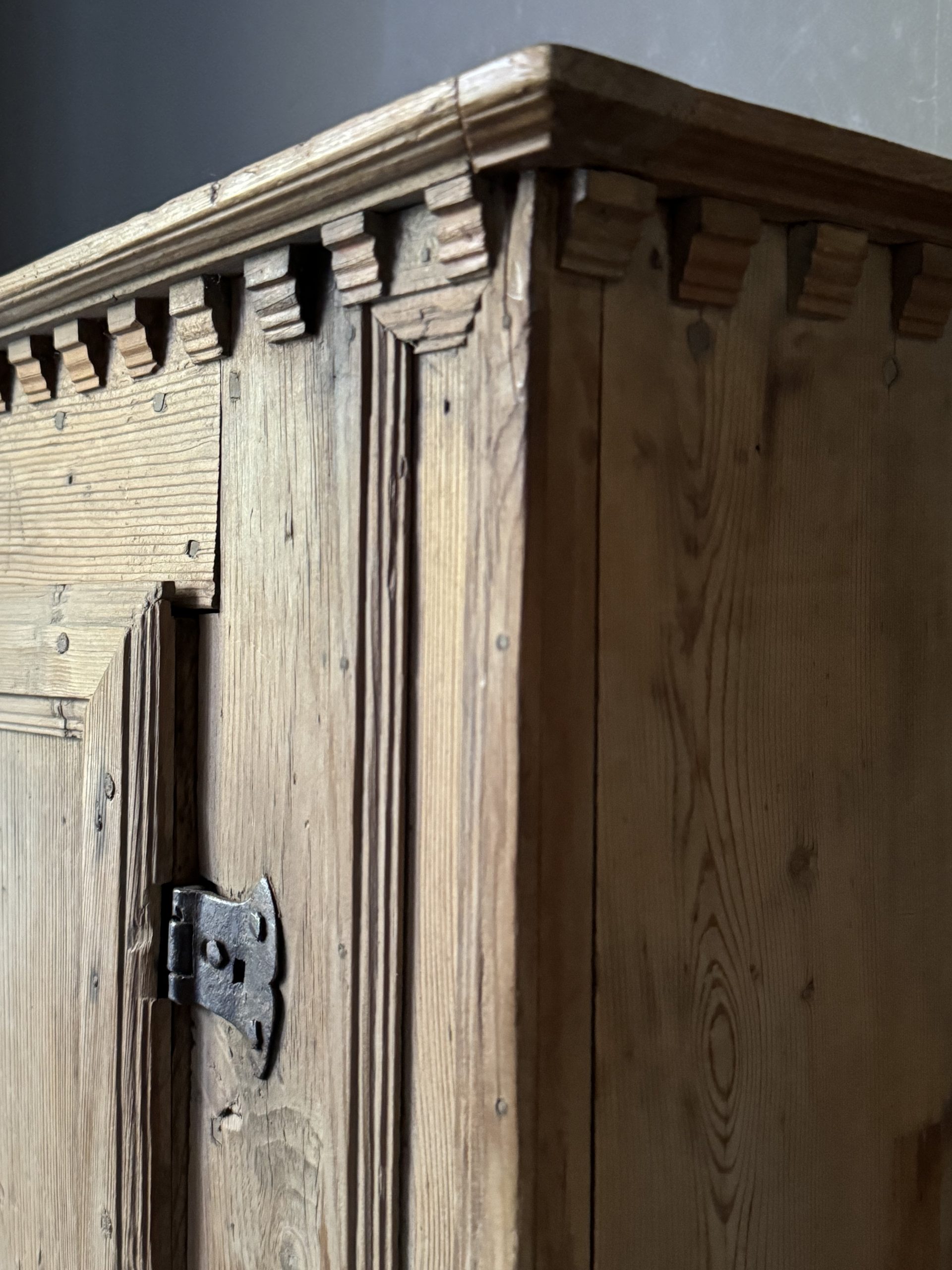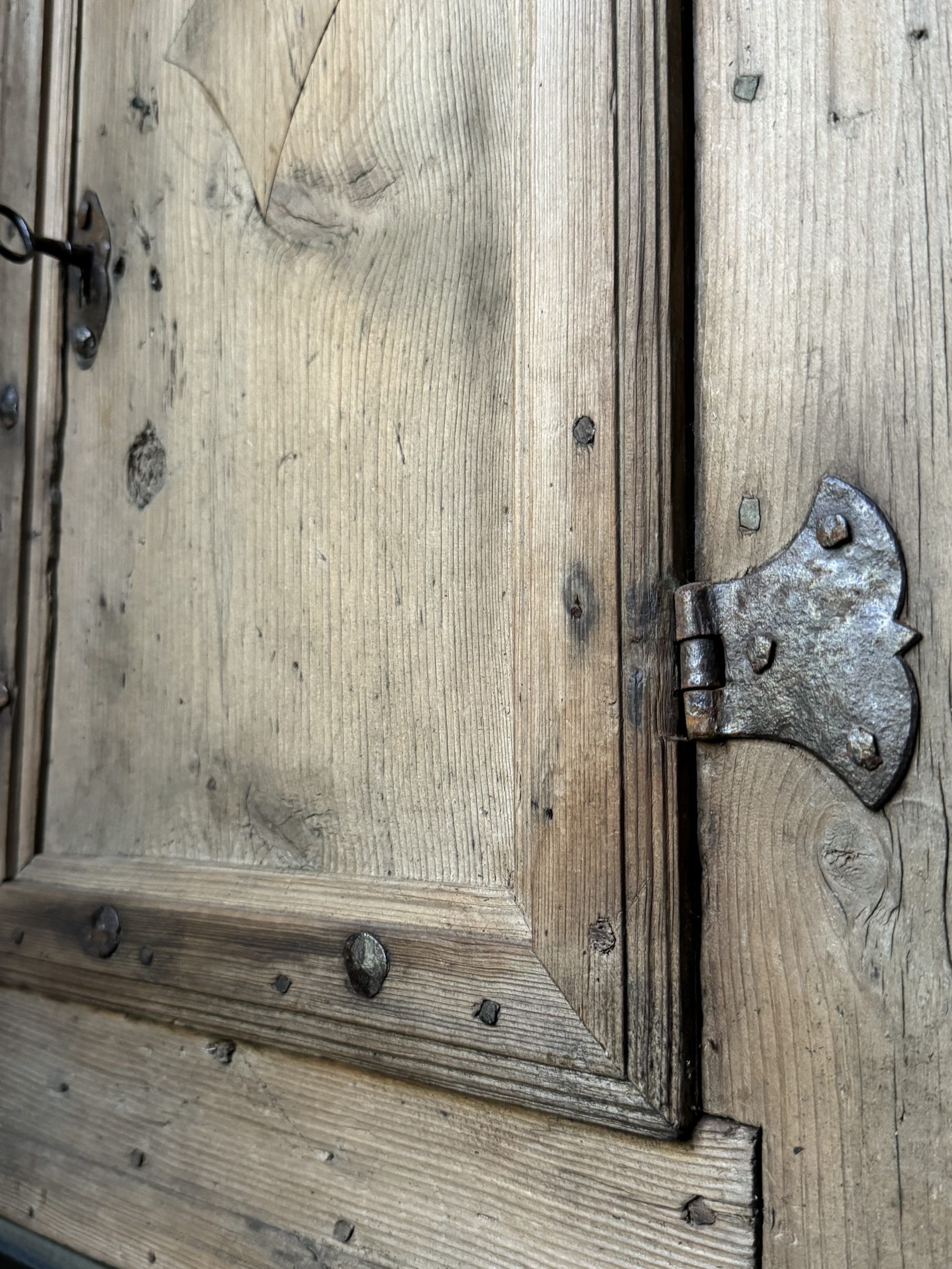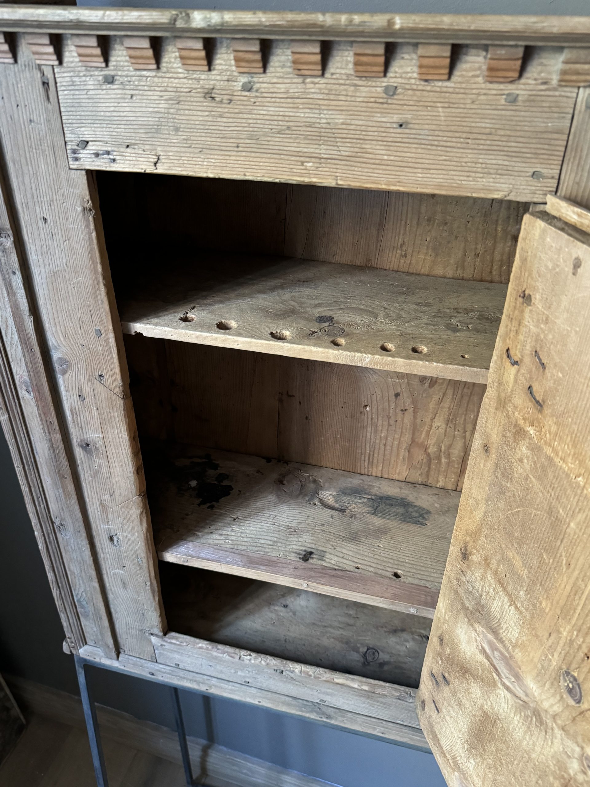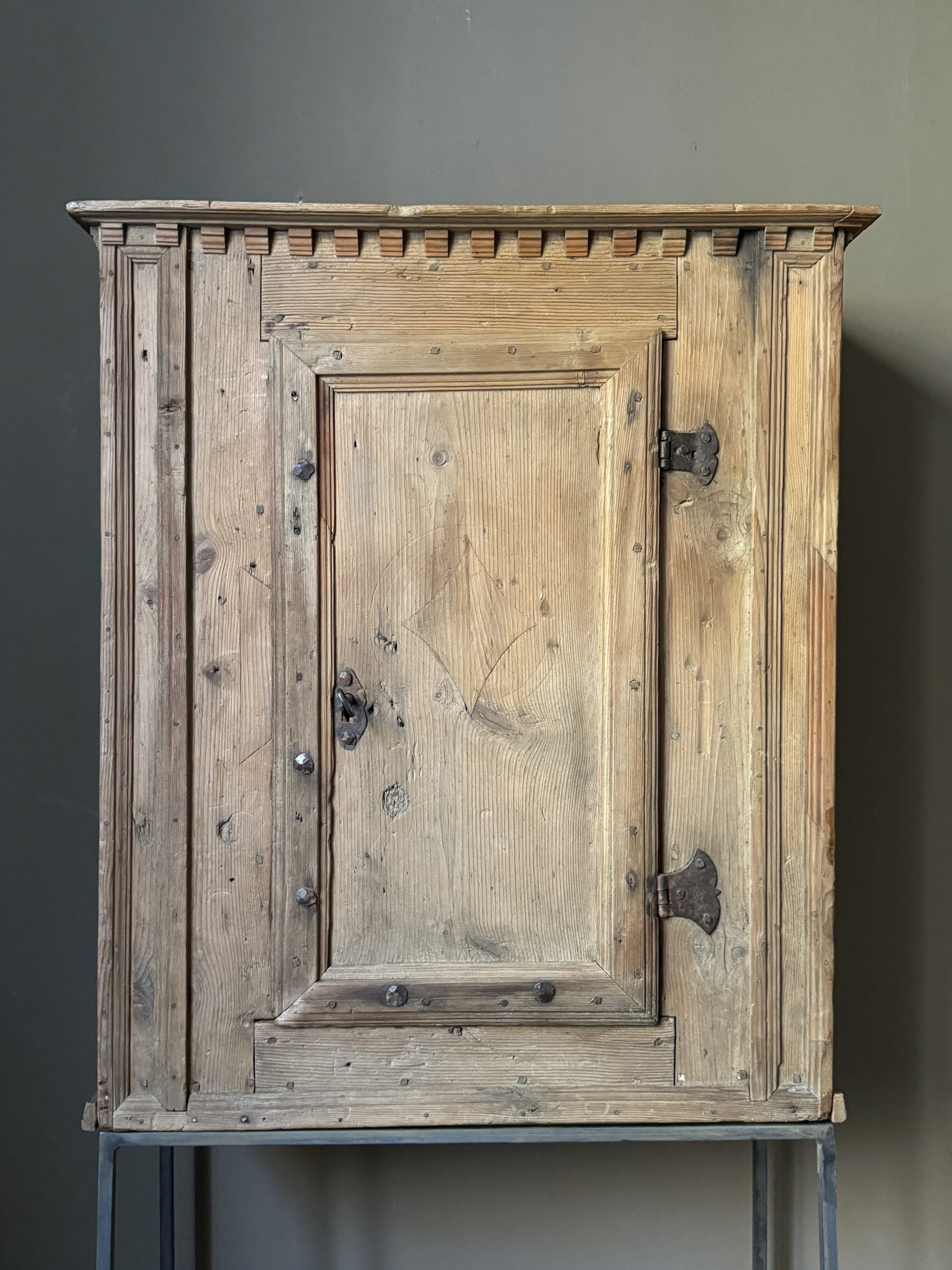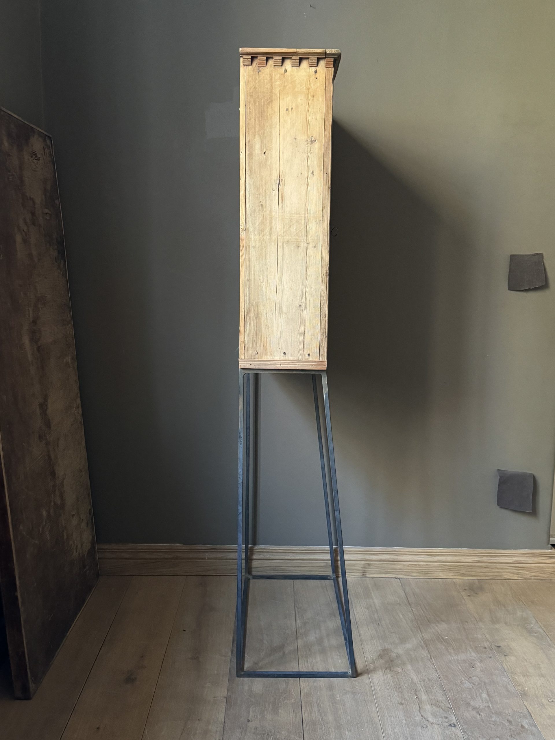 Small Mountain cabinet with lovely metalwork and patina on modern conical iron frame.