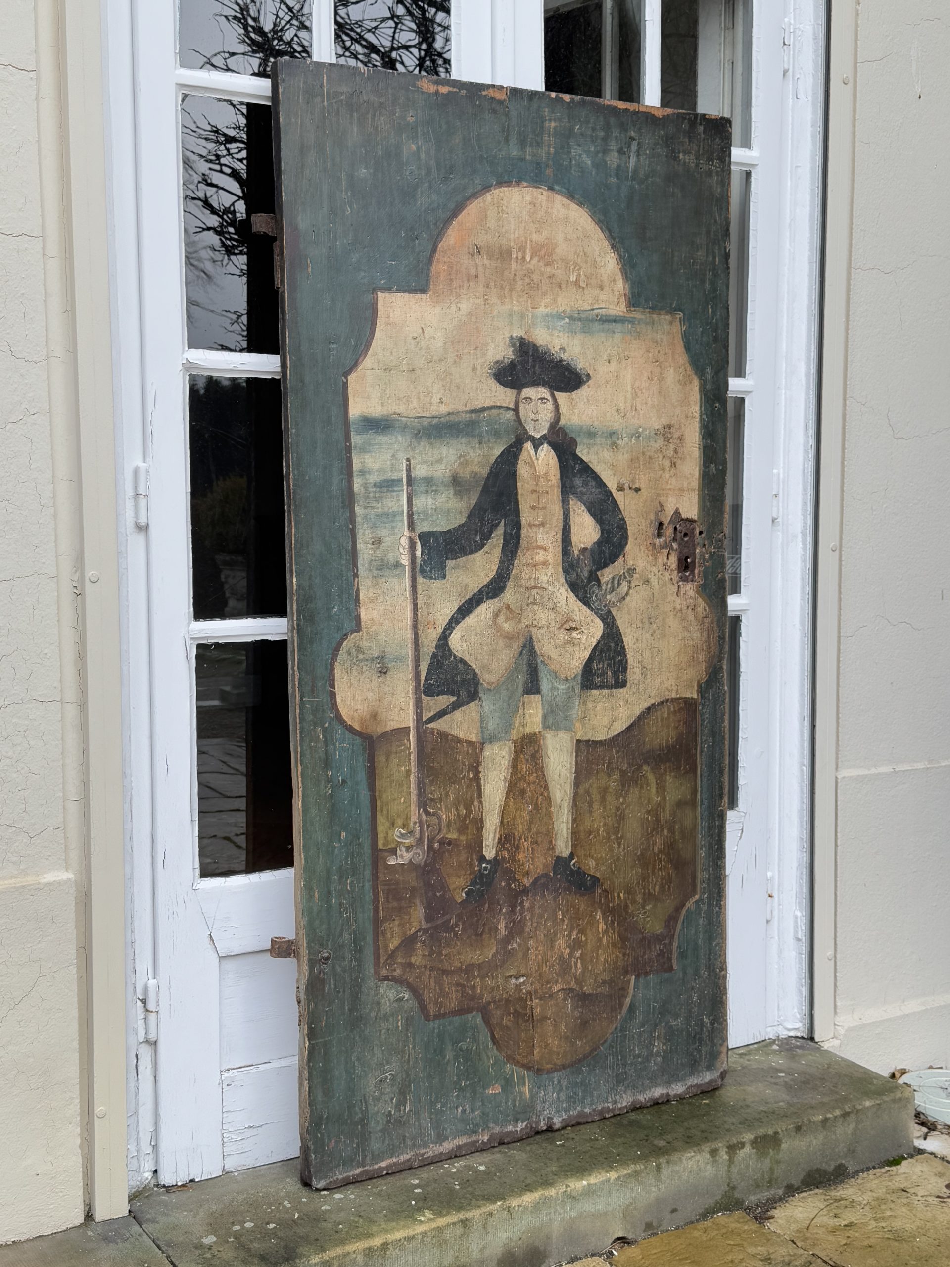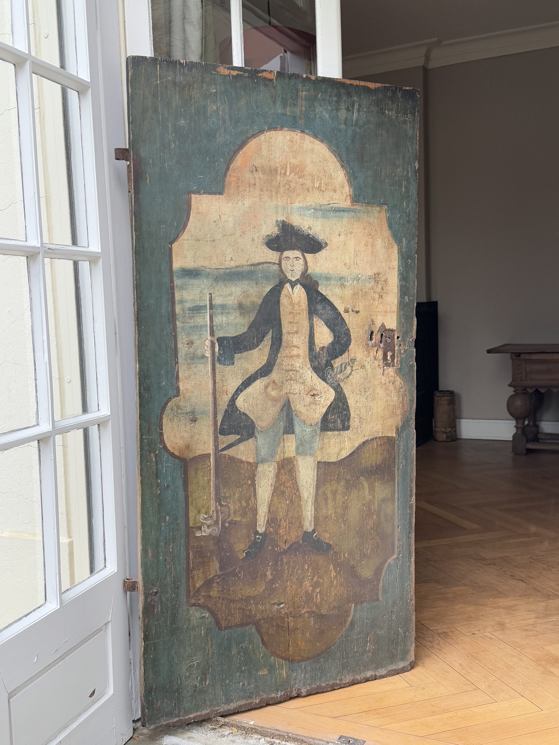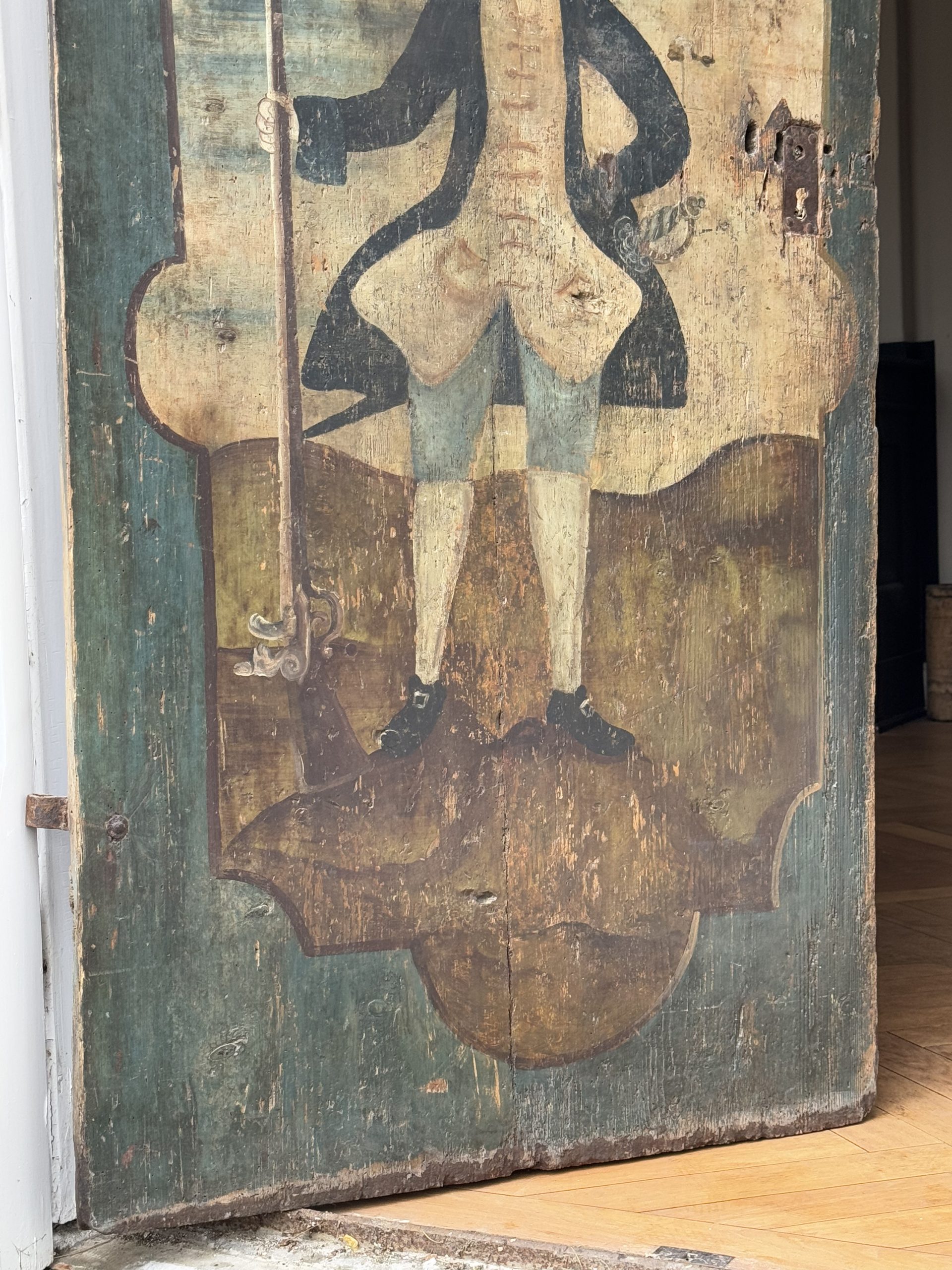 NEW ARRIVALS Painted Baroque Door From Around 1750 Rare 18th Century painted door. Soldier on top of the mountains. Lovely to build into a house or hang on the wall.hight 172,5 cm (67,91 in)depth 3,5 / 5,5 cm (1,37 in / 2,16 in)please contact for further info