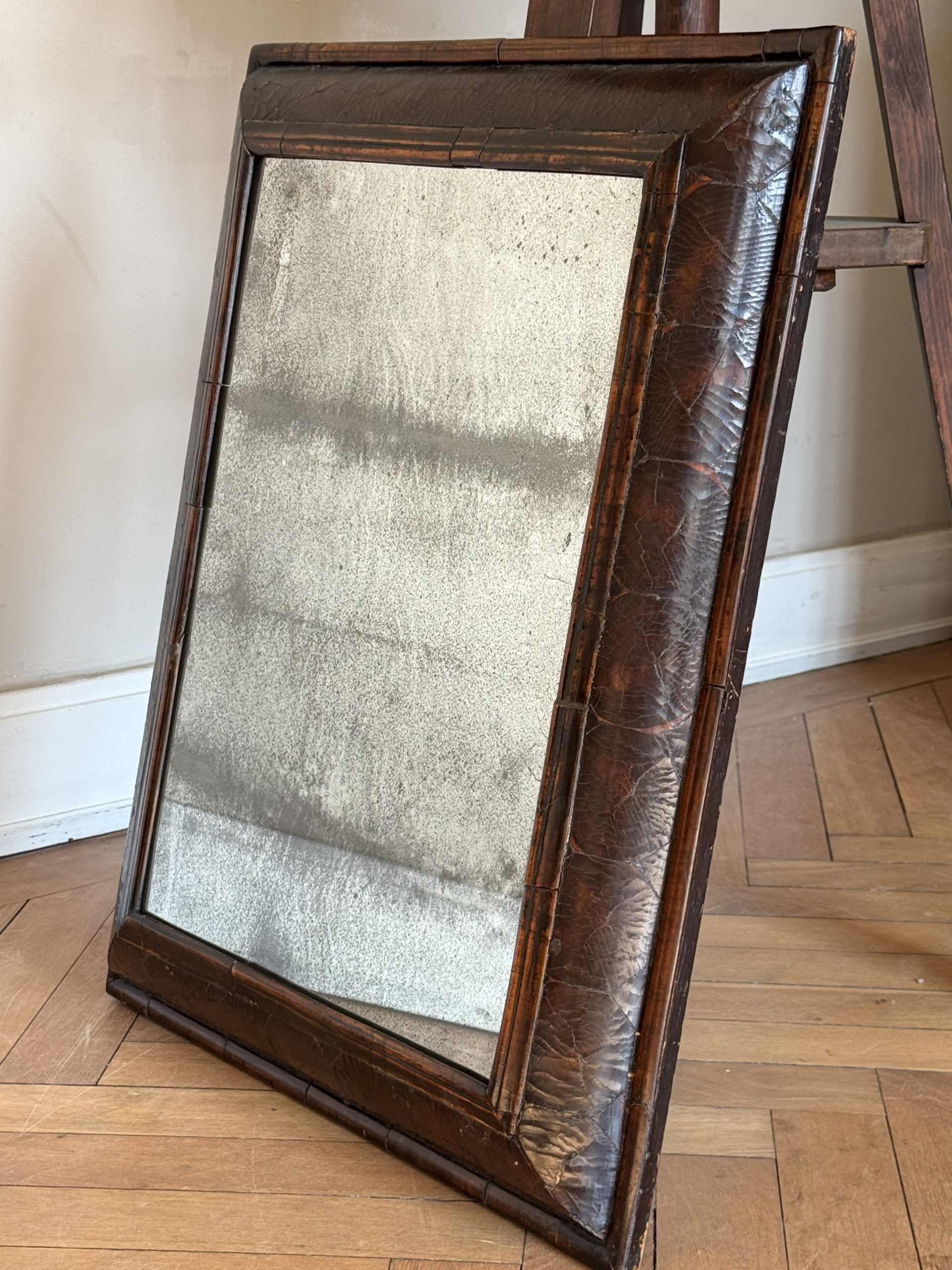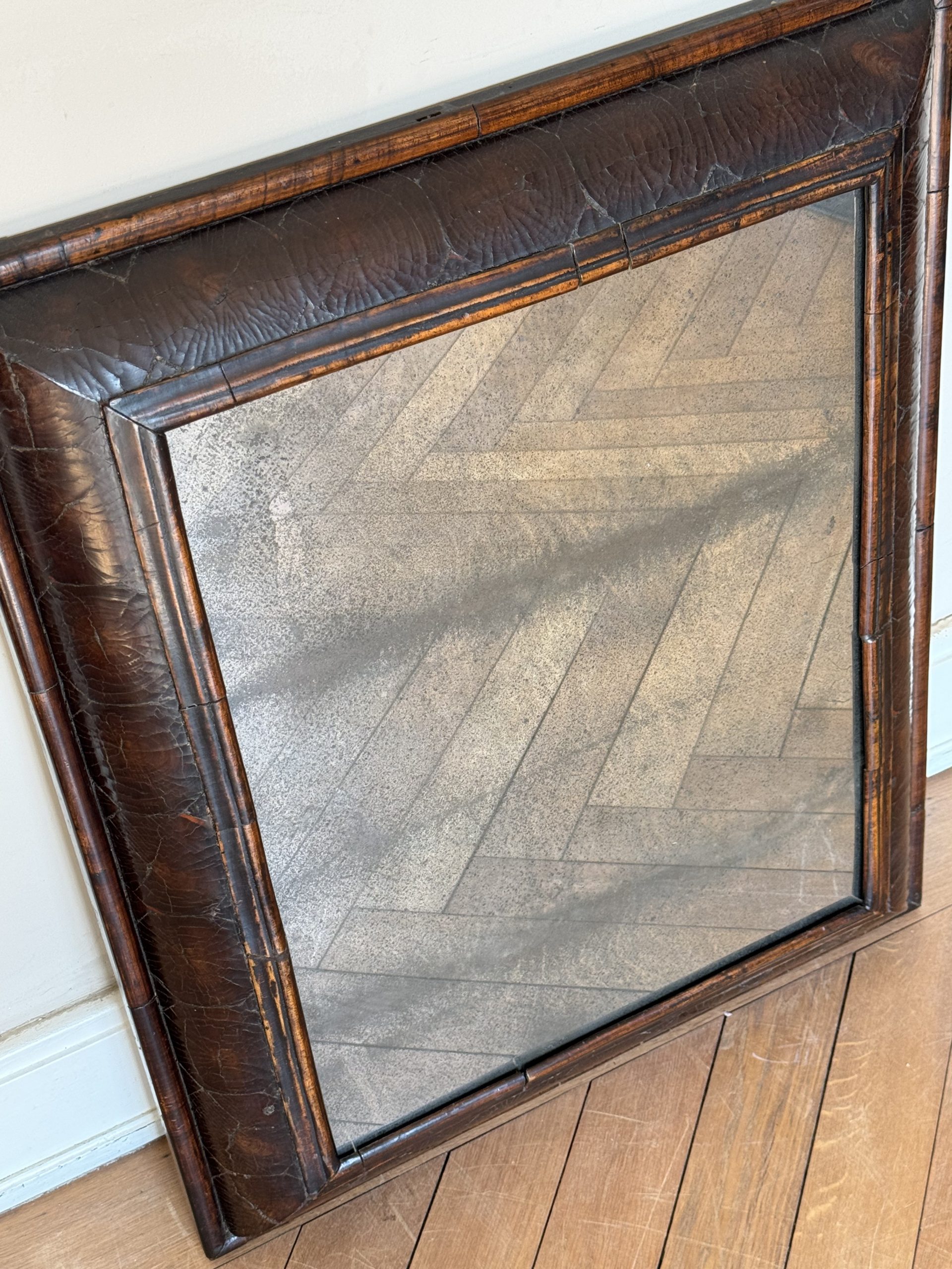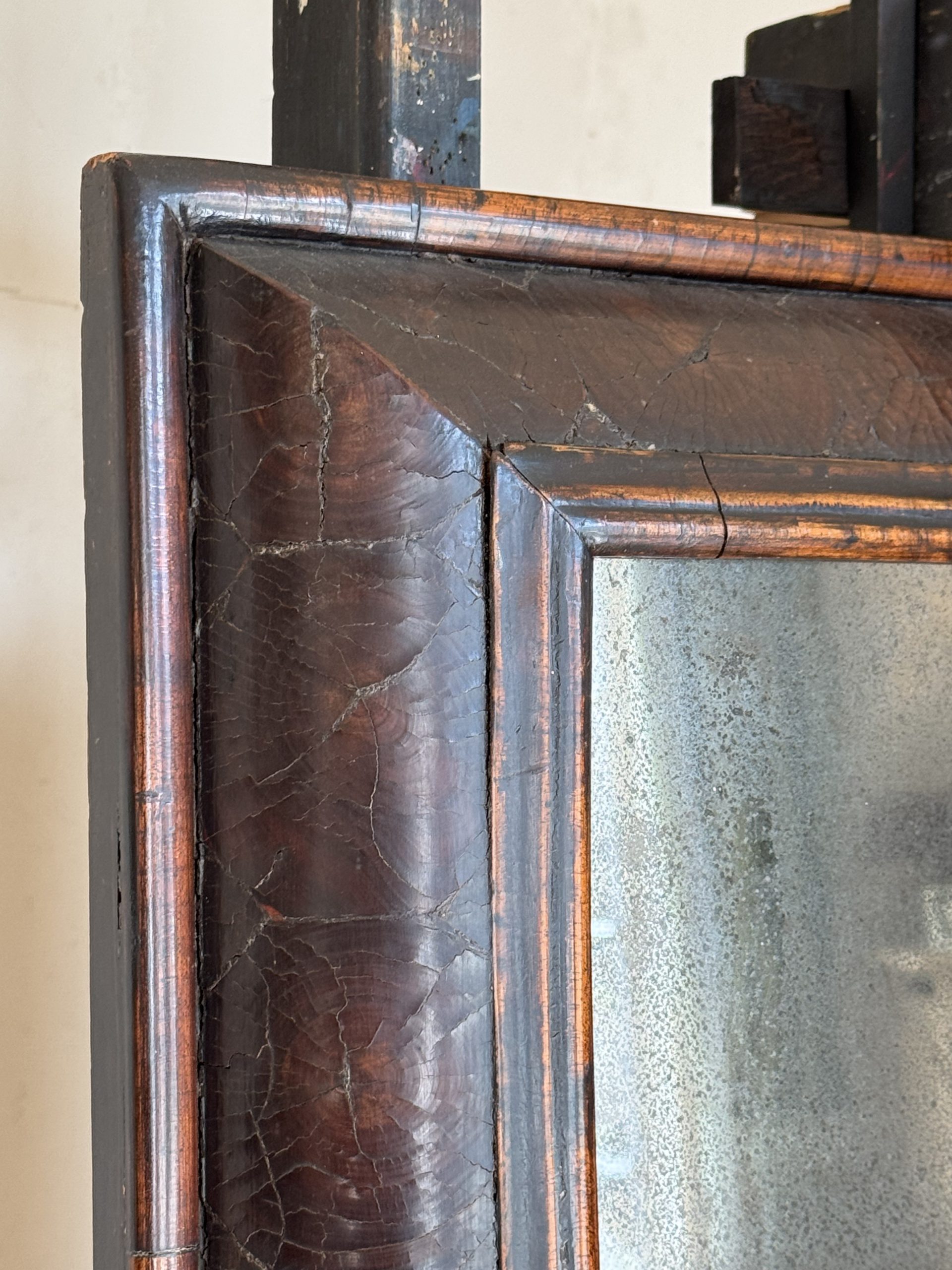 NEW ARRIVALS 17th C. Walnut Cushion Mirror - England 1680 Large 17th Century walnut cushion mirror with beautiful old mercury mirror plate.hight 79 cm (31,10 in)depth 7 cm (2,75 in)width 63,5 cm (25 in)on hold