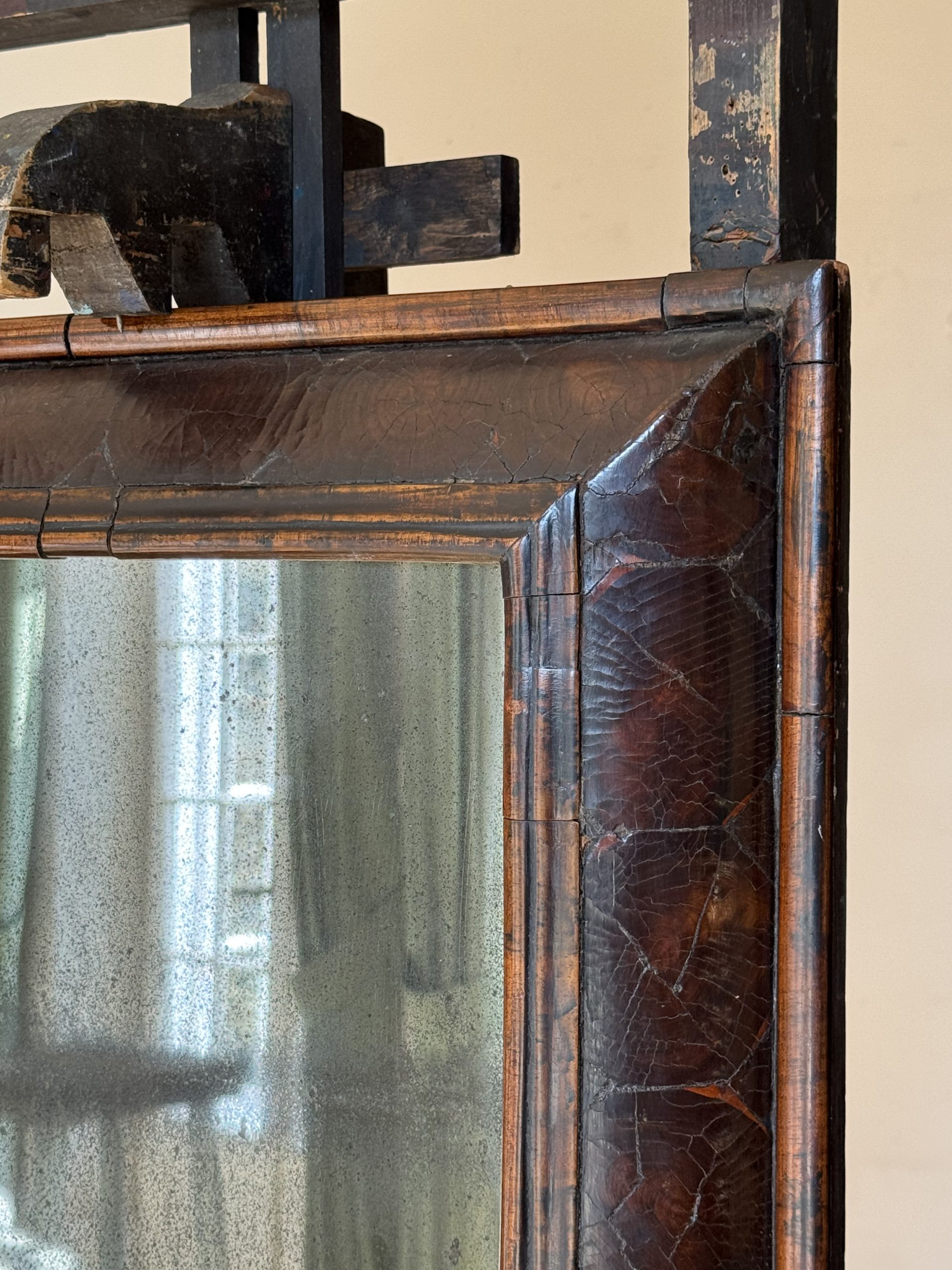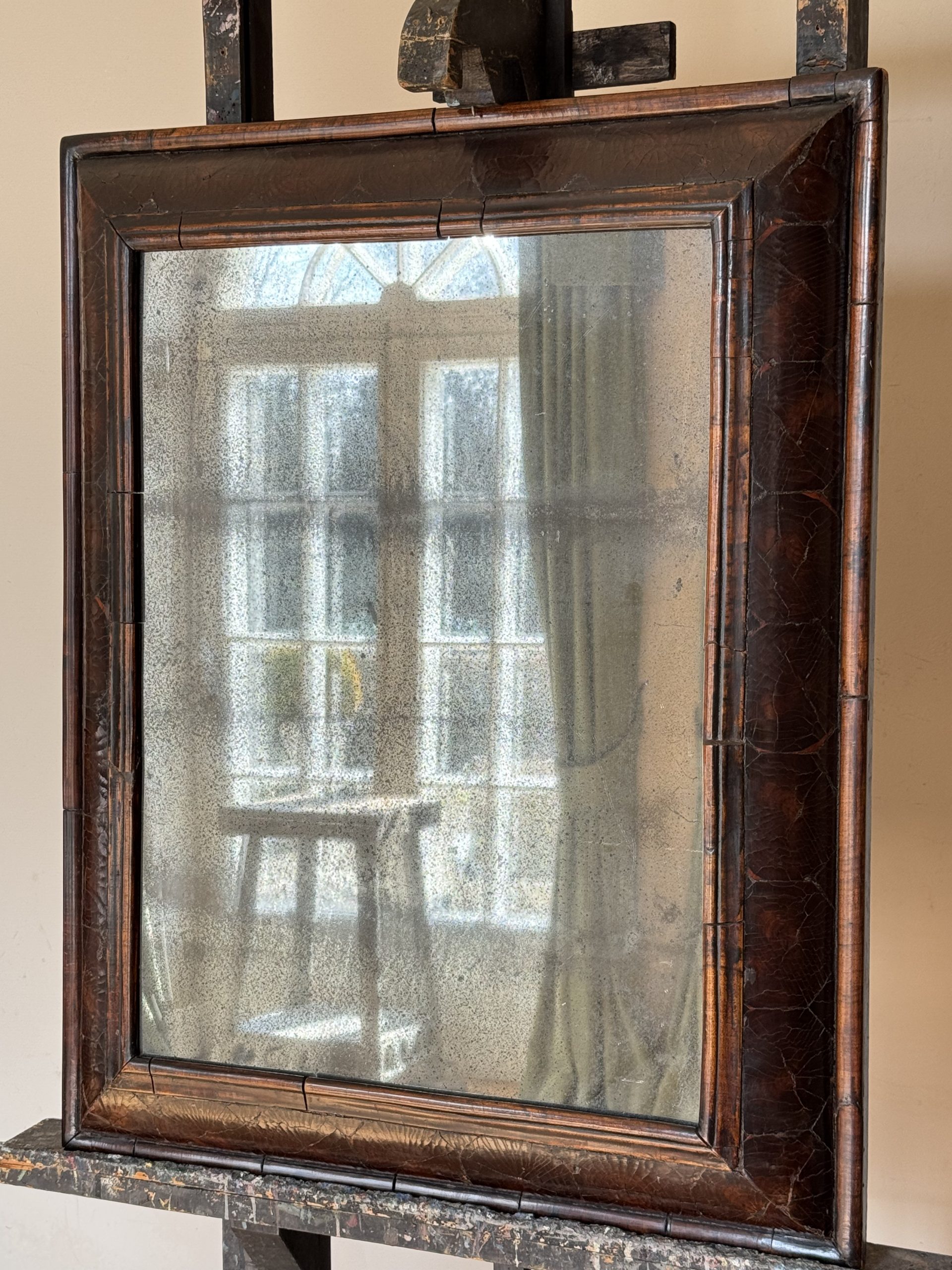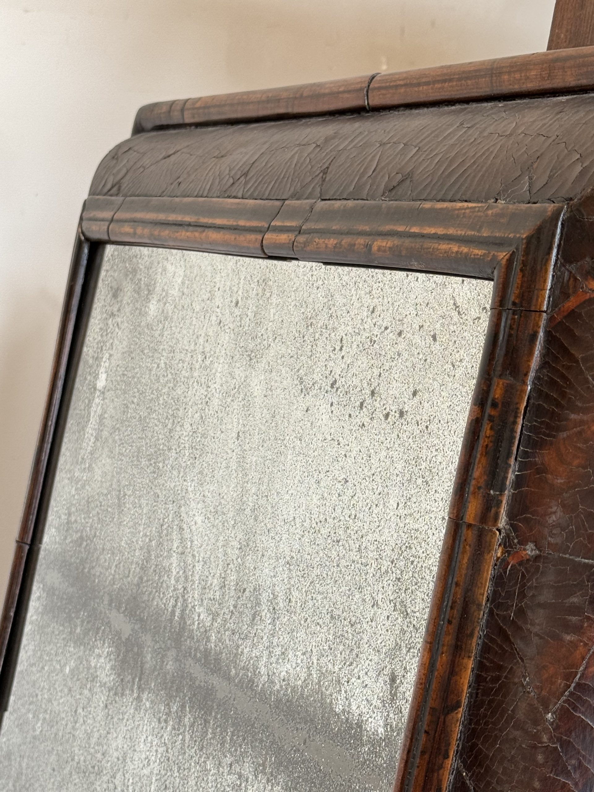 NEW ARRIVALS 17th C. Walnut Cushion Mirror - England 1680 Large 17th Century walnut cushion mirror with beautiful old mercury mirror plate.hight 79 cm (31,10 in)depth 7 cm (2,75 in)width 63,5 cm (25 in)on hold