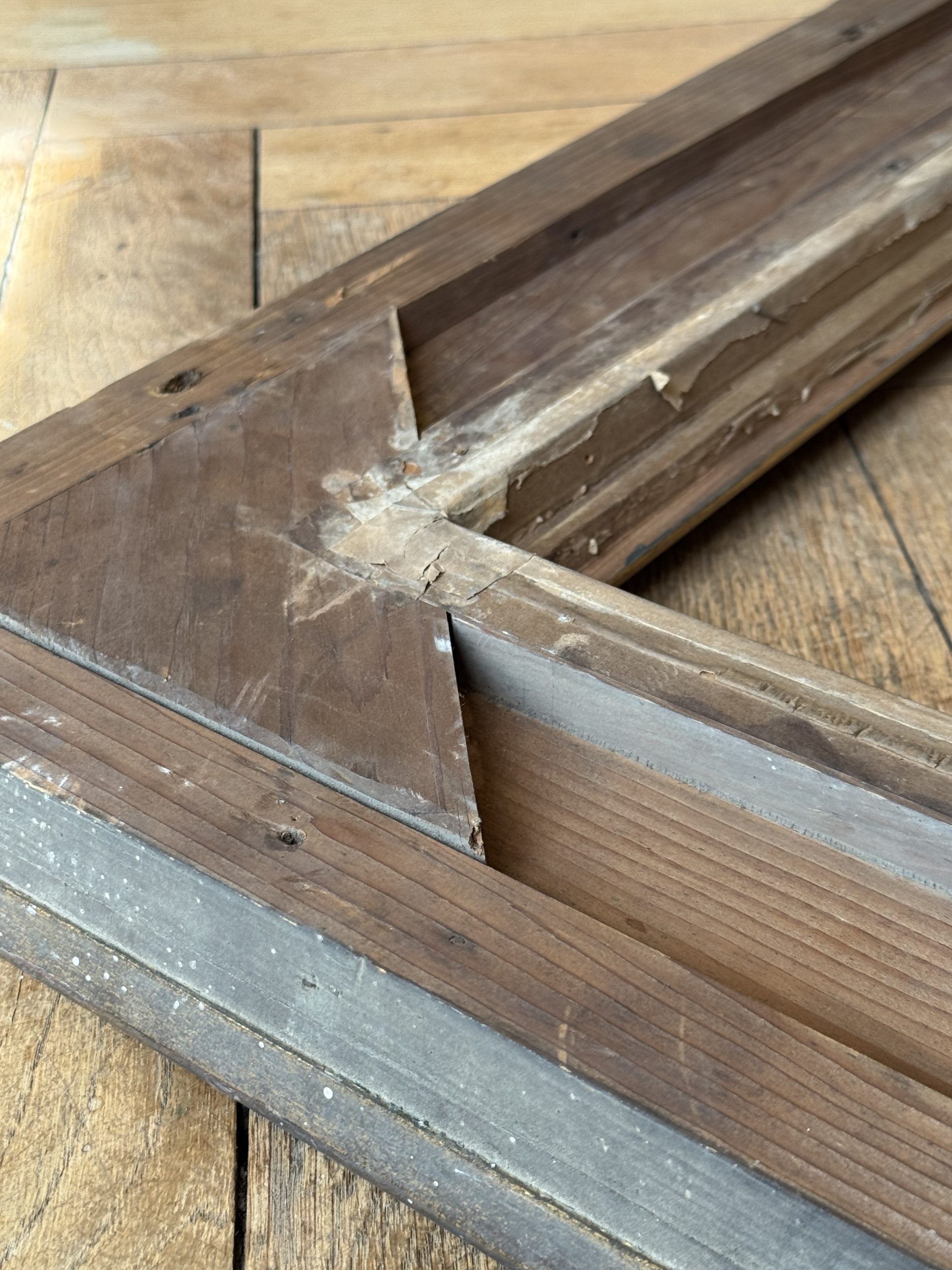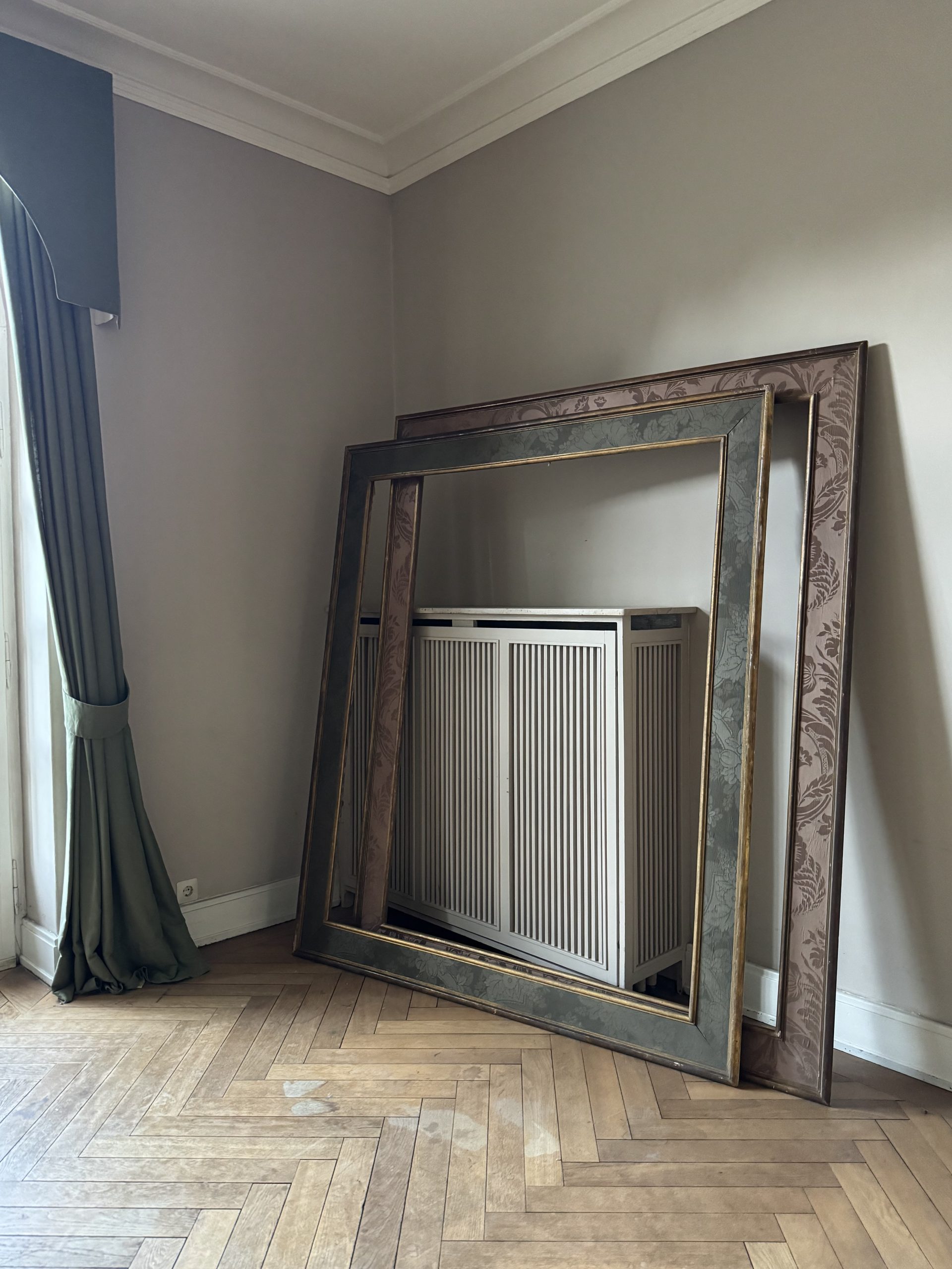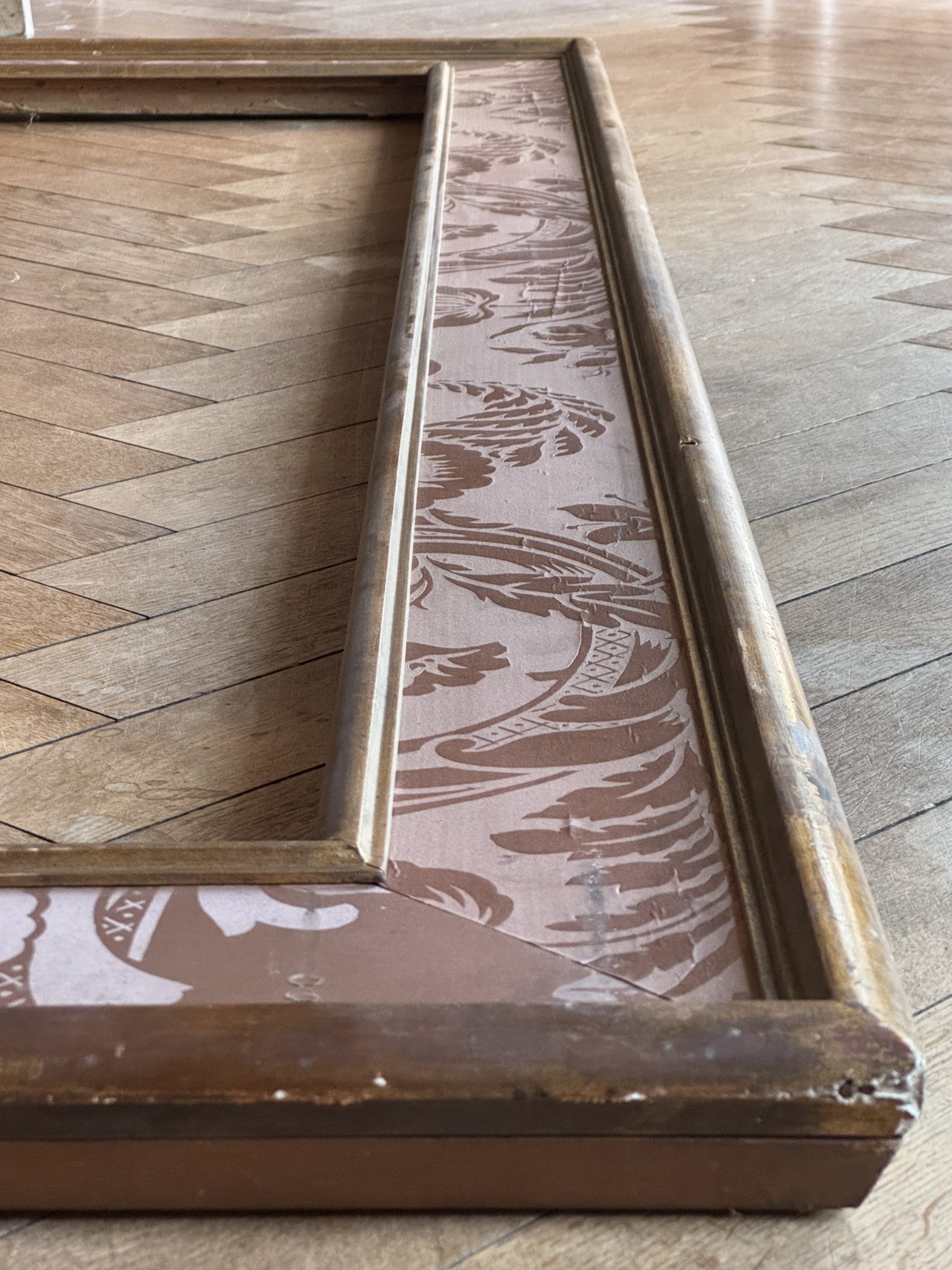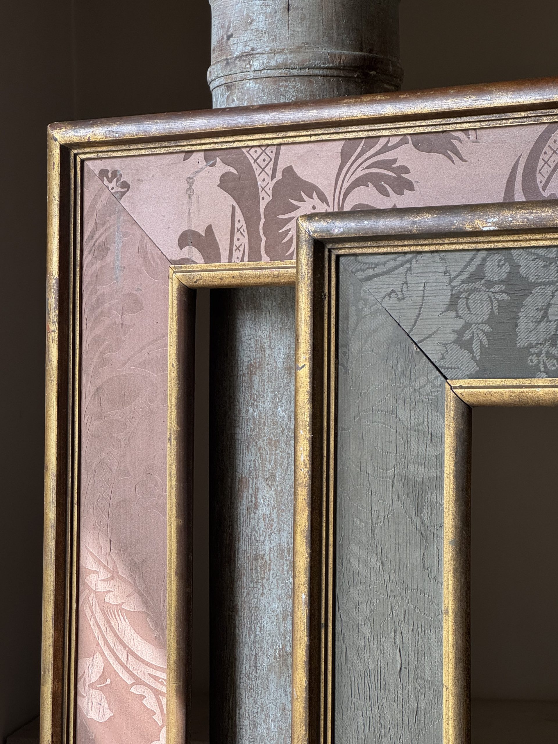 Impressive & very rare silk covered frames from an old Paris town house. Lovely patina & visible history.