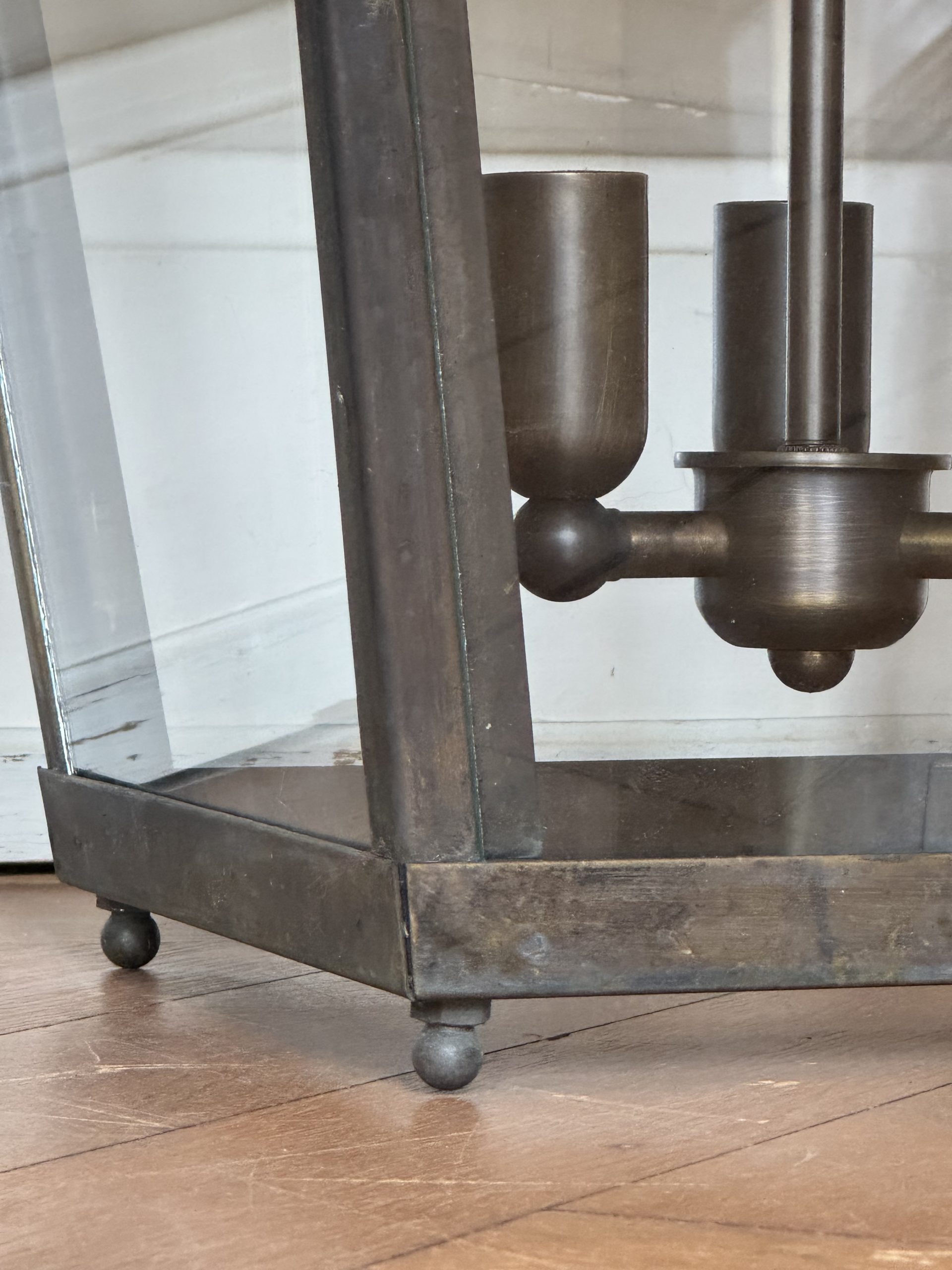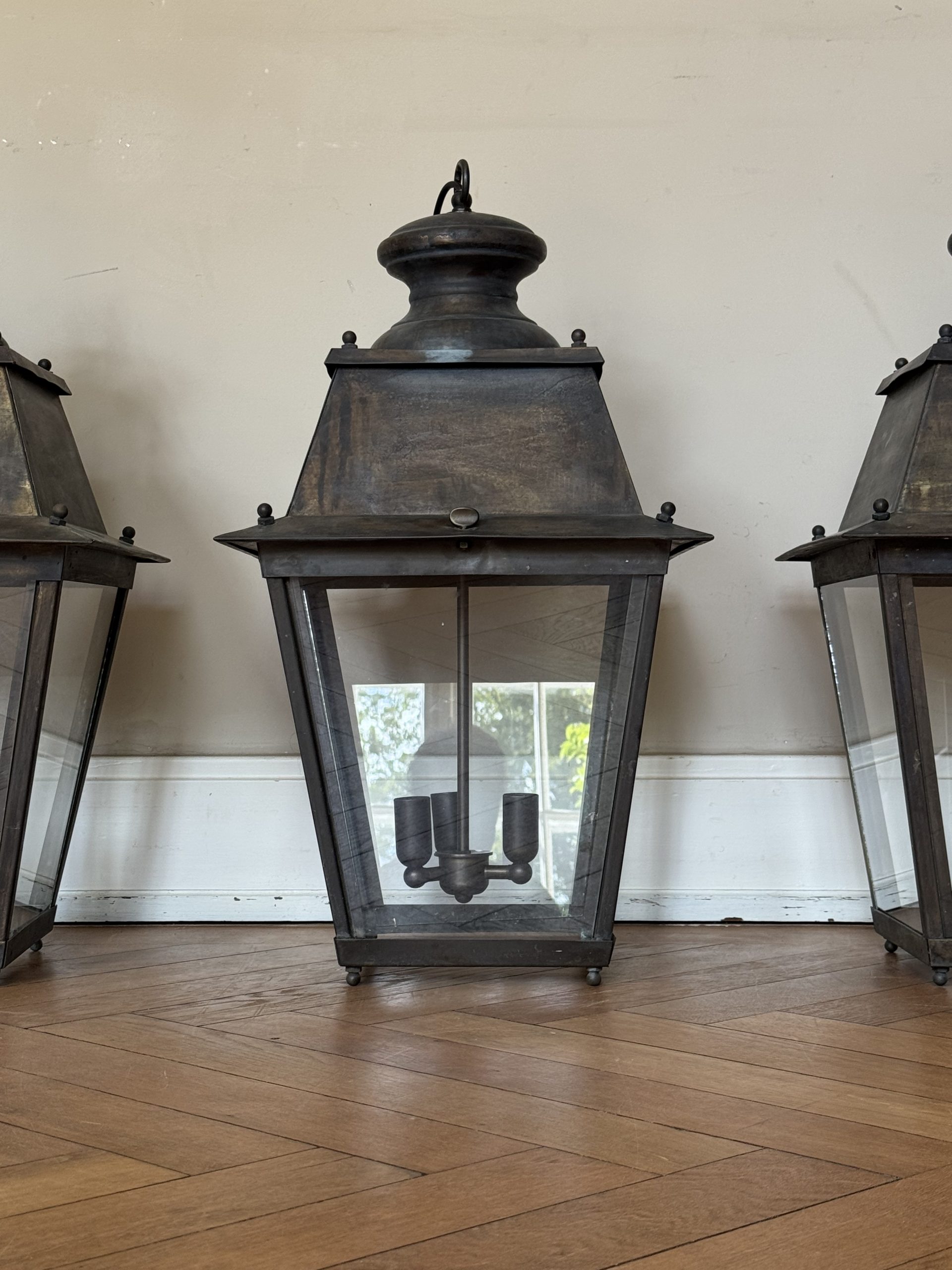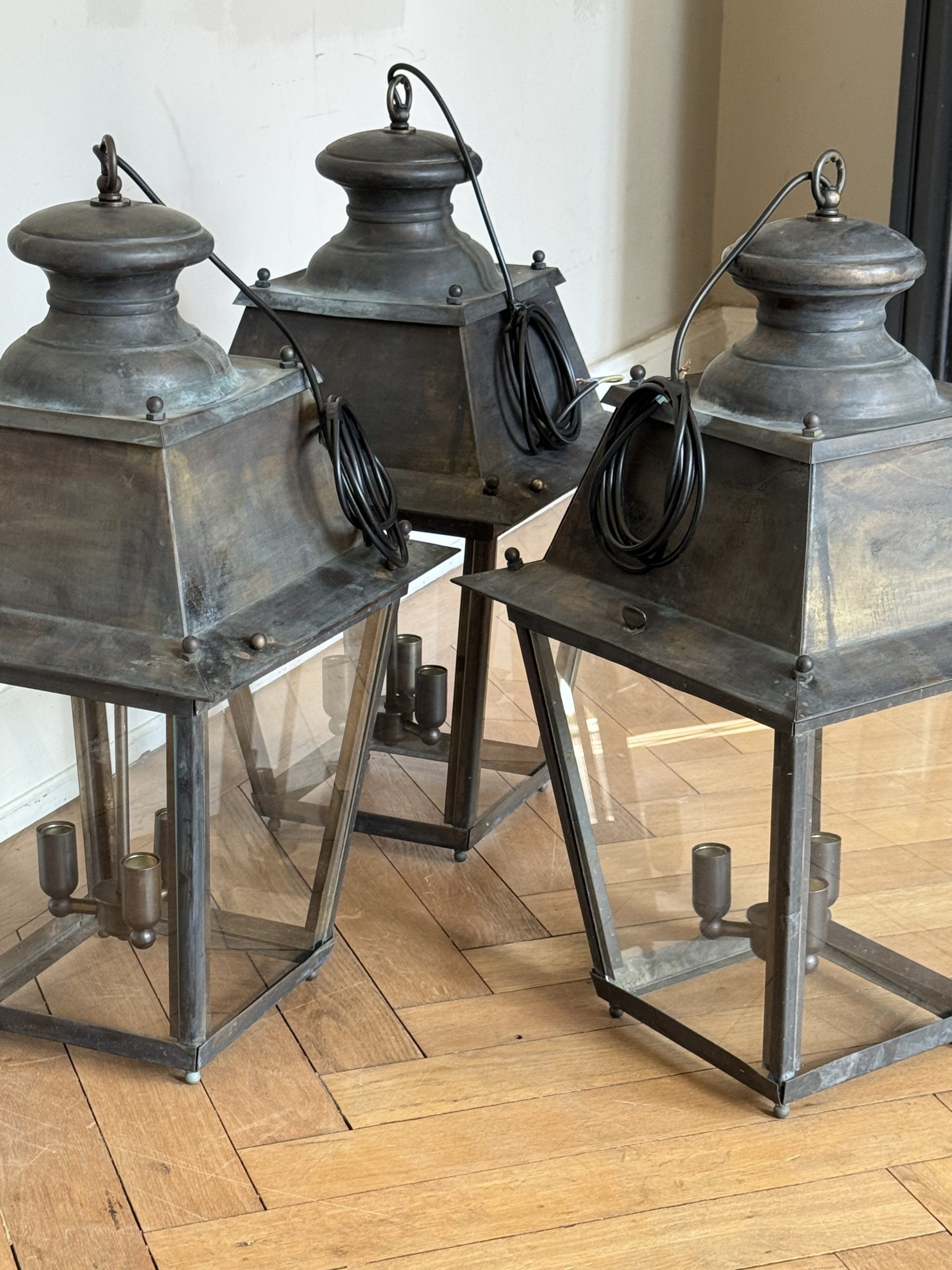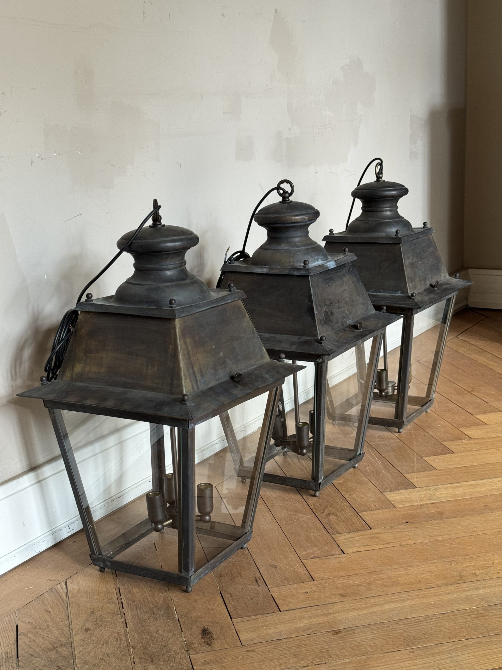 Set of 3 hanging lanterns with a great patina. Carefully restored and new electrified. The lanterns comes with a 2 meter black chain for hanging and black safety cable. Ready for hanging