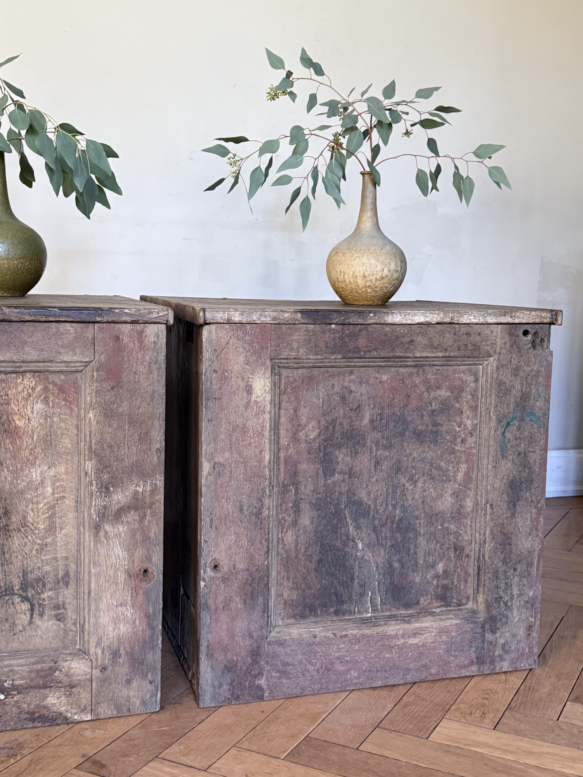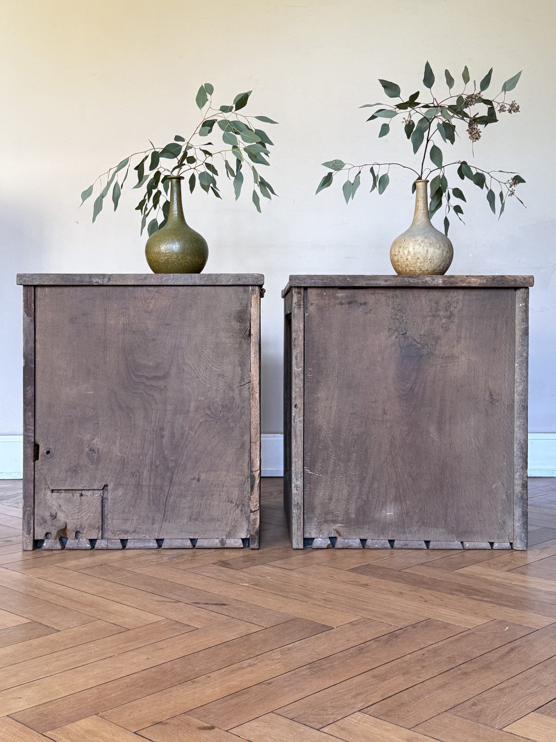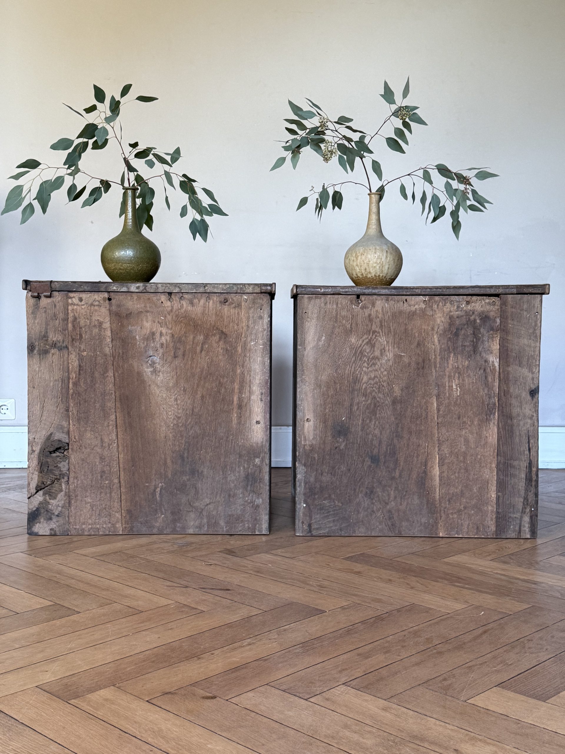 NEW ARRIVALS Oak Cubes No. 3. Side Tables - Nightstands A great pair of Wabi Sabi oak tables made of 17th Century Renaissance oak. Outstanding patina.hight 68 cm (26,77 in)depth 60 cm (23,62 in)width 67,5 cm (26,57 in)please contact for further info