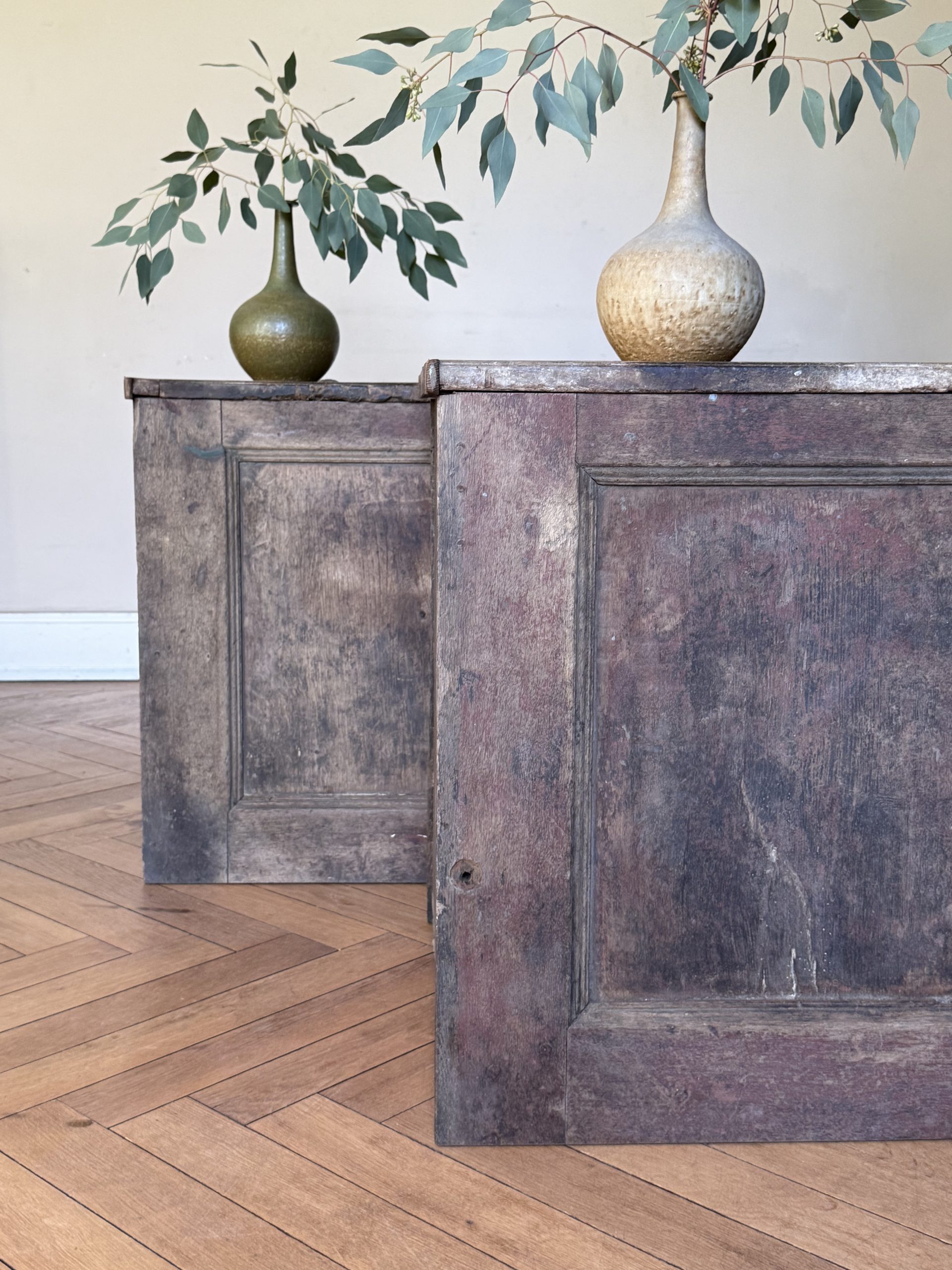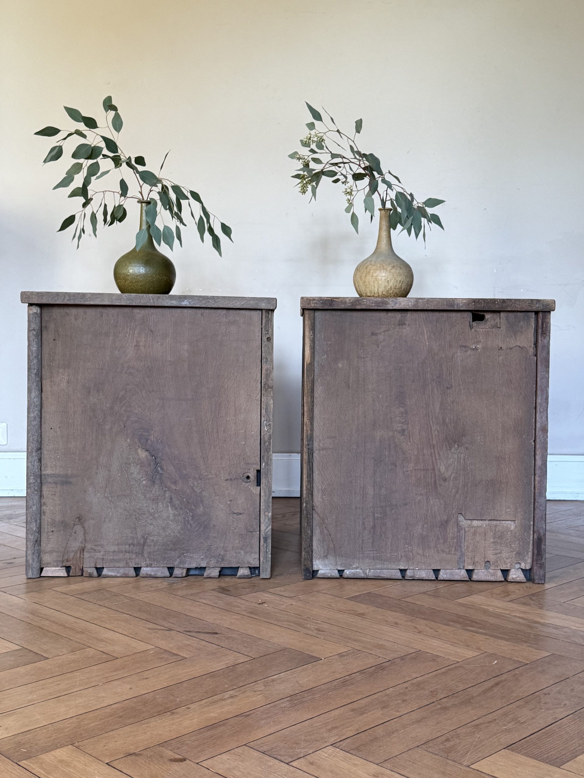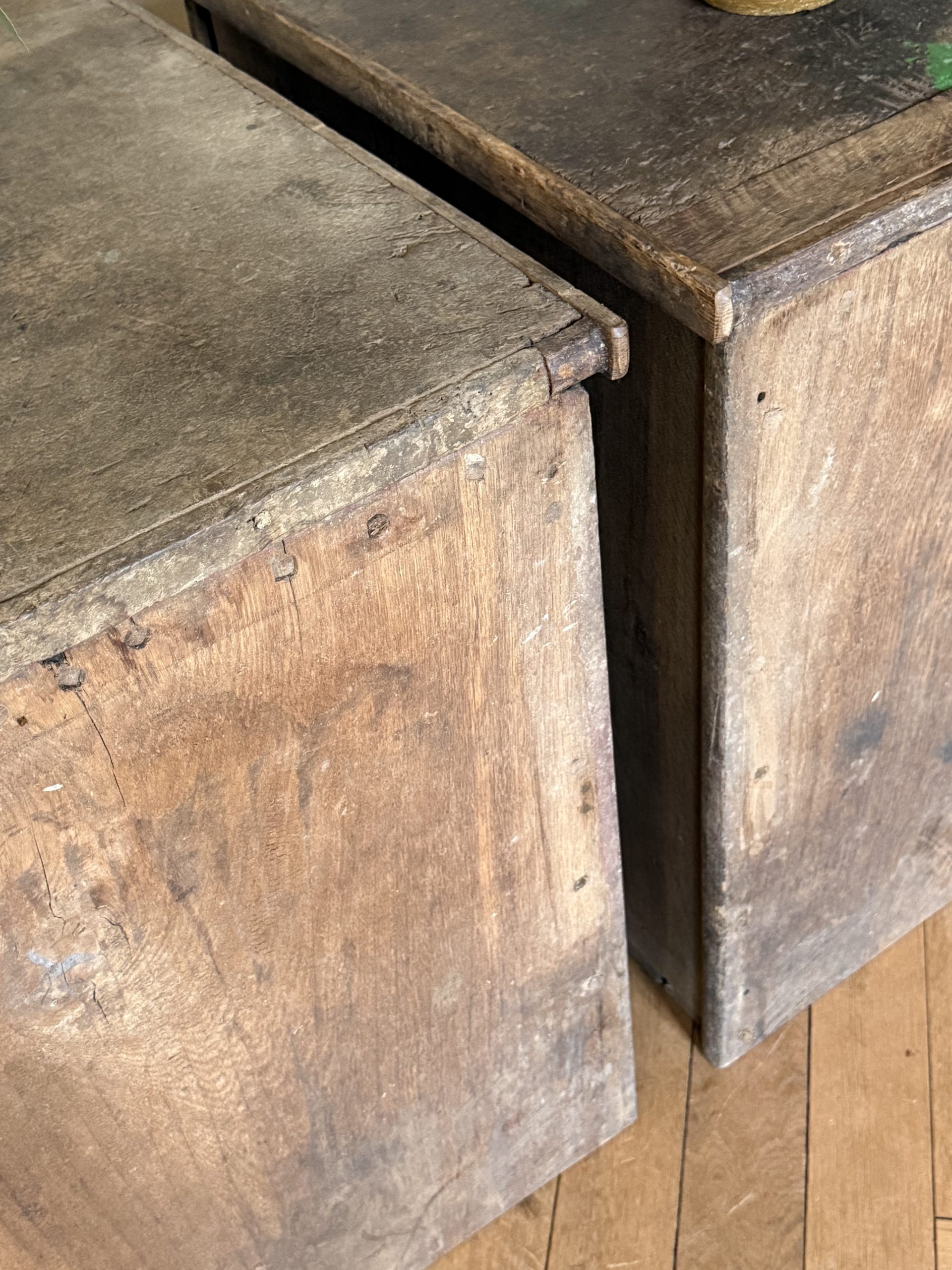 NEW ARRIVALS Oak Cubes No. 3. Side Tables - Nightstands A great pair of Wabi Sabi oak tables made of 17th Century Renaissance oak. Outstanding patina.hight 68 cm (26,77 in)depth 60 cm (23,62 in)width 67,5 cm (26,57 in)please contact for further info