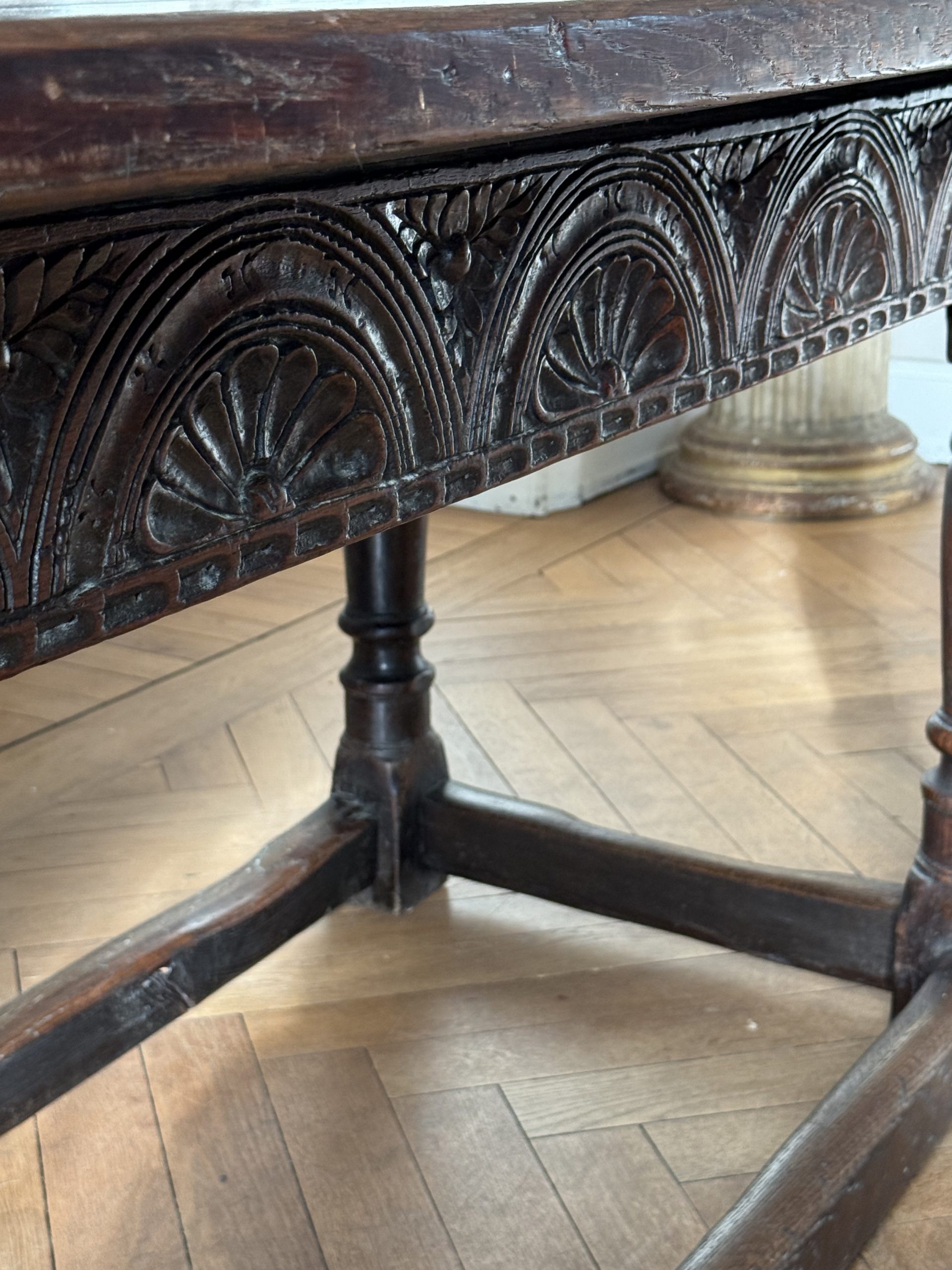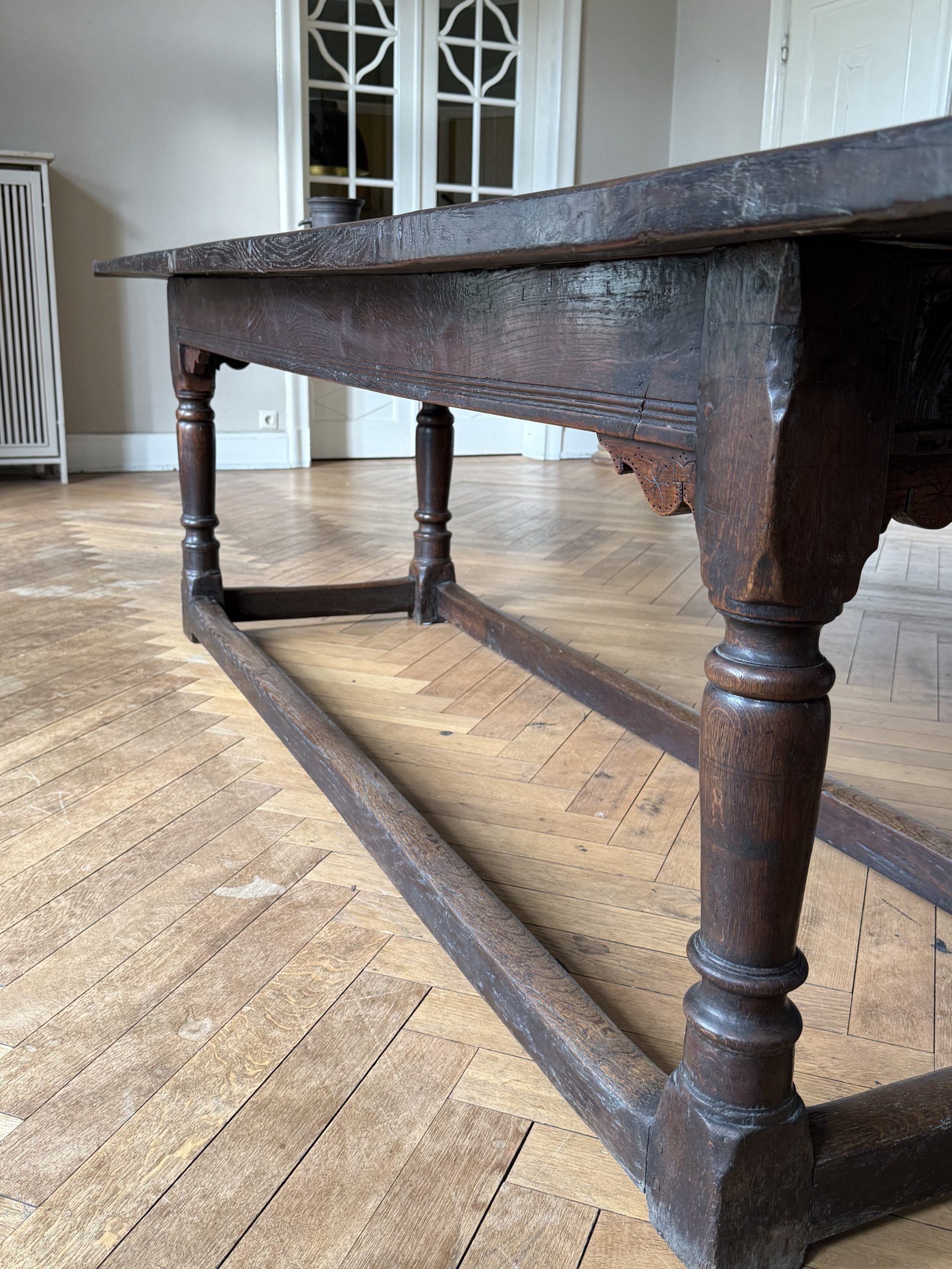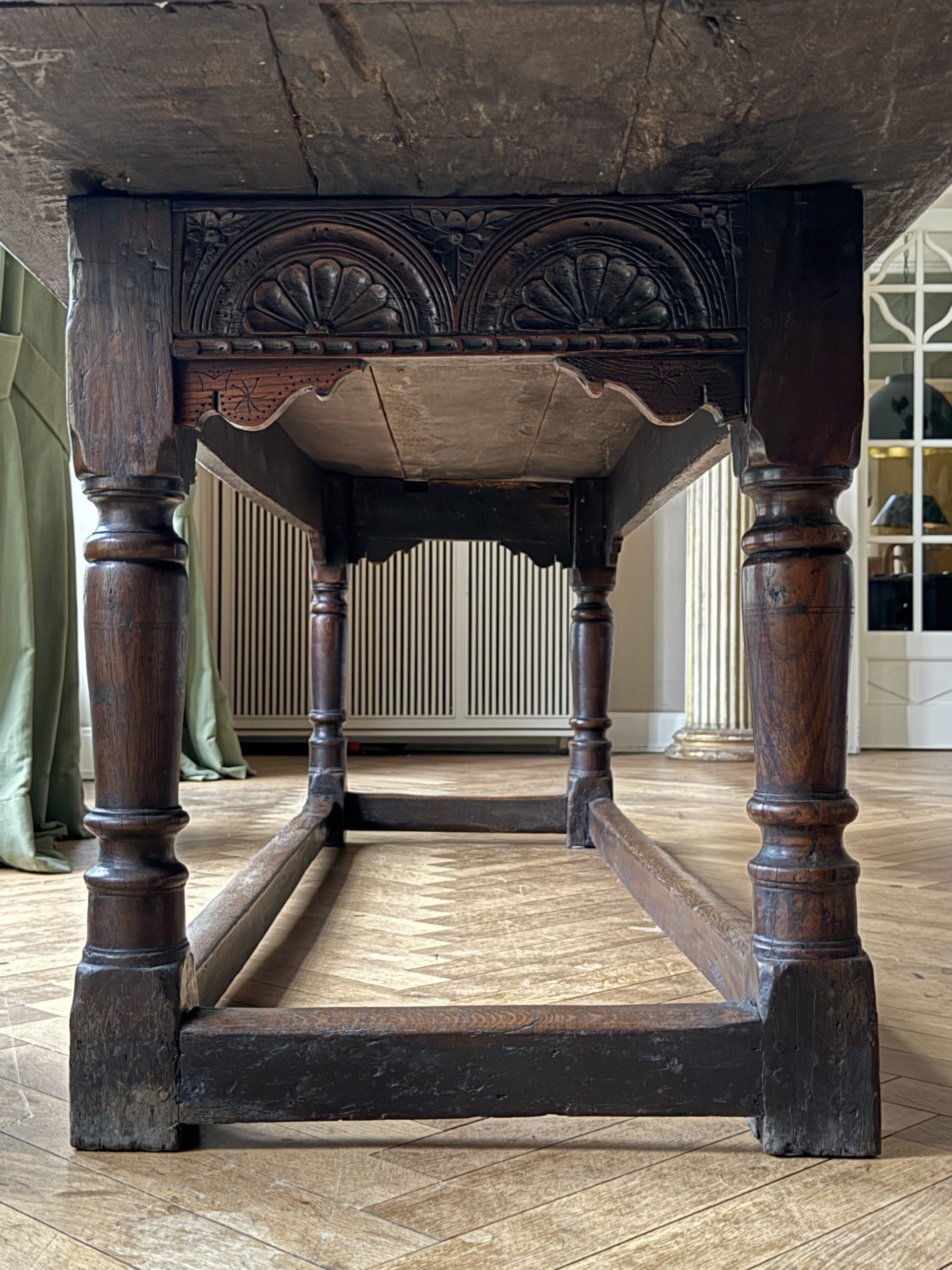 An exceptional 17th Century English carved oak refectory table circa 1680. A fine & large oak table from the reign of Kind Charles II.