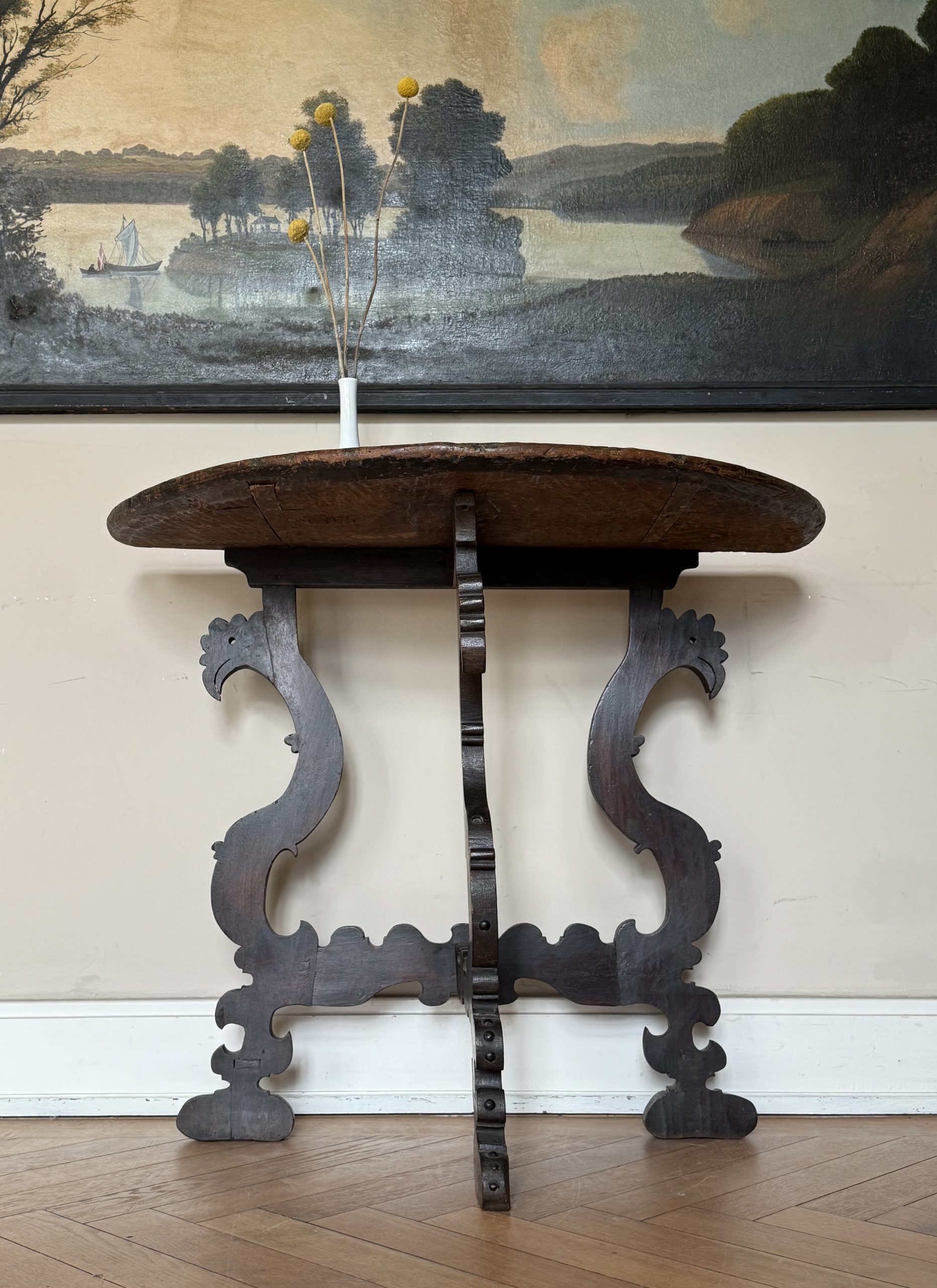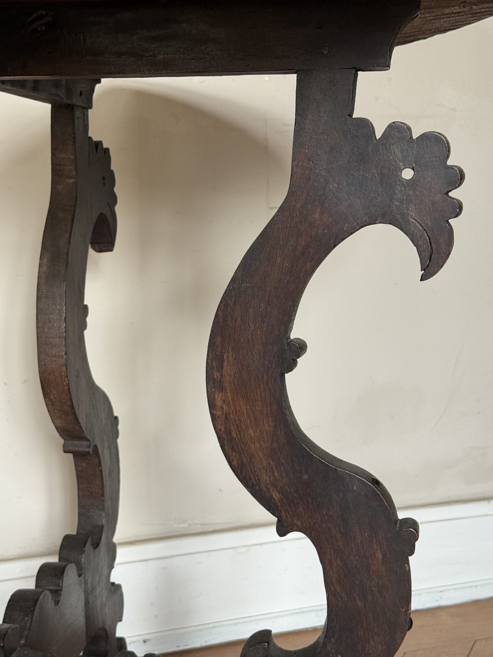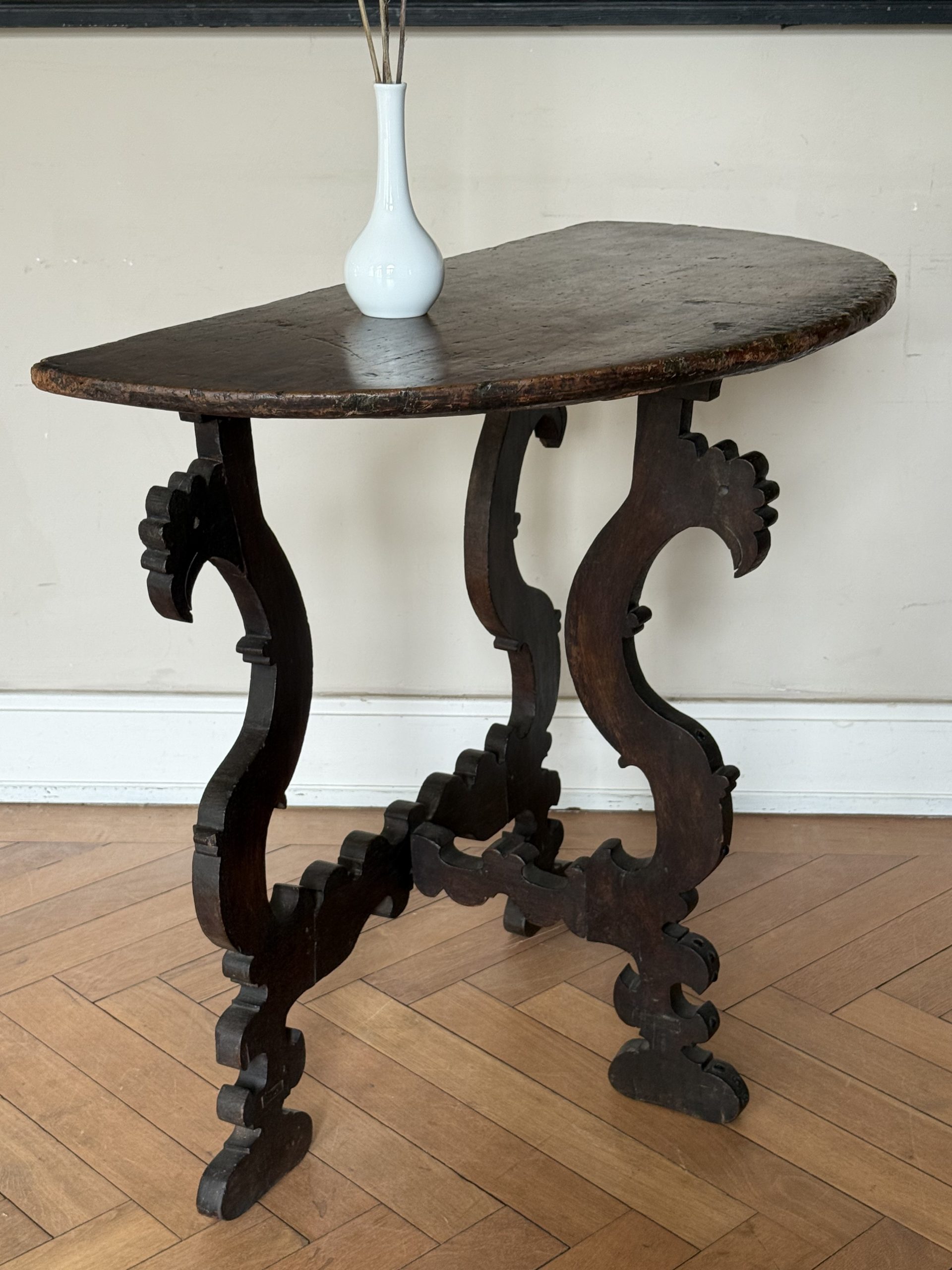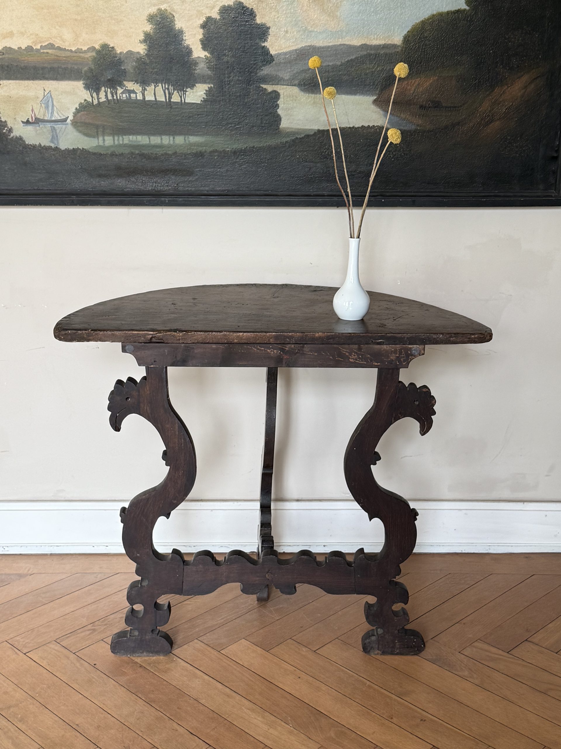 NEW ARRIVALS Early 18th Century Walnut Demi Lune Table A rare & unusual solid dark walnut console table on lyra legs with bird head decoration.hight 85,5 cm (33,66 in)depth 50 cm (19,68 in)width 100,5 cm (39,56 in)please contact for further info.