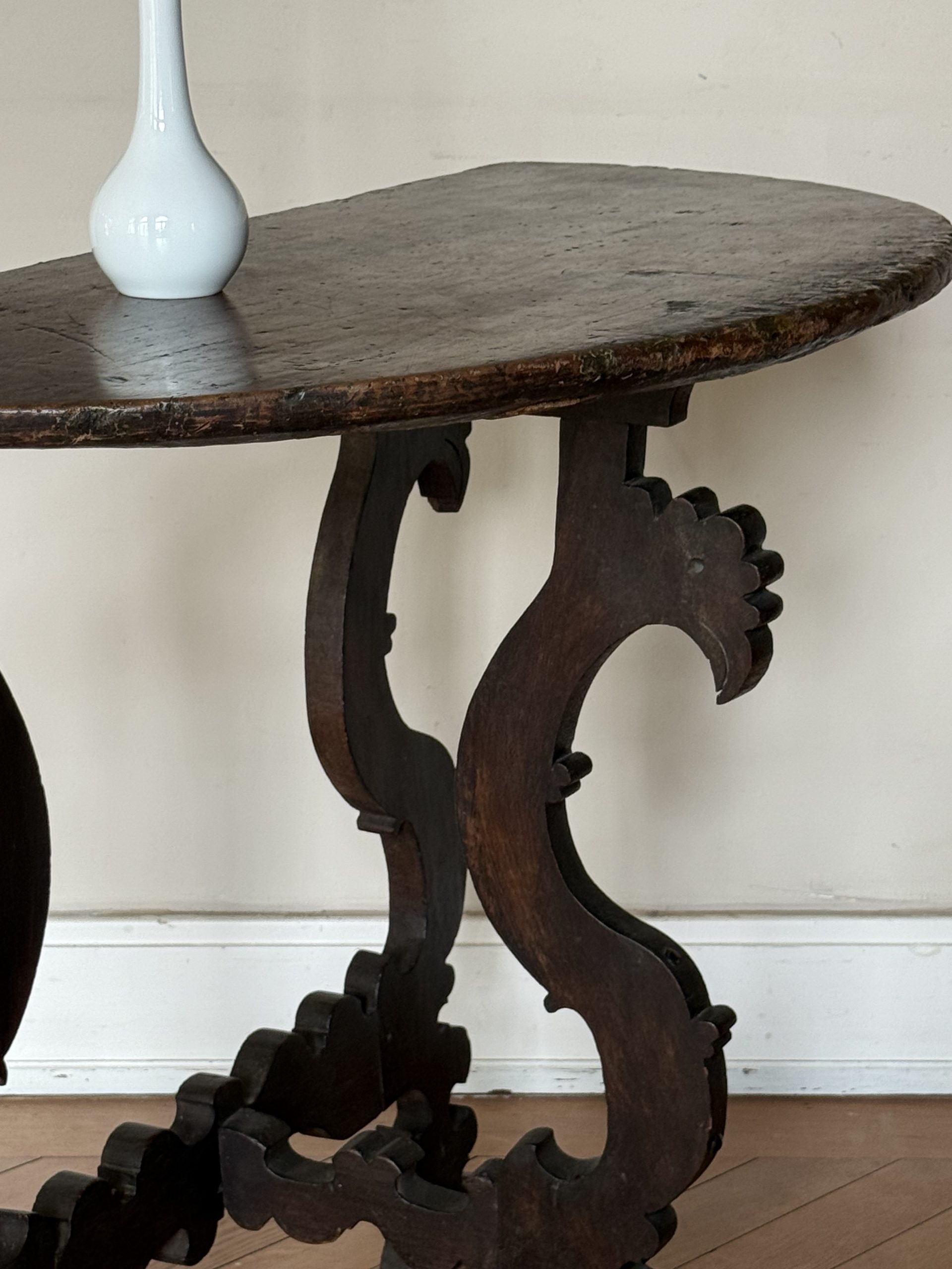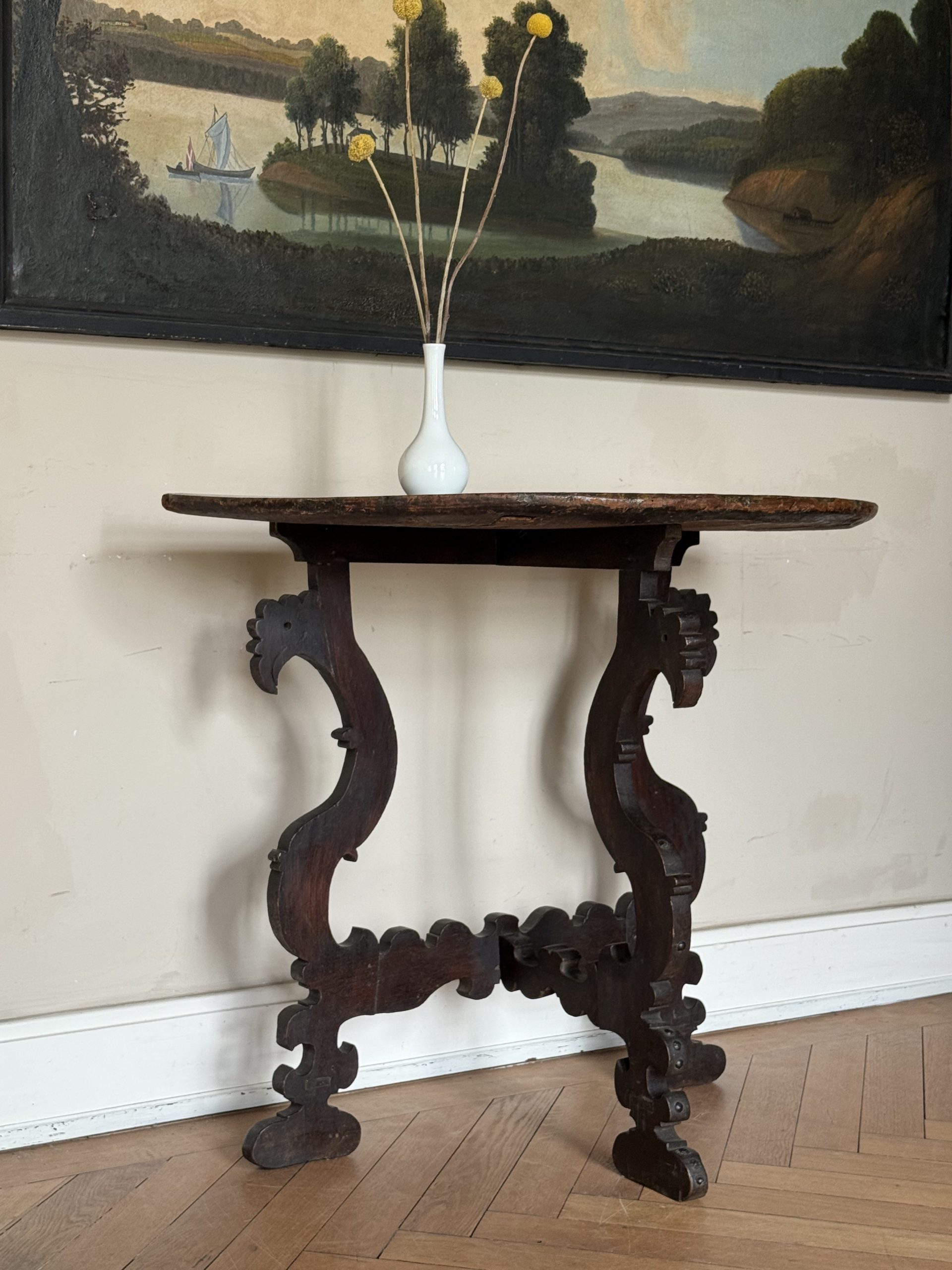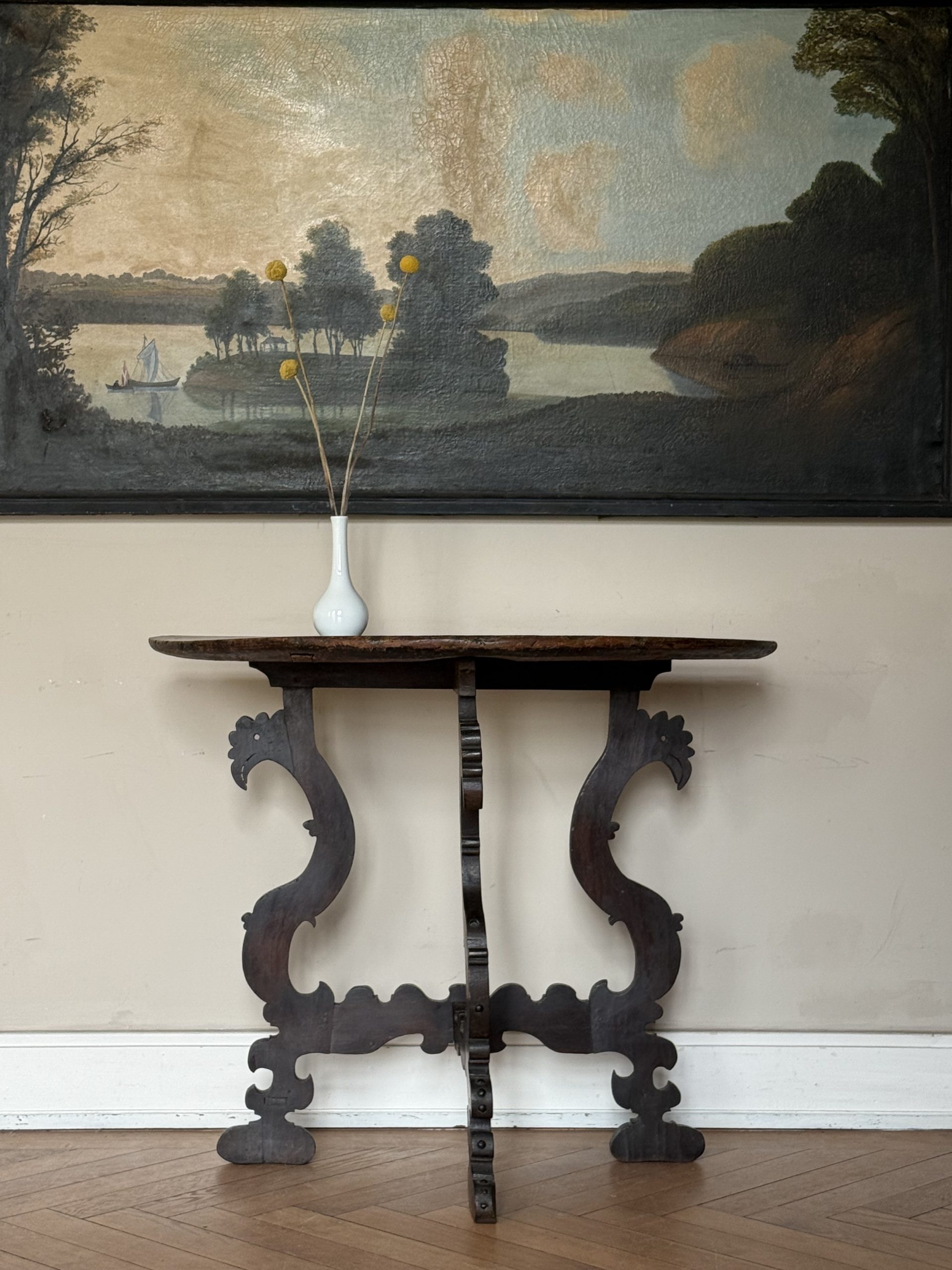 NEW ARRIVALS Early 18th Century Walnut Demi Lune Table A rare & unusual solid dark walnut console table on lyra legs with bird head decoration.hight 85,5 cm (33,66 in)depth 50 cm (19,68 in)width 100,5 cm (39,56 in)please contact for further info.