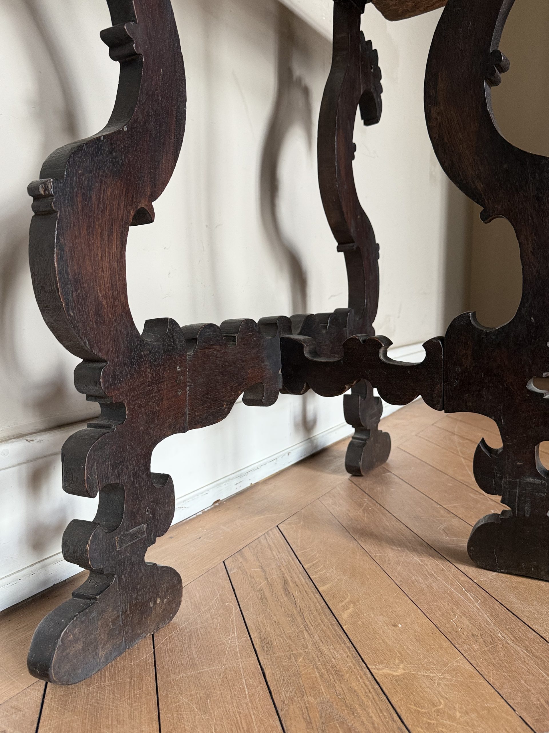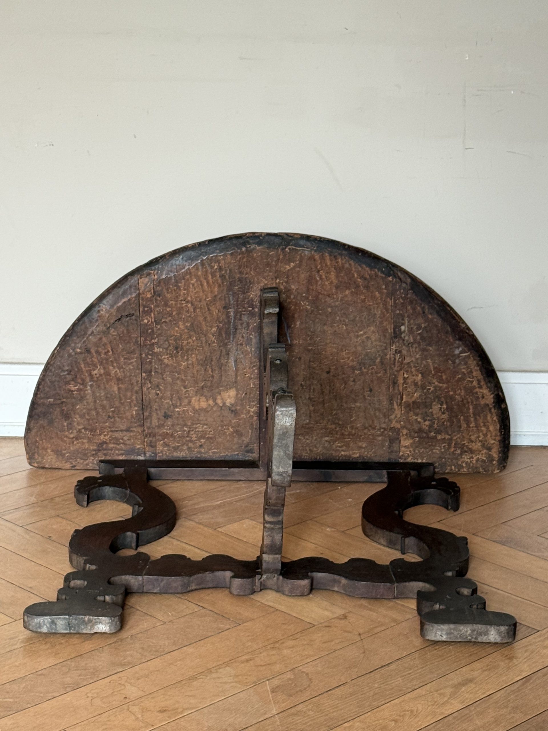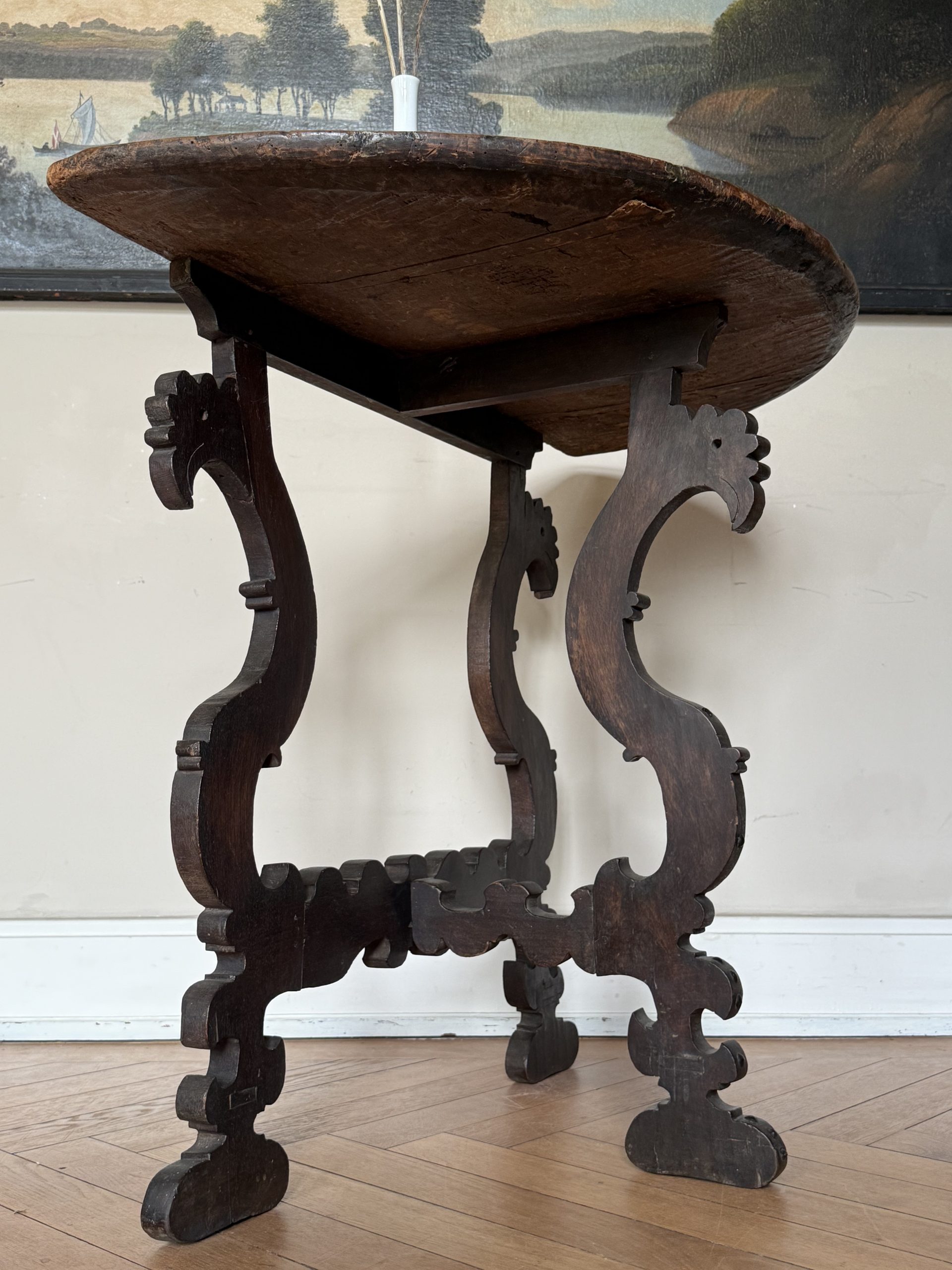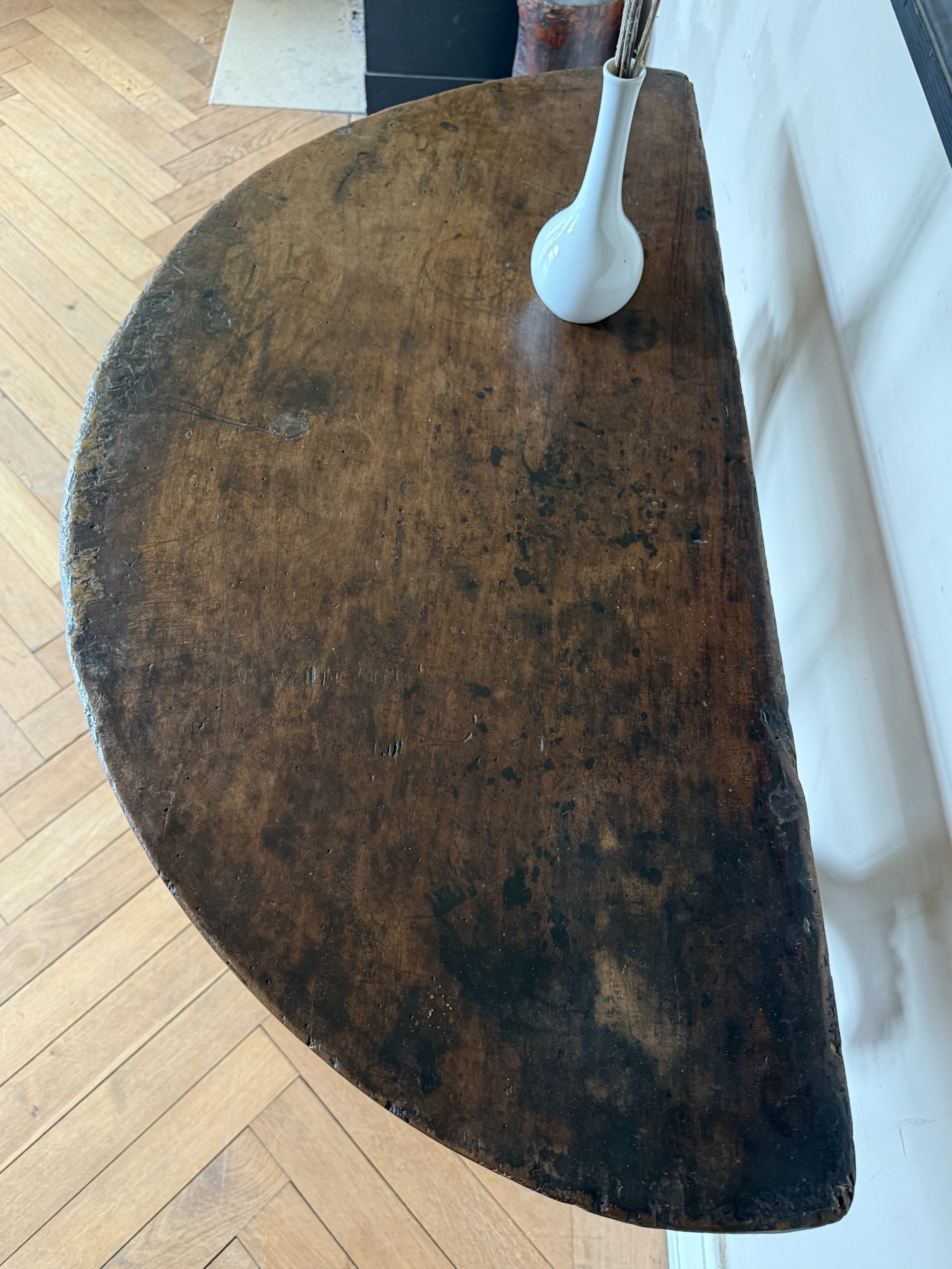 NEW ARRIVALS Early 18th Century Walnut Demi Lune Table A rare & unusual solid dark walnut console table on lyra legs with bird head decoration.hight 85,5 cm (33,66 in)depth 50 cm (19,68 in)width 100,5 cm (39,56 in)please contact for further info.