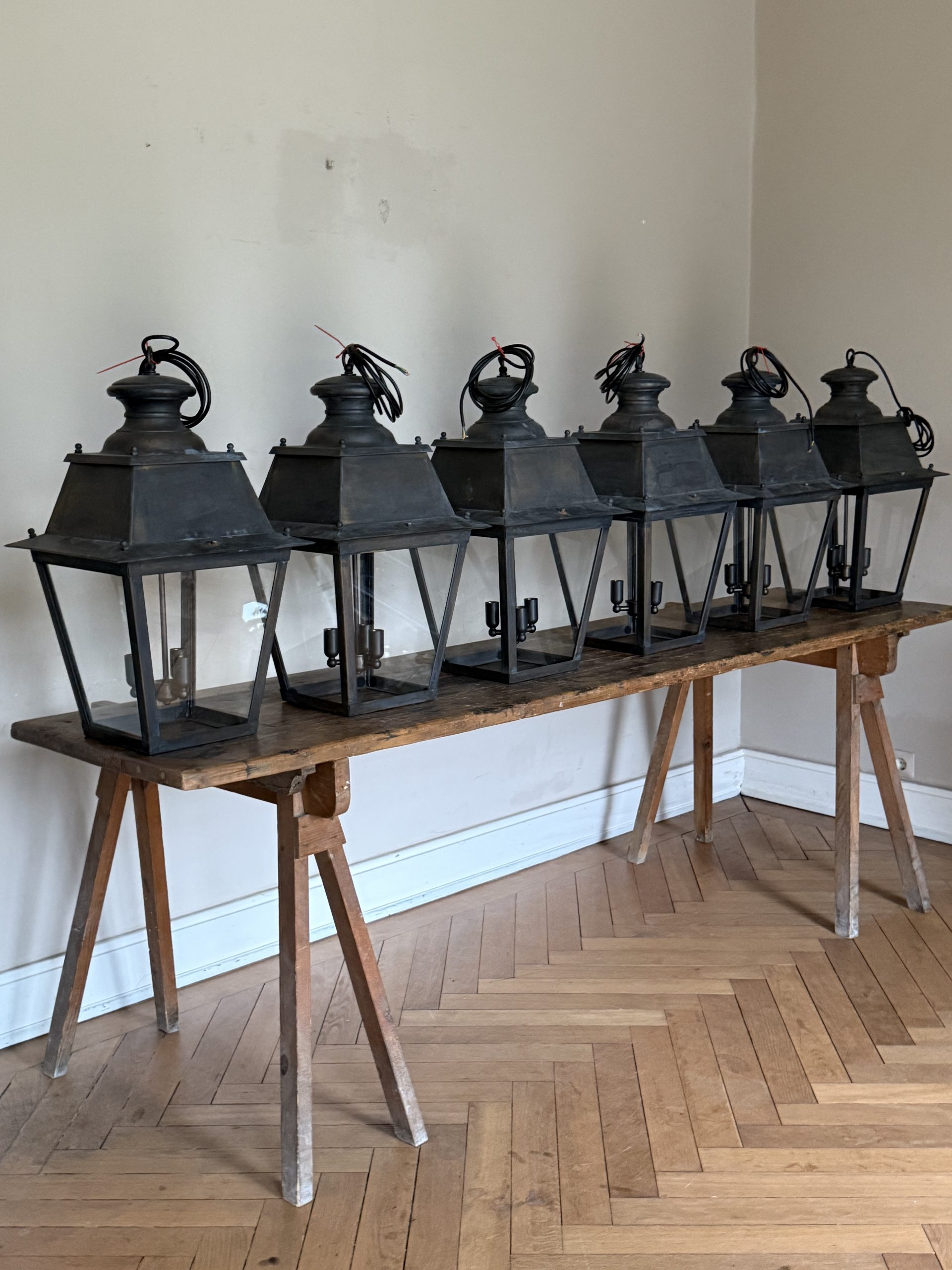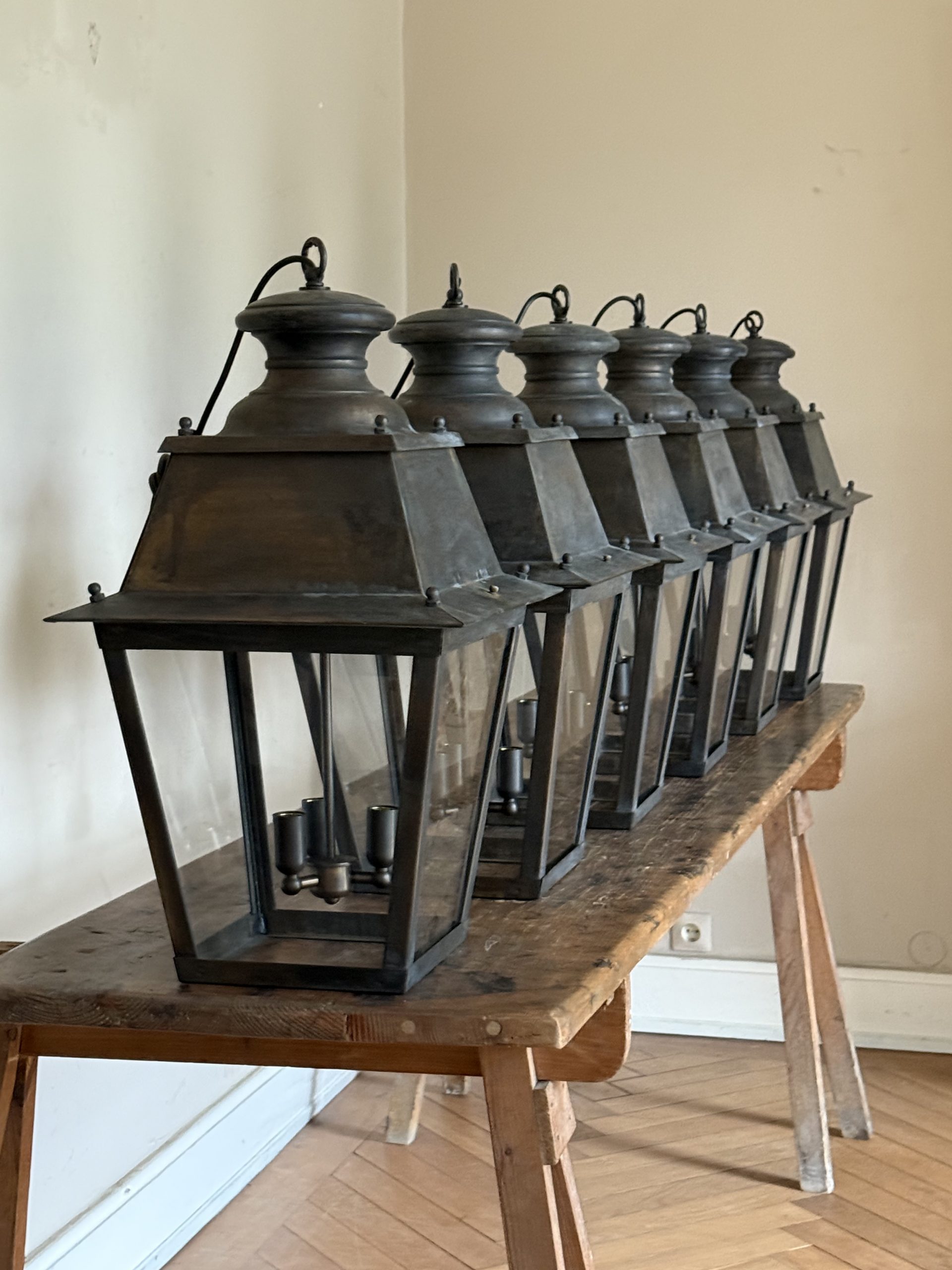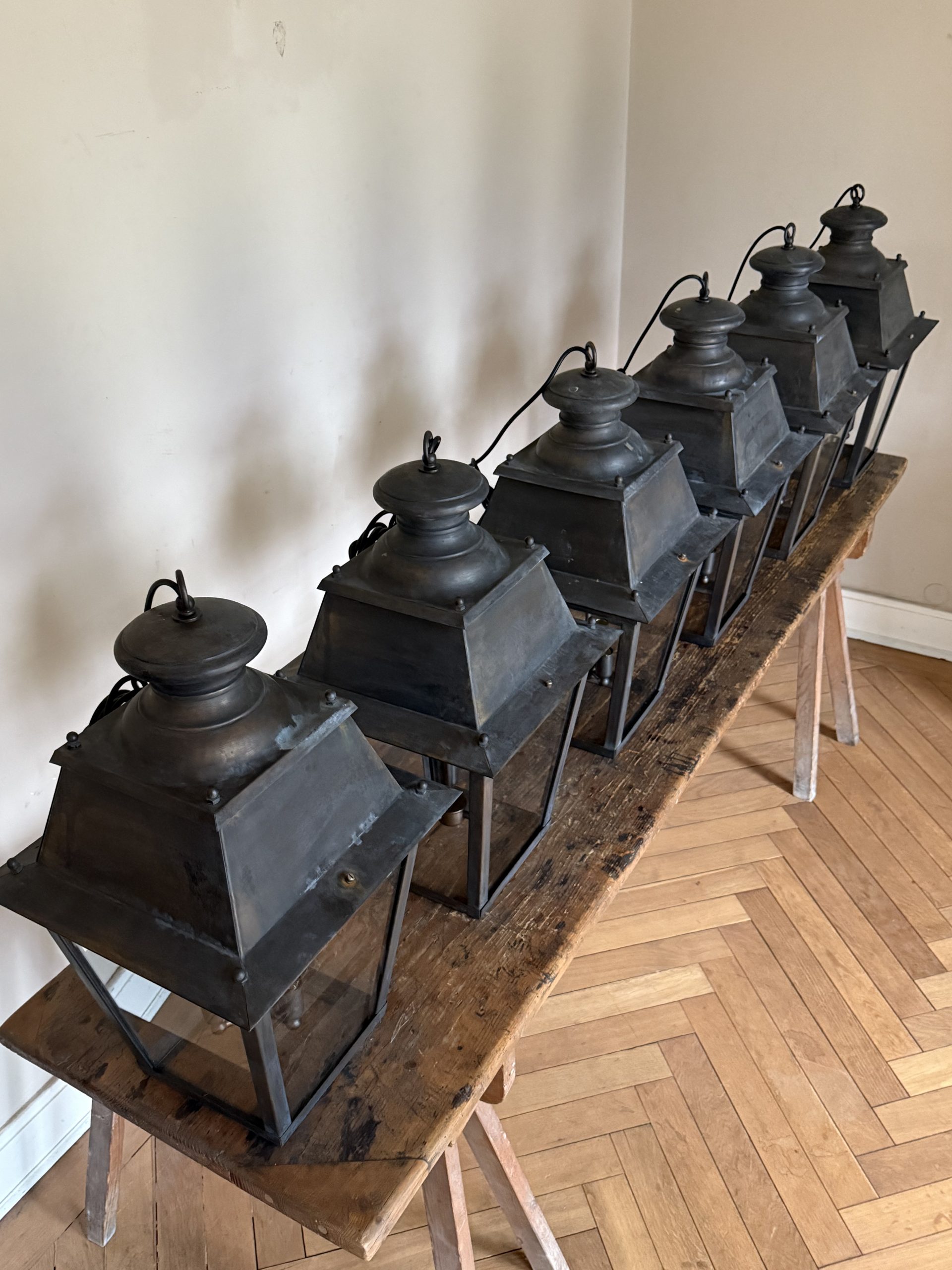 6 matching copper & brass hanging lanterns. Restored & new electrified. The lanterns comes with a 2 meter black chain for hanging and black safety cable. Ready for hanging