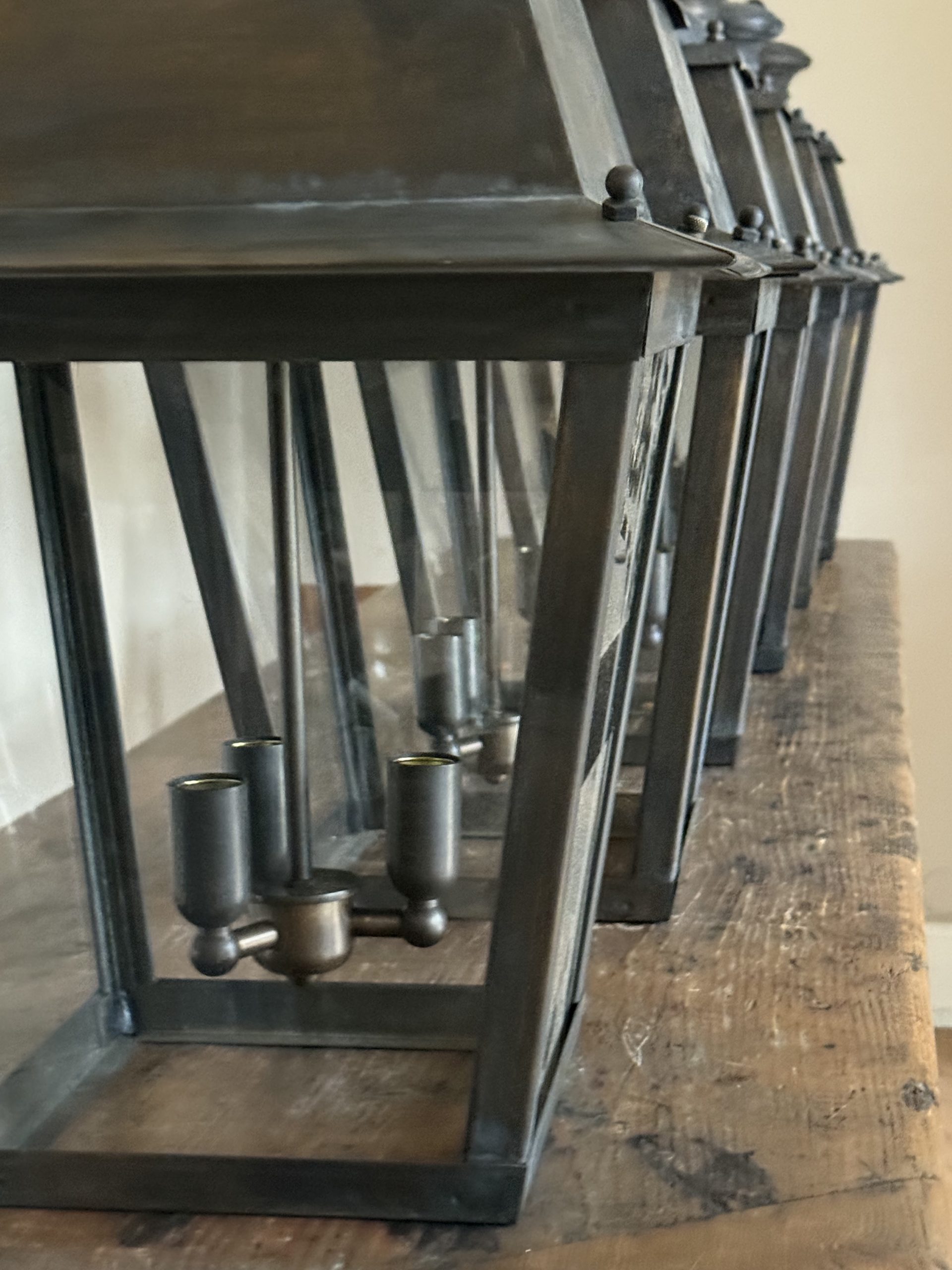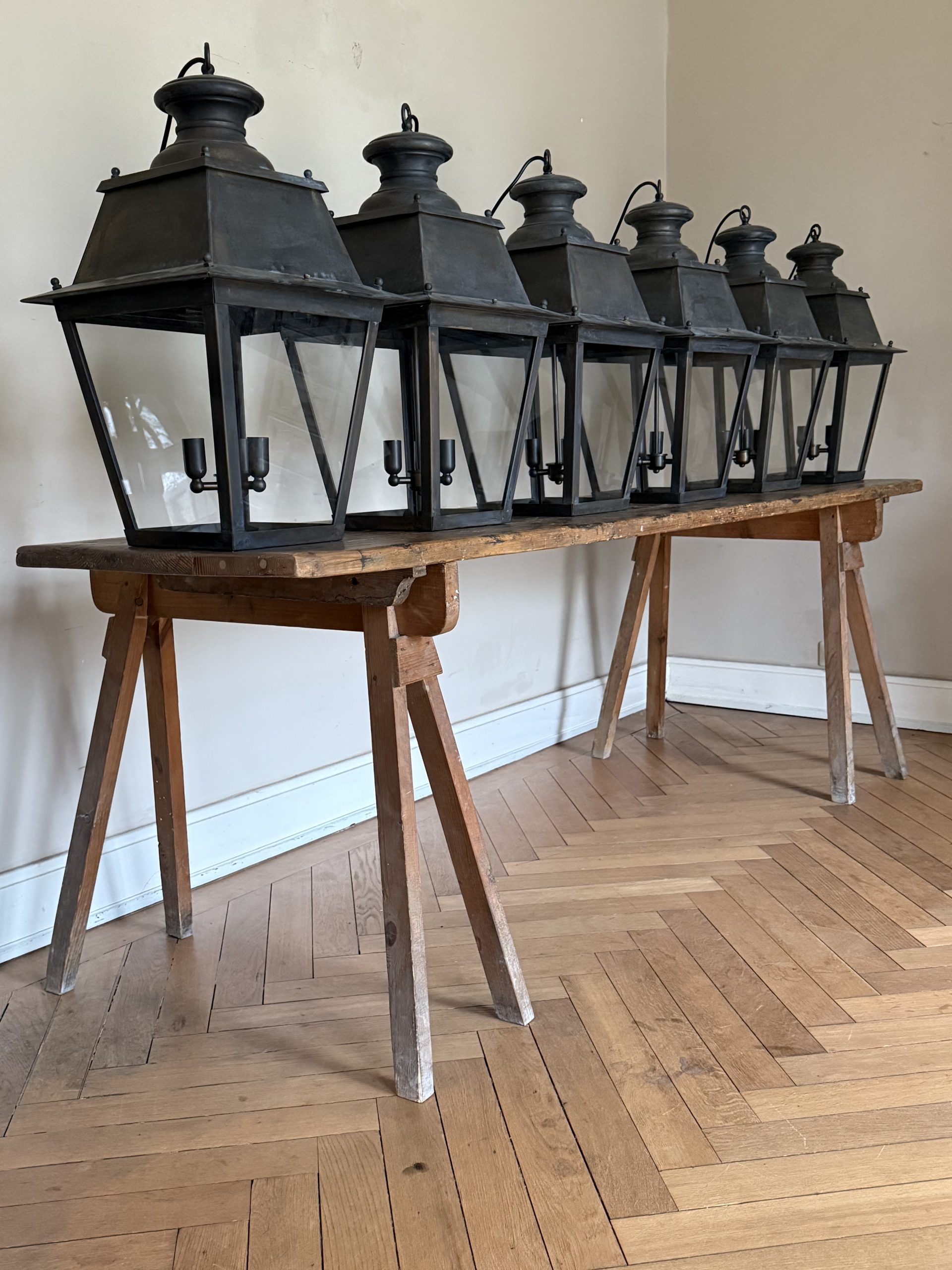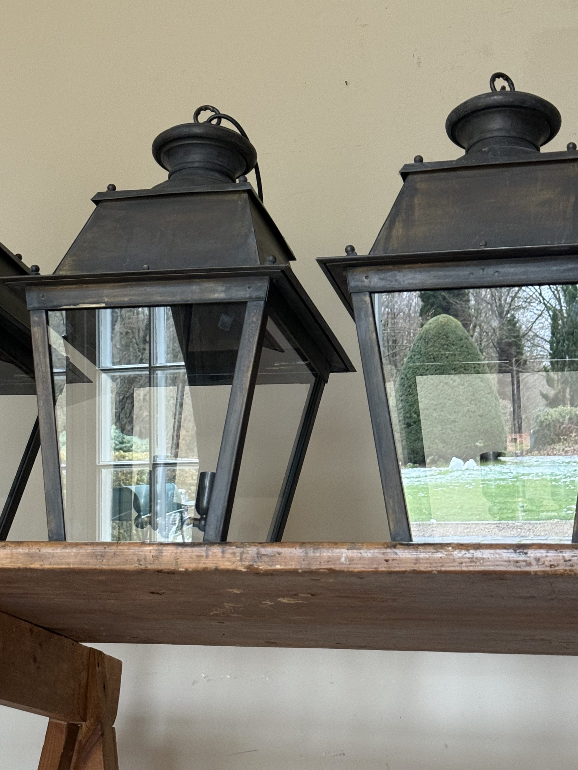 6 matching copper & brass hanging lanterns. Restored & new electrified. The lanterns comes with a 2 meter black chain for hanging and black safety cable. Ready for hanging