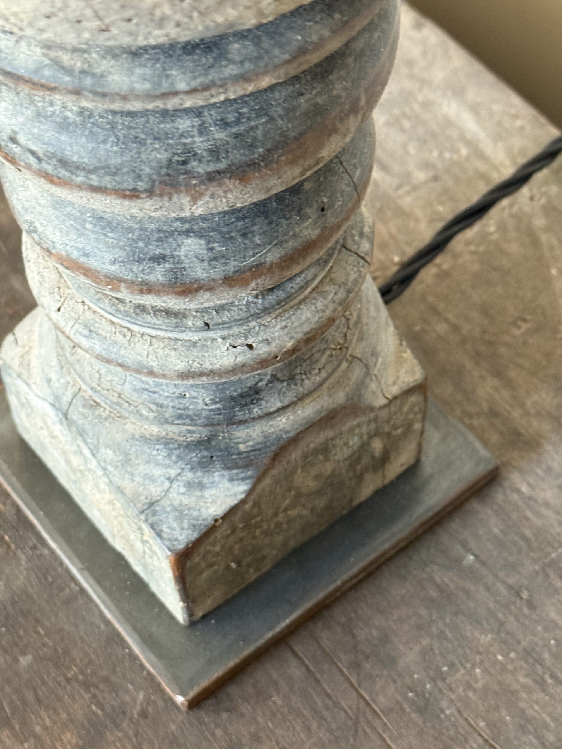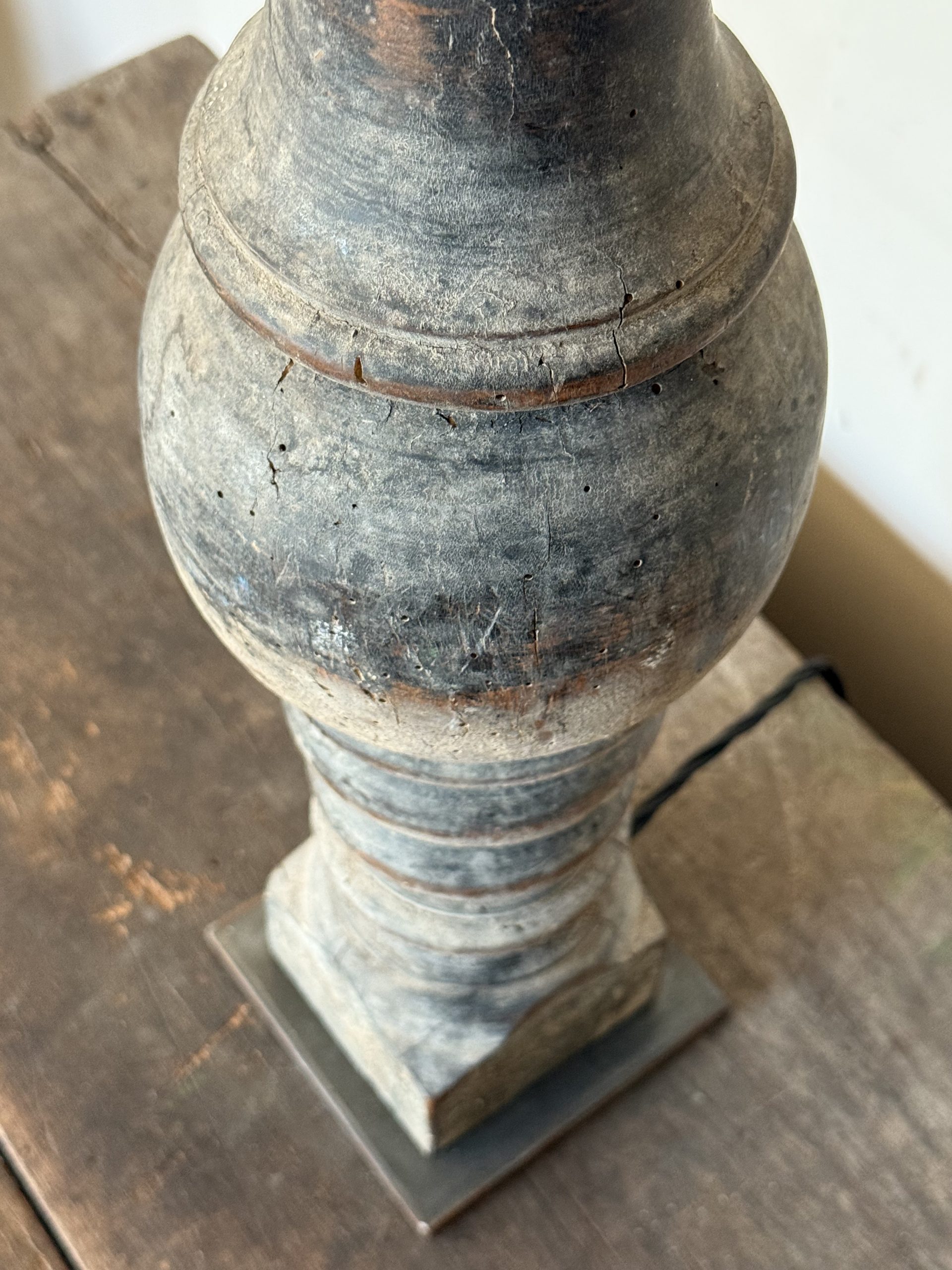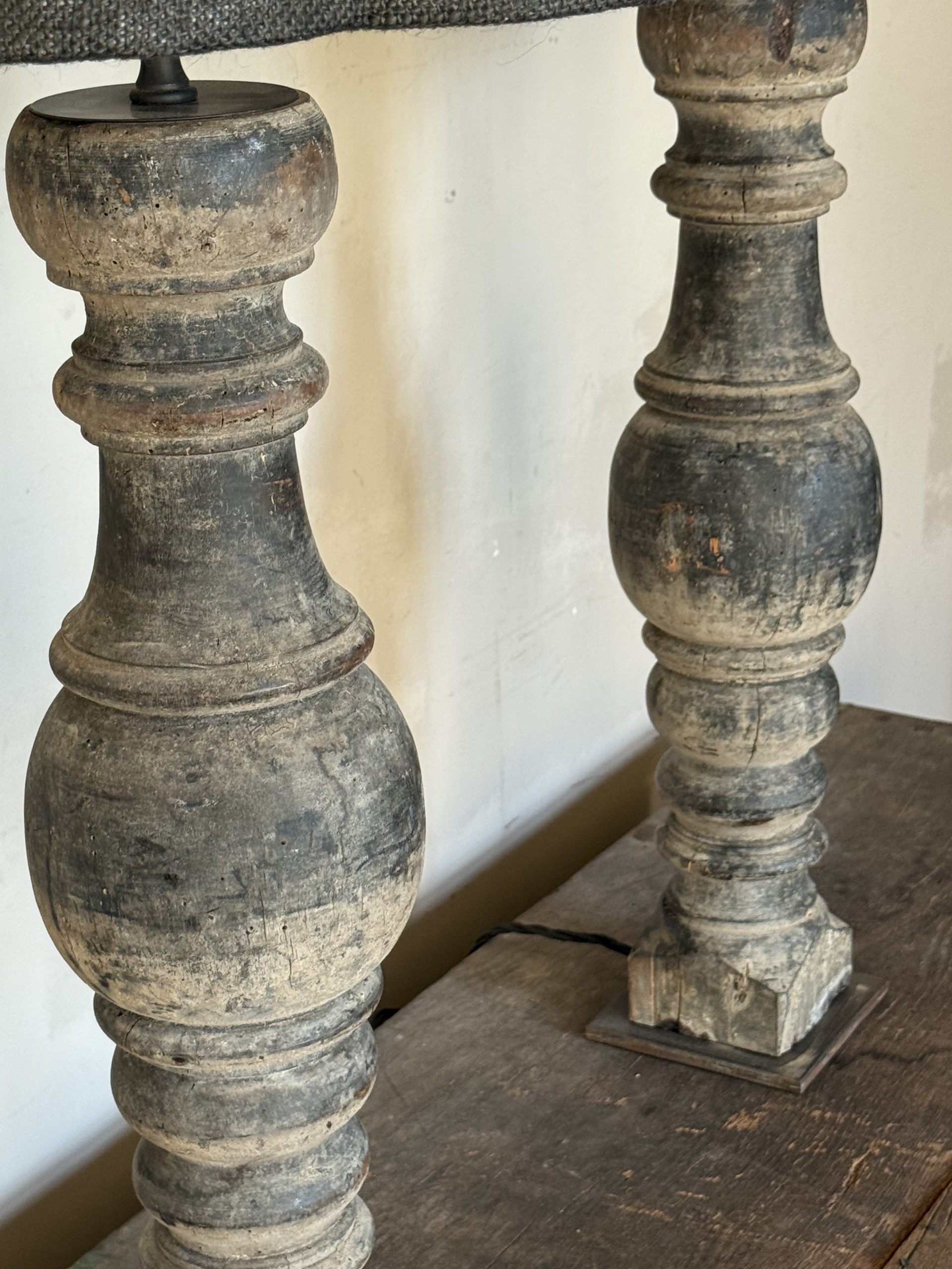 Pair of table lamps made of late renaissance wooden columns from Borgo San Lorenzo near Florence. Turned beech wood columns with a spectacular patina. Hand patinated brass parts, safety fabric cable.