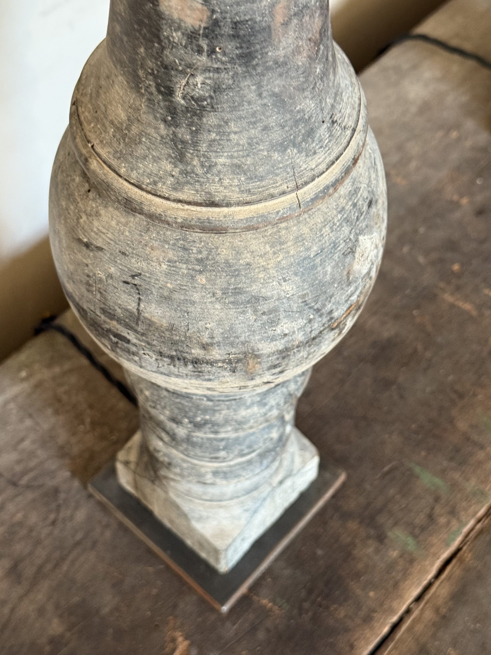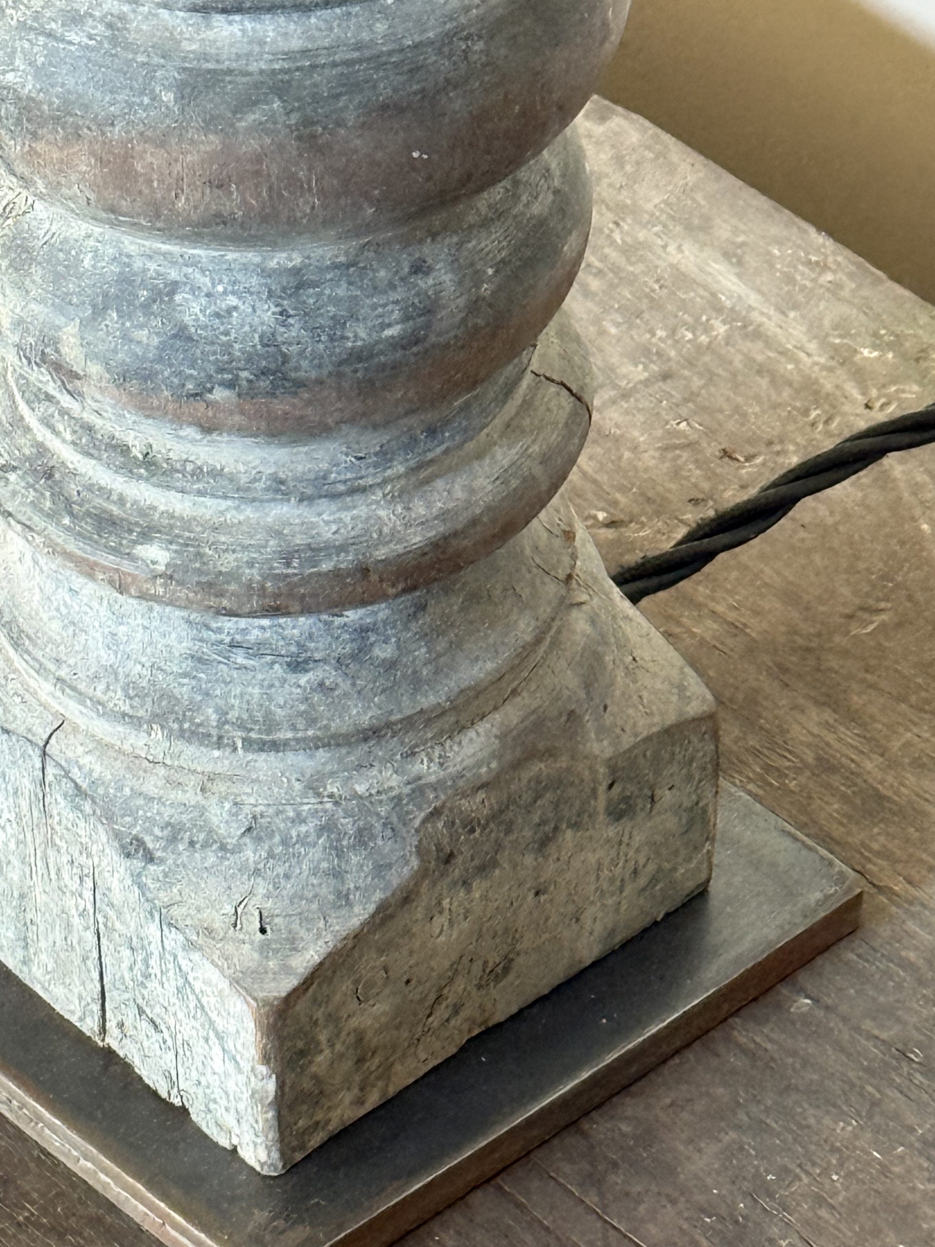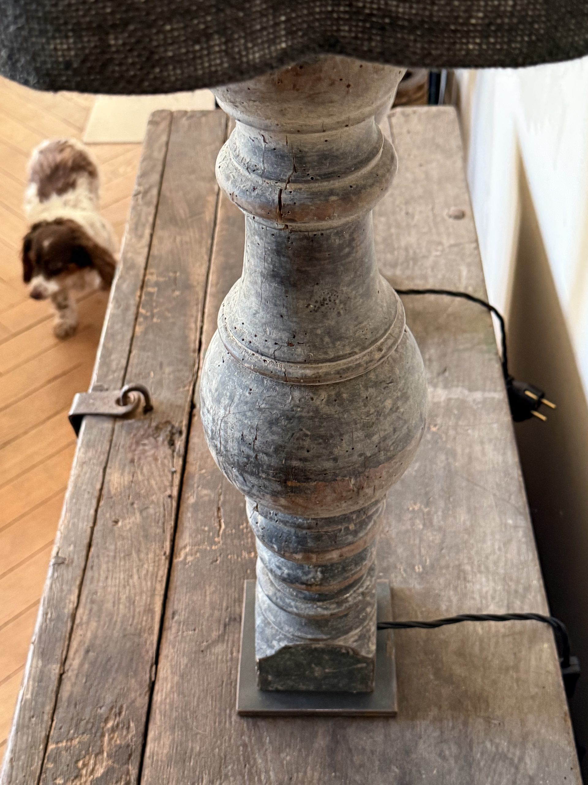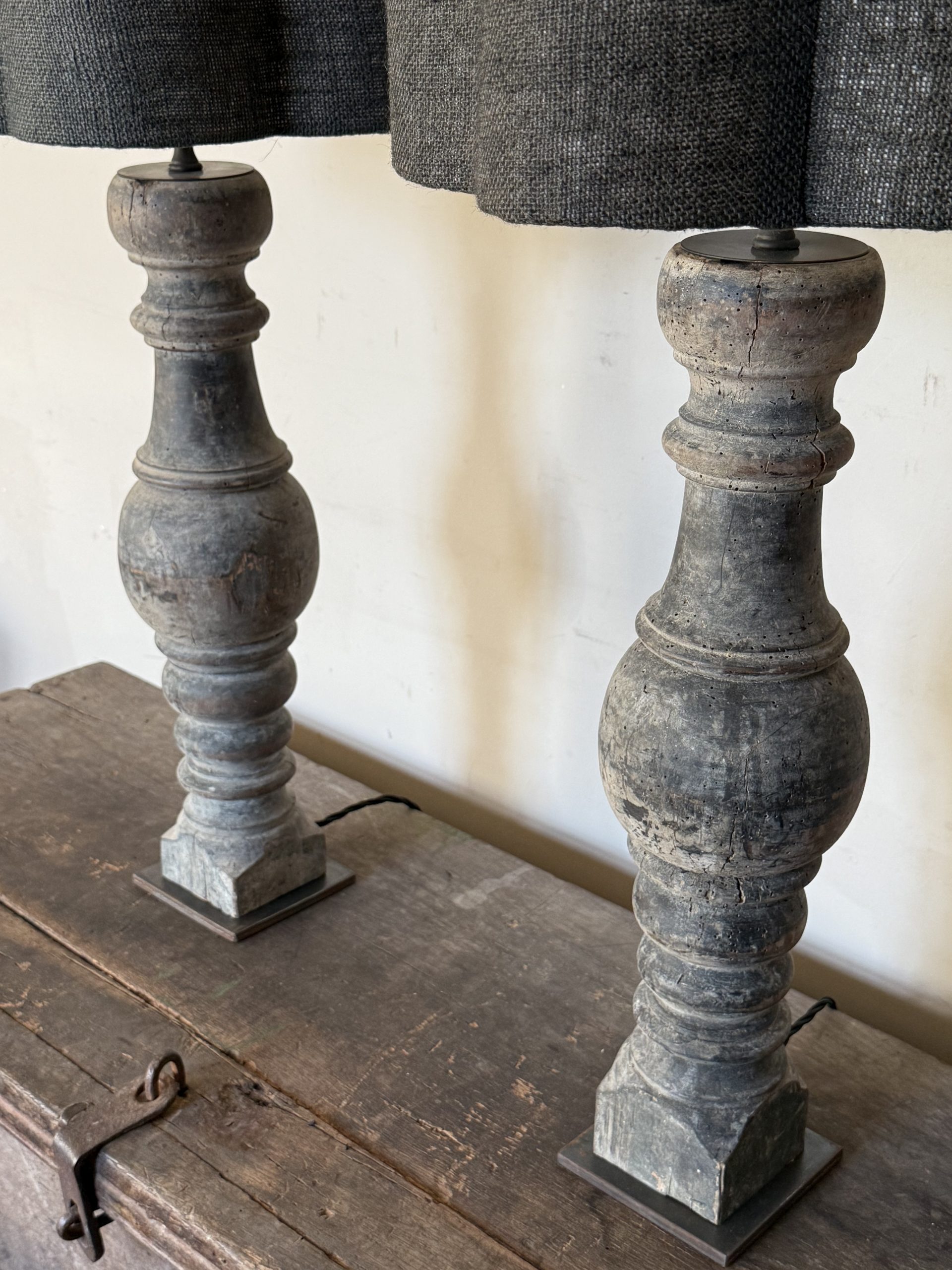 Pair of table lamps made of late renaissance wooden columns from Borgo San Lorenzo near Florence. Turned beech wood columns with a spectacular patina. Hand patinated brass parts, safety fabric cable.