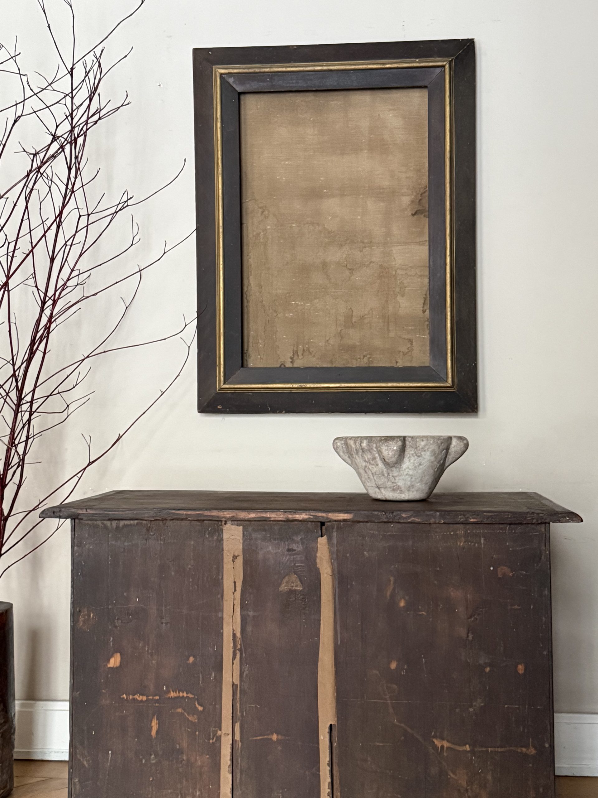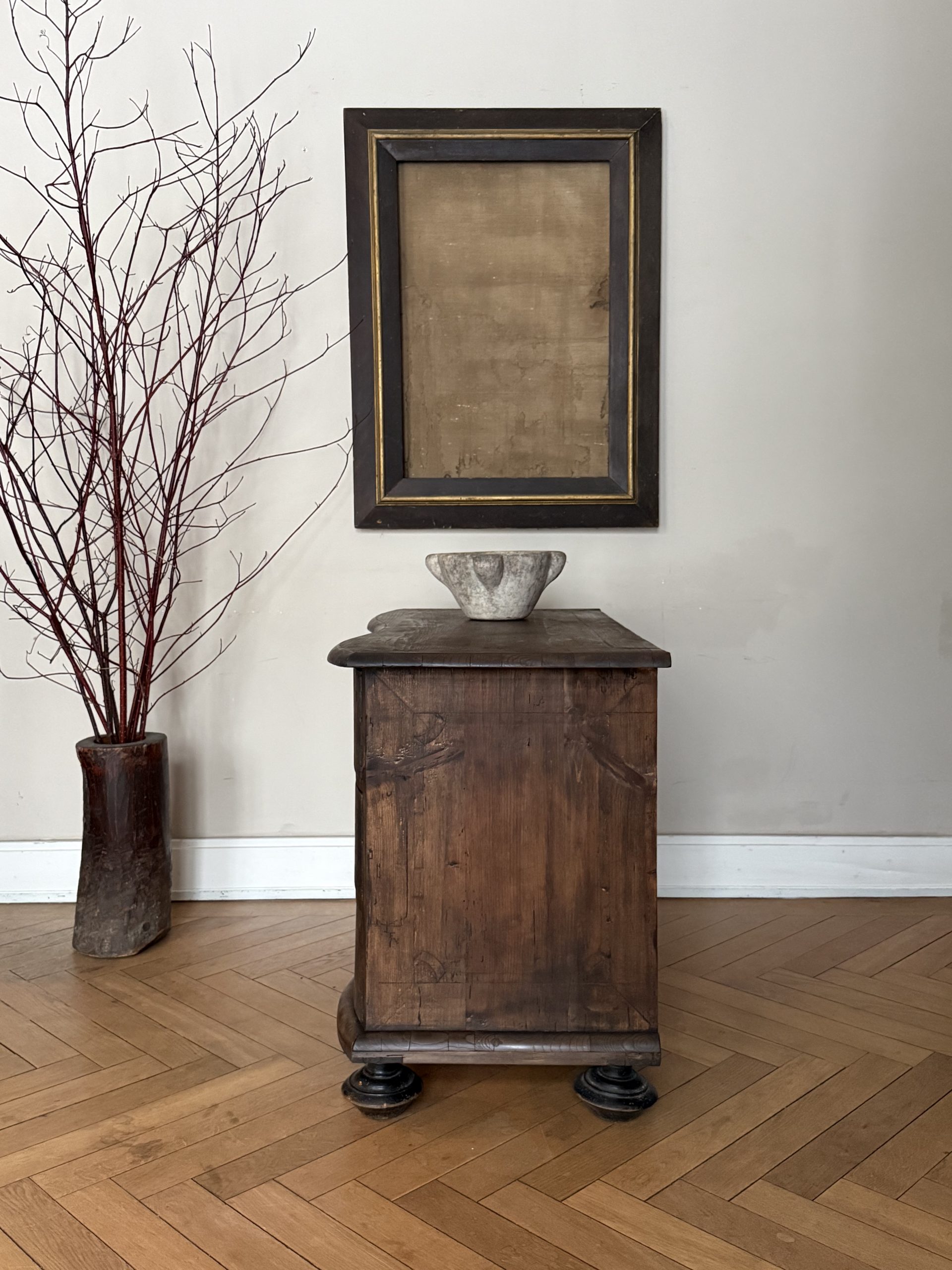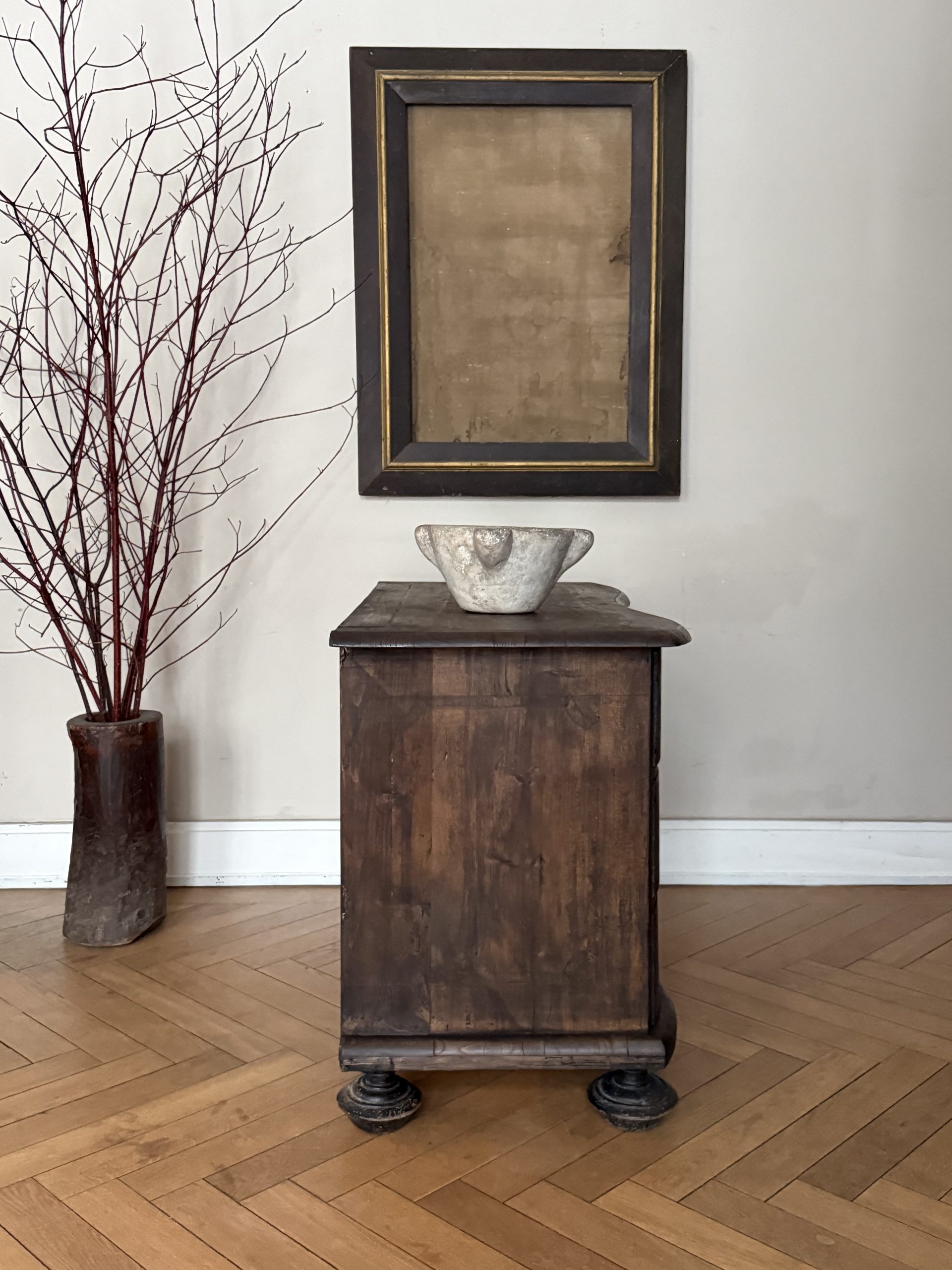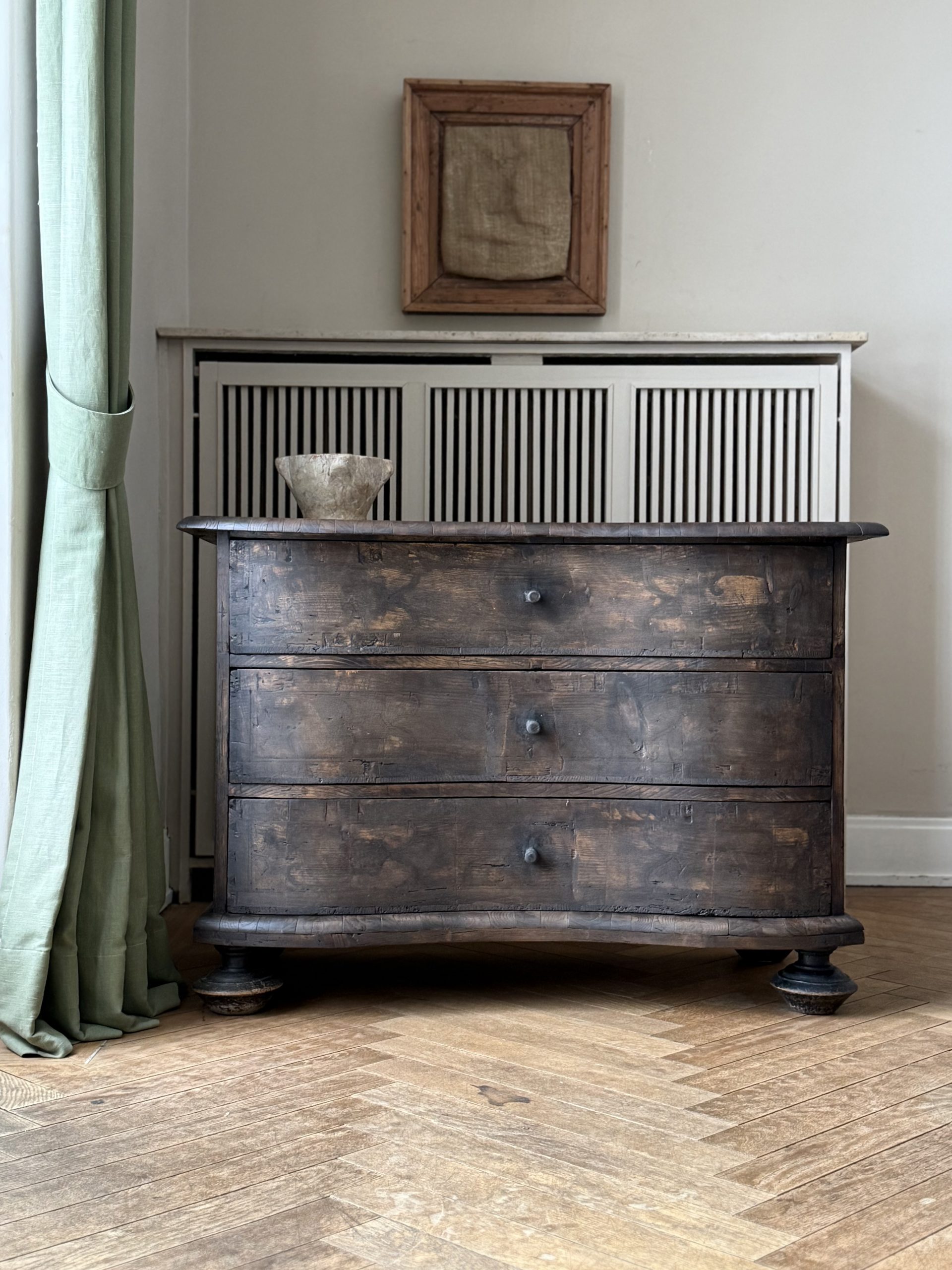 Outstanding ebonized pine & oak baroque dresser. Later wooden knobs. Slightly curved shape and lovely proportions.