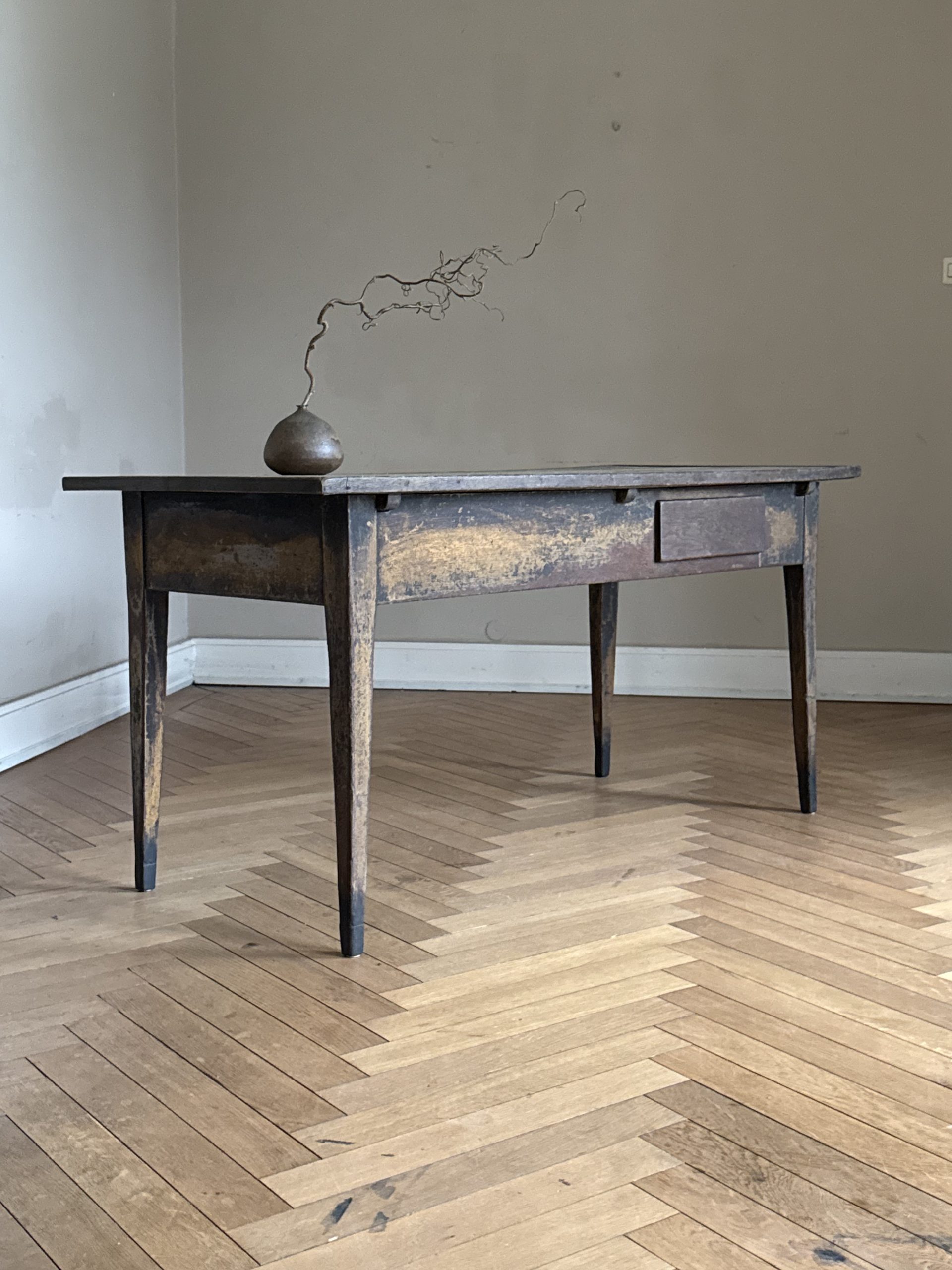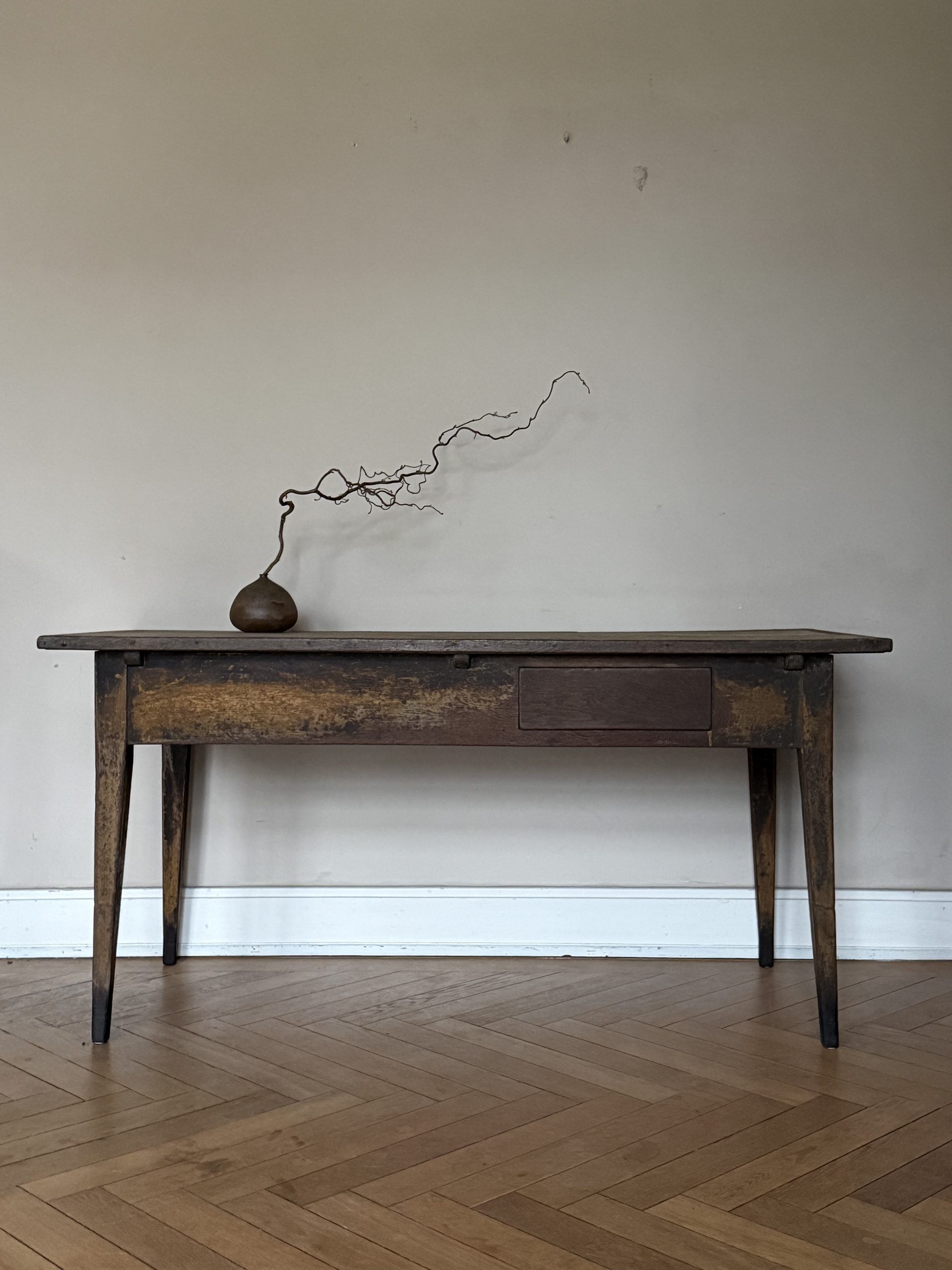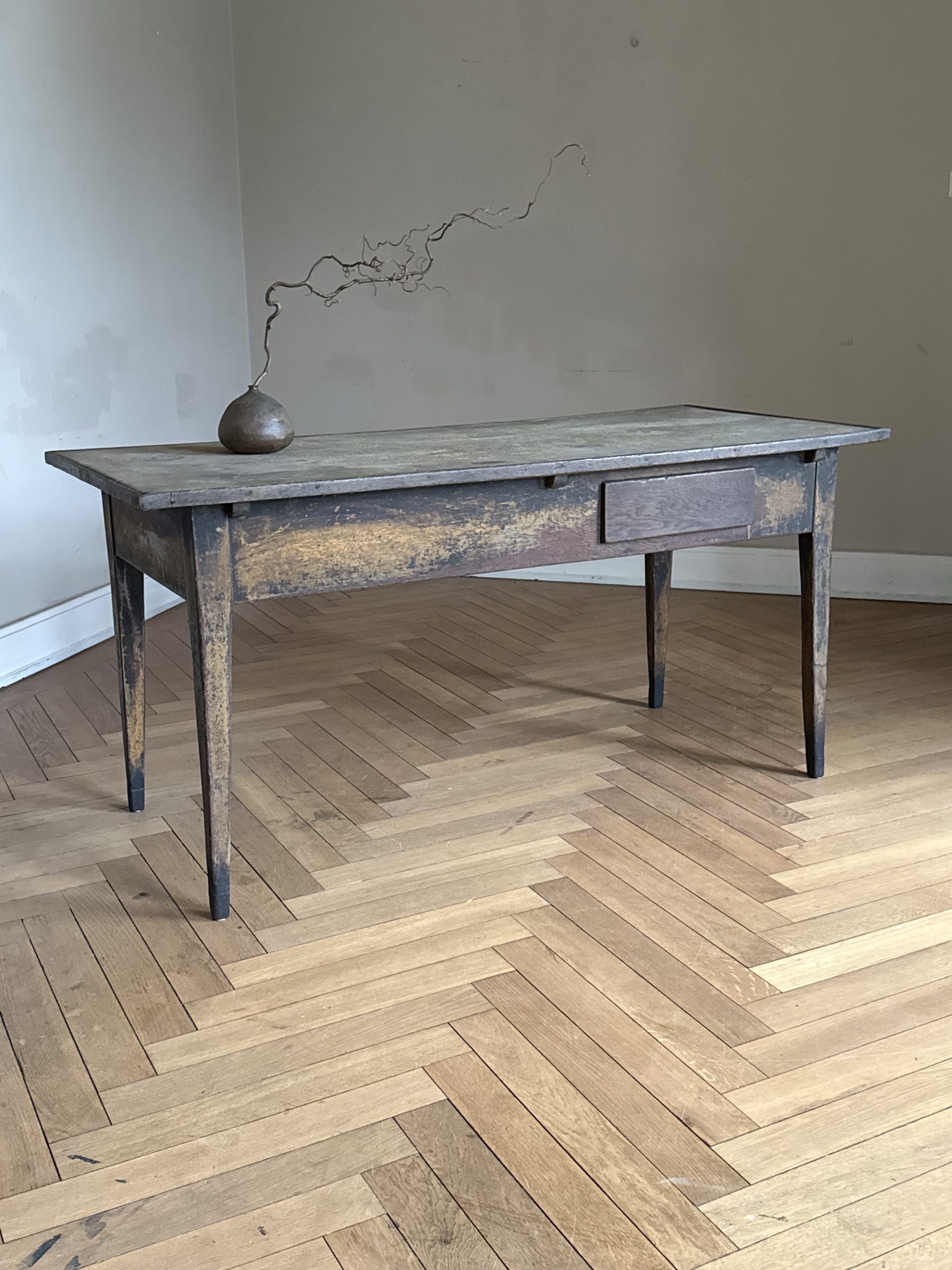 Outstanding late 18th Century painted oak writing table with an incredible patina. The table top shows traces of a previous fabric covering. The drawer opens by pulling from the bottom.