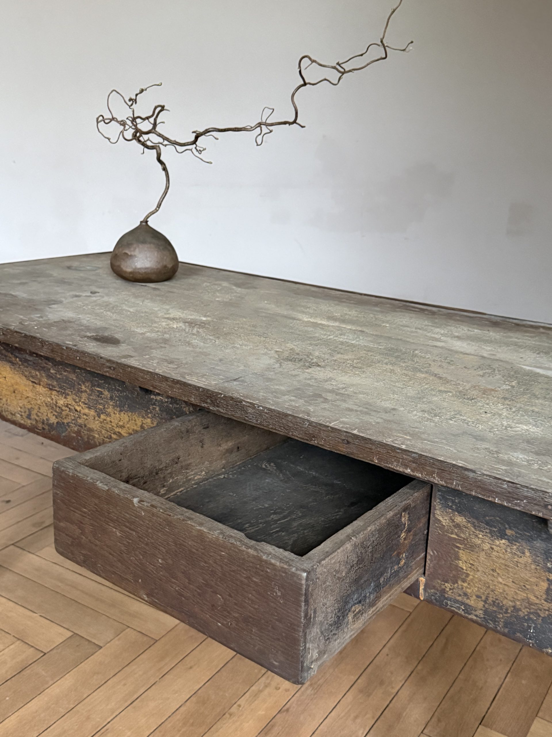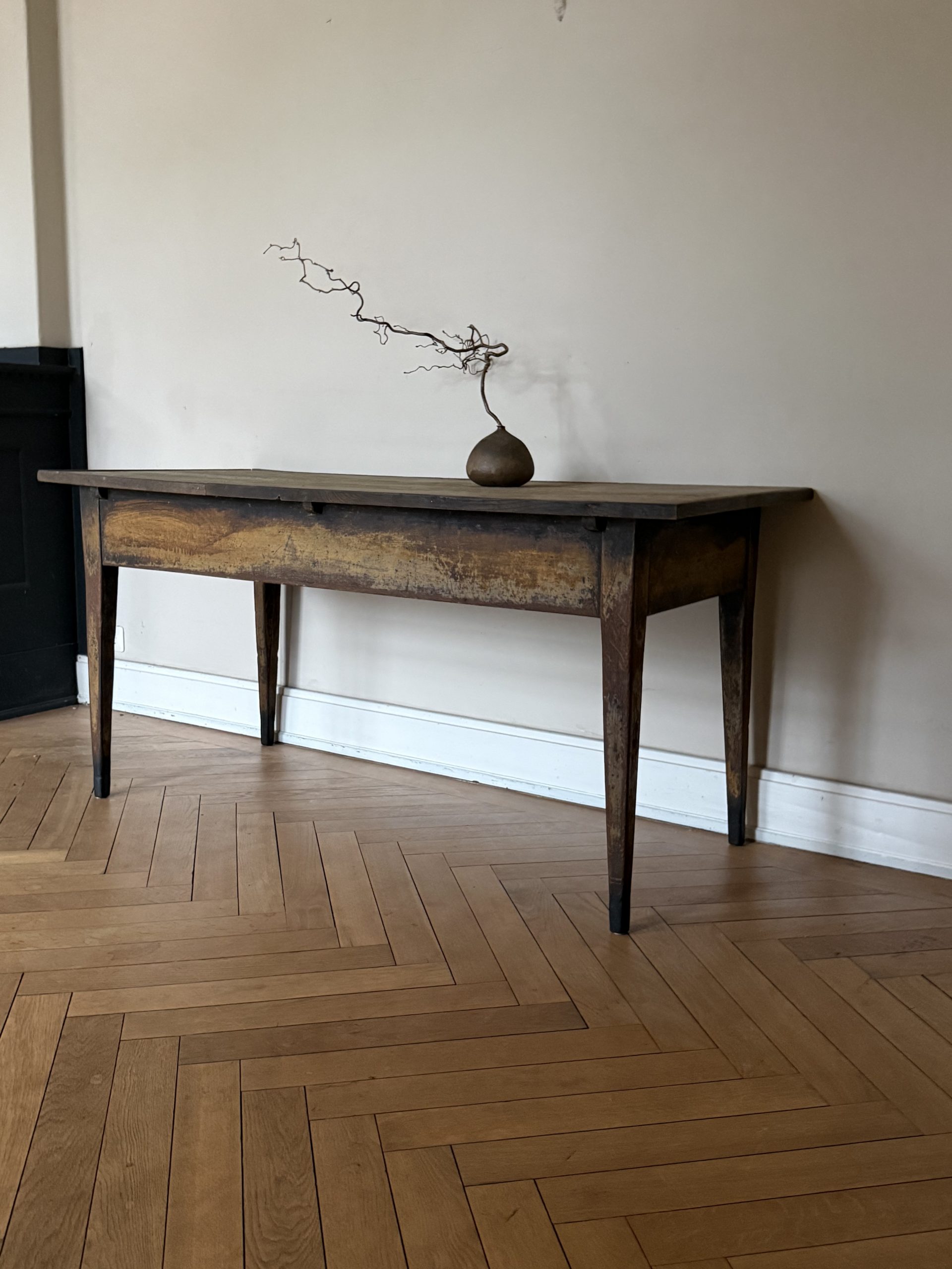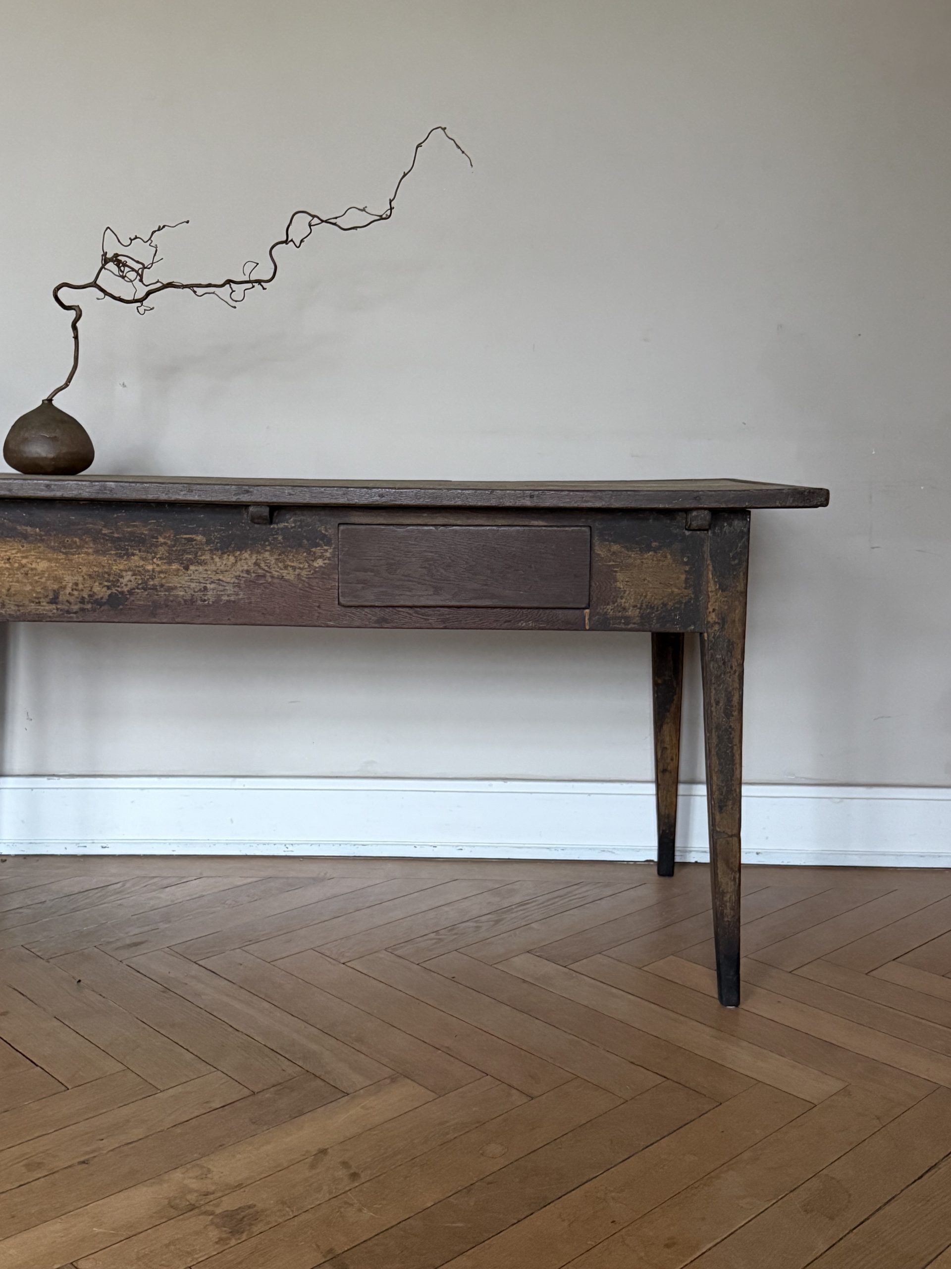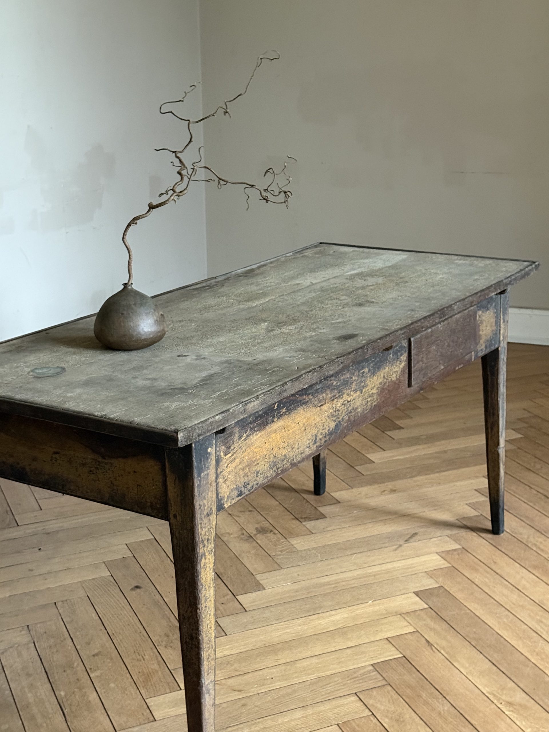 Outstanding late 18th Century painted oak writing table with an incredible patina. The table top shows traces of a previous fabric covering. The drawer opens by pulling from the bottom.